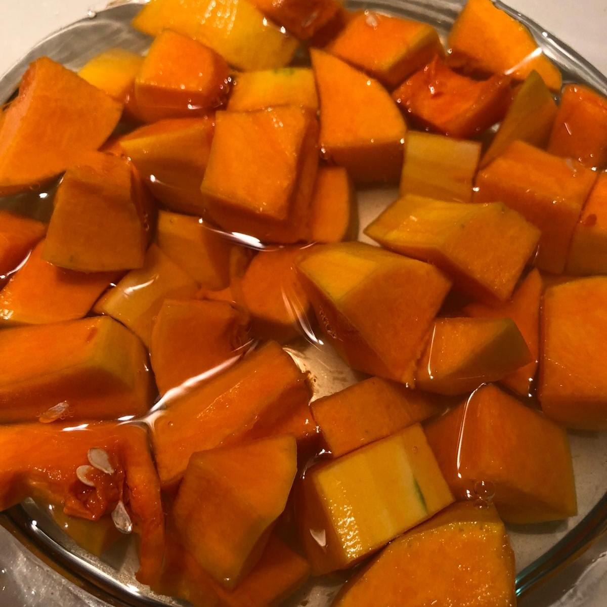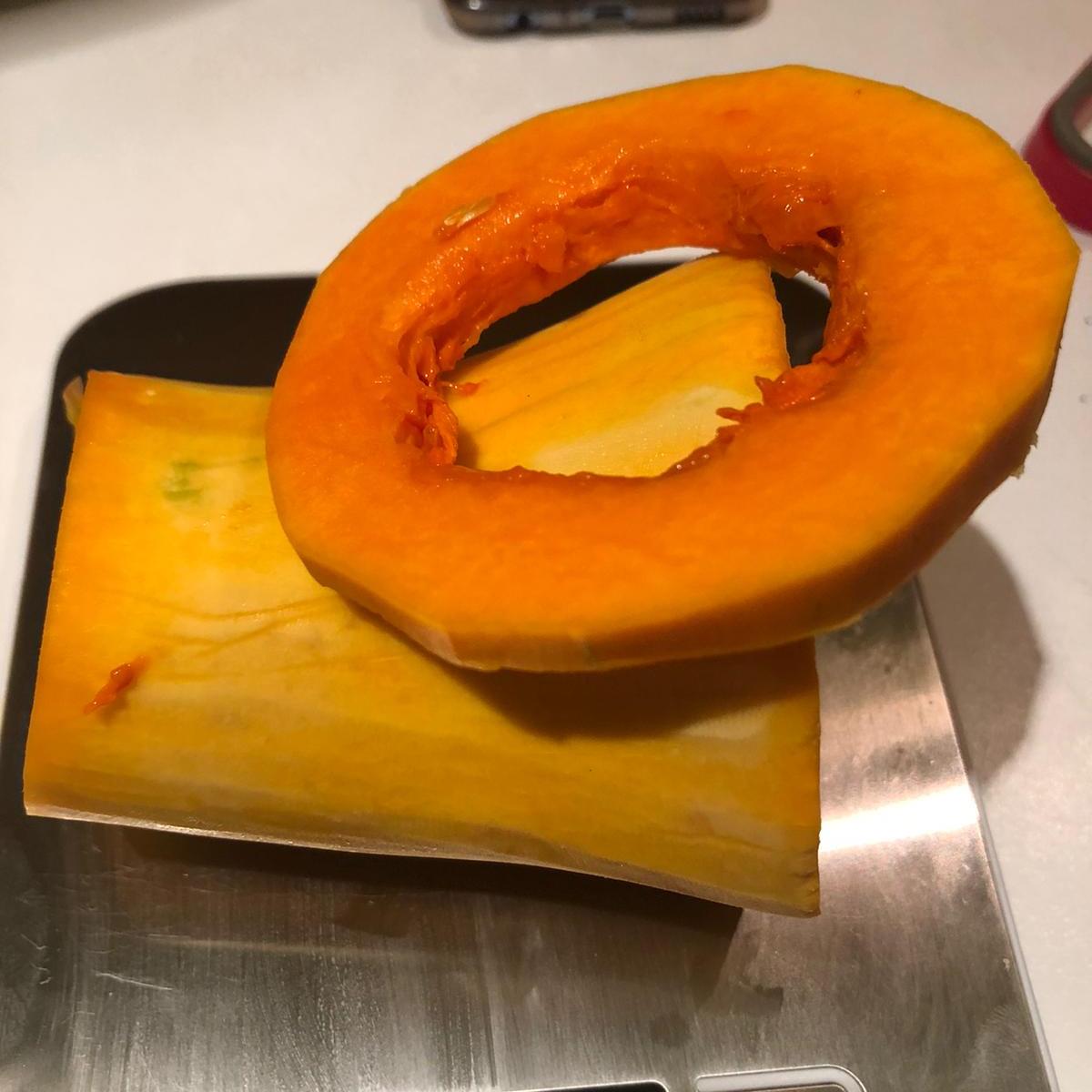 Asar la calabaza. Puedes hacerlo en el microondas. Deja enfriar, retira la pulpa y reserva.