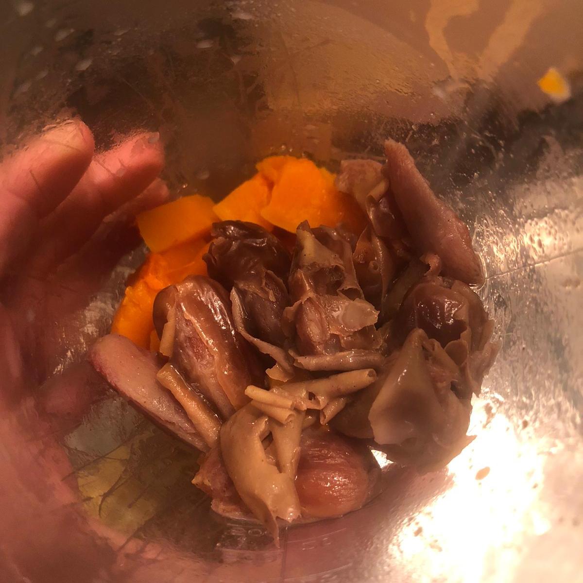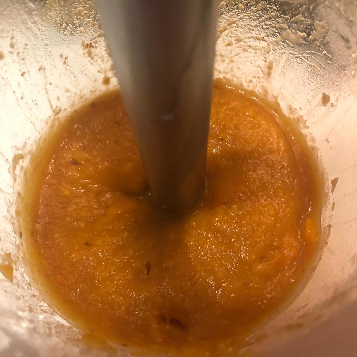 Tras unos 10 minutos, retira el clavo y los dátiles. Pon los dátiles en un vaso de batidora junto con la pulpa de calabaza y tritura bien. Si es necesario, puedes añadir un poco de la leche infusionada para facilitar el trabajo. Una vez hayas obtenido una crema homogénea, añade a la leche y pon a calentar a fuego mínimo.