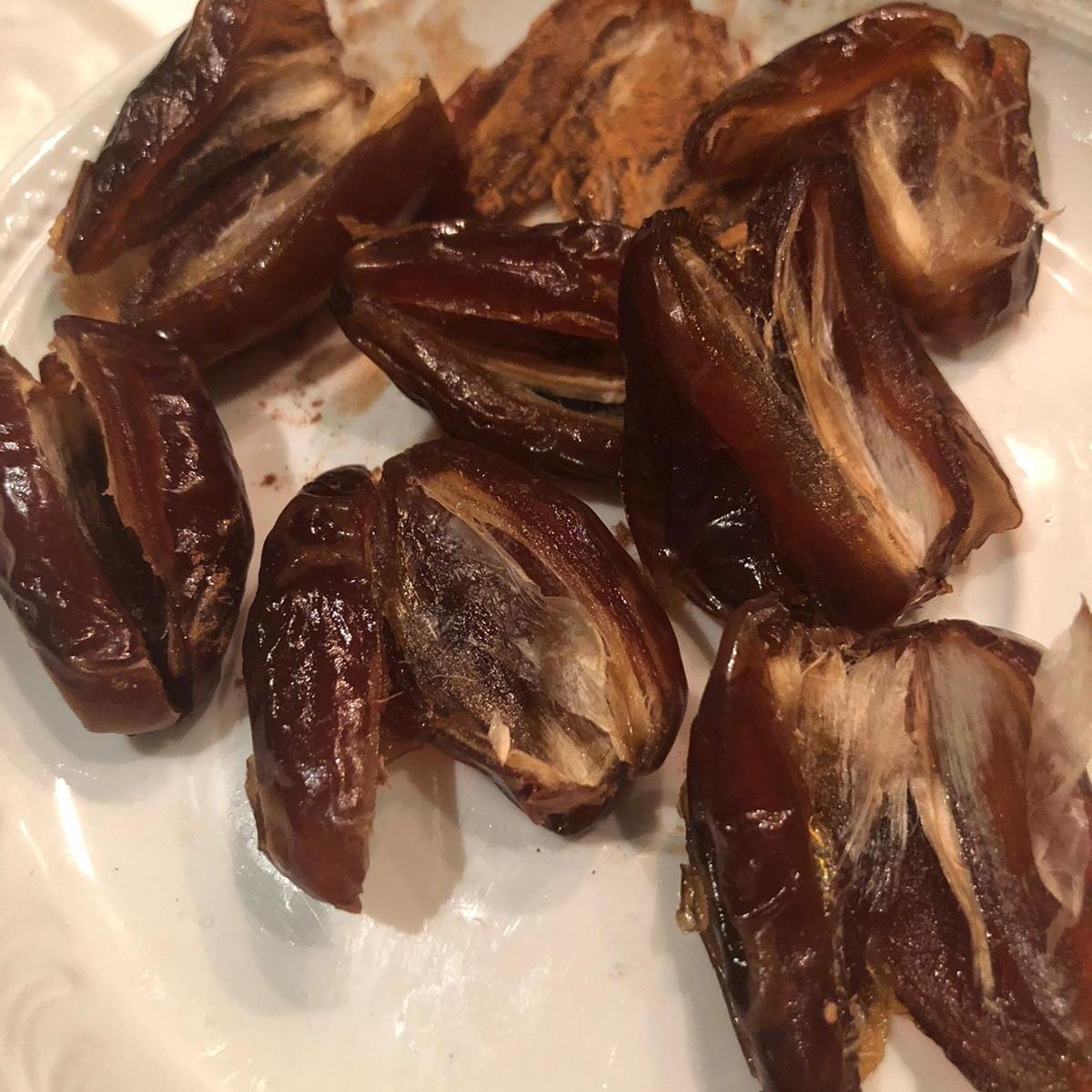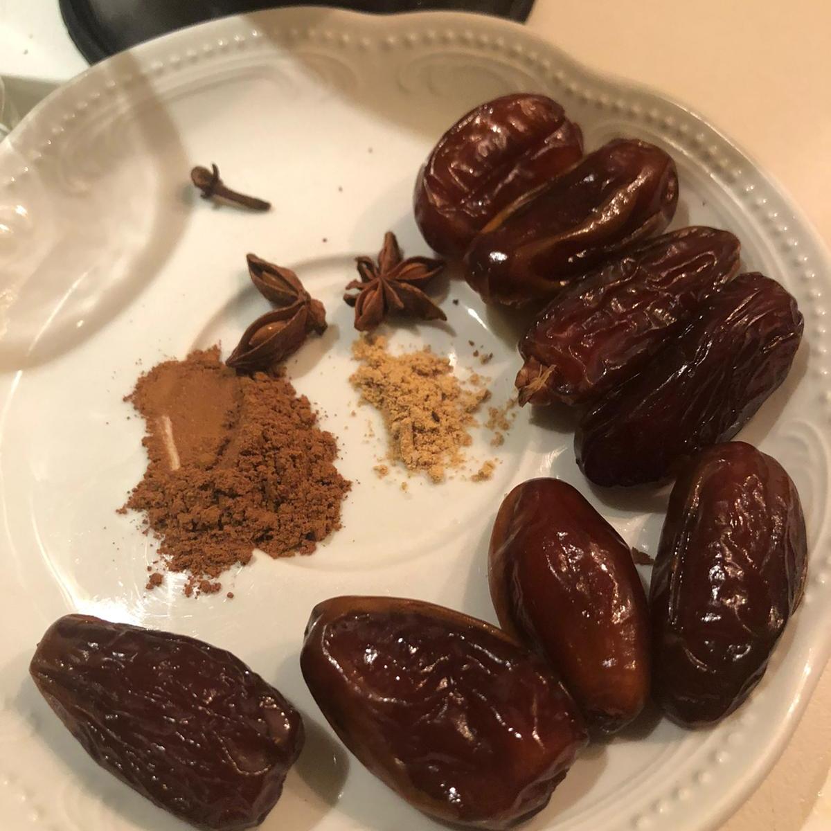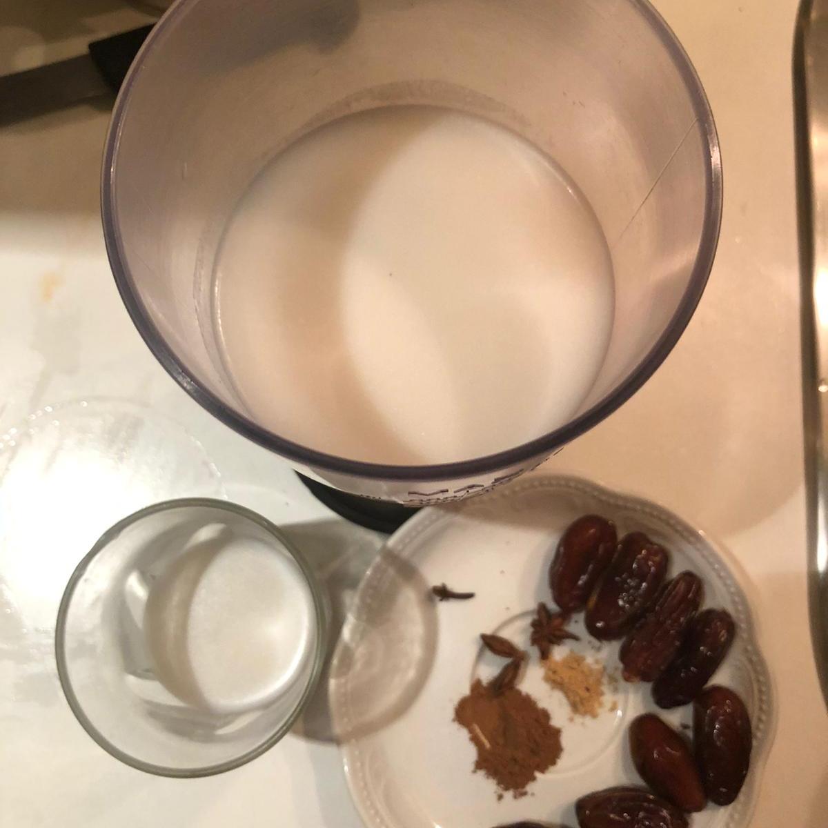 Aparta 50 ml de leche en un vaso y reserva. Mientras tanto, infusiona 700 ml de leche con la canela, el anís y los dátiles deshuesados y cortados a la mitad y el clavo machado con el mortero (puedes ponerlo entero y retirarlo después). Cuece a fuego lento hasta que empiece a hervir. Apaga, cubre con una tapadera y deja templar.