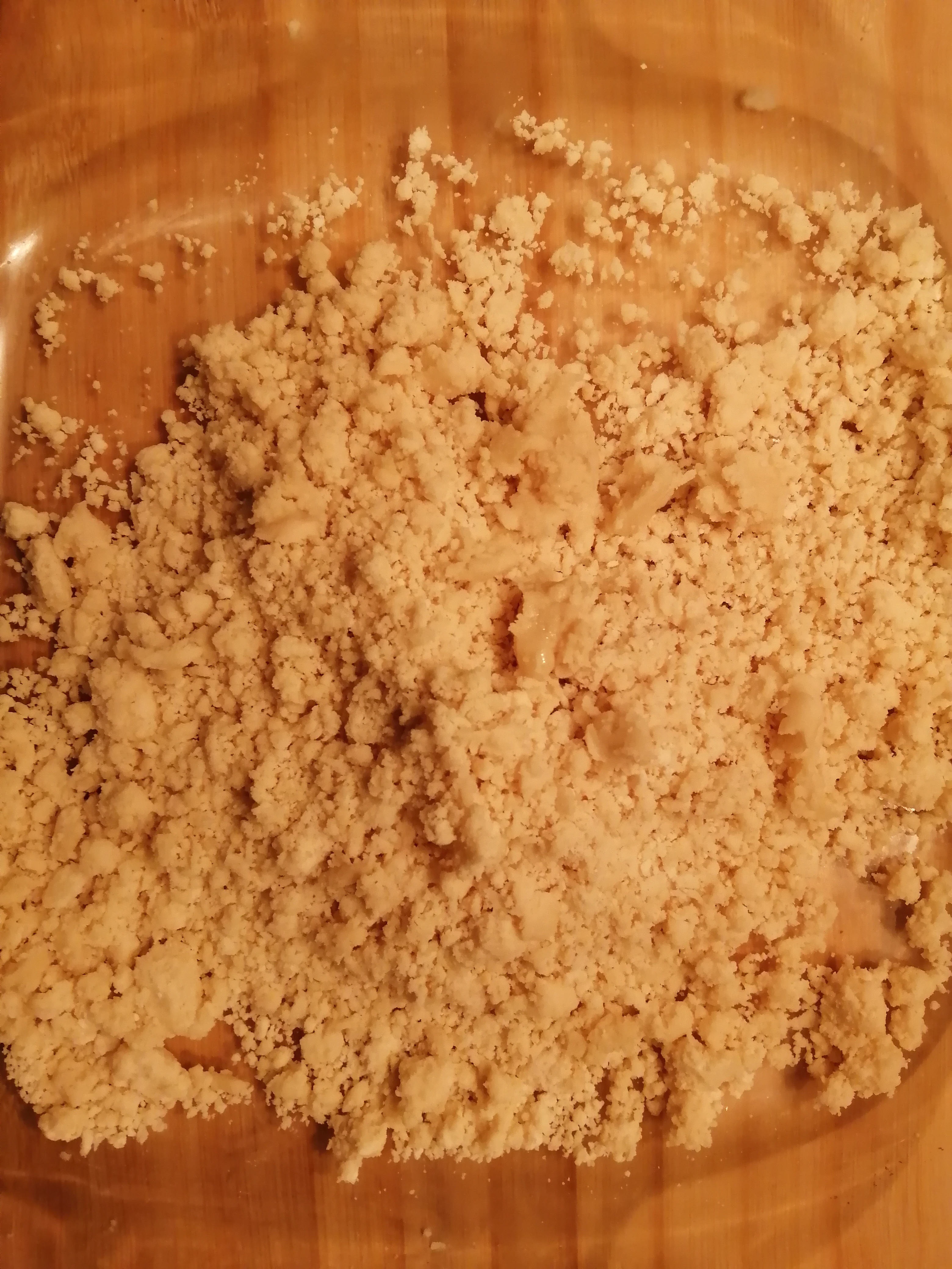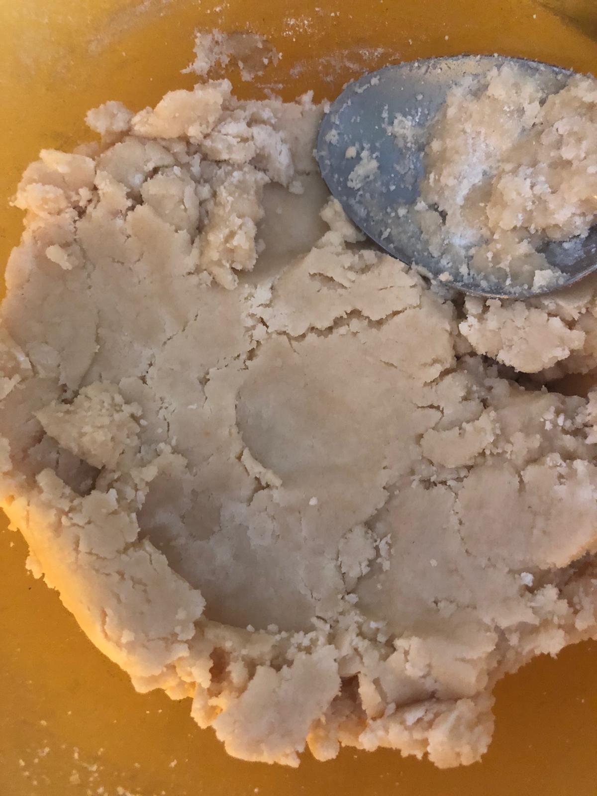 Agrega el aceite de coco en frío (se utilizará como si fuera mantequilla). Córtalo en cuadraditos y ve añadiéndolo a la masa y frotando con las manos. La textura debe ser como arenosa. Haz una bola, sin manipular demasiado y envuelve en papel film. Deja en el frigo durante 30 minutos.