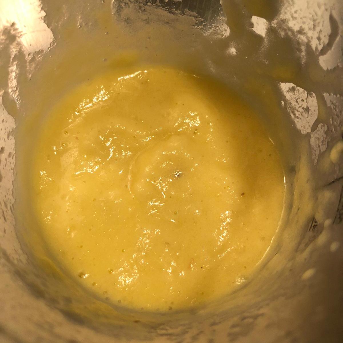 Prepara la crema. Retira la piel de la piña, trocea y vierte en el baso de la batidora junto con el azúcar (si la piña está muy madura no haría falta). Bate hasta obtener un puré fine. Pon este puré a calentar en un cazo a fuego medio.