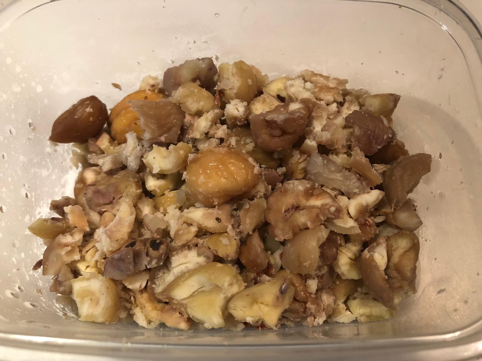 Lo primero que haremos será pelar las castañas. Lava las castañas con agua fría. Haz un corte en la cáscara, lo suficientemente profundo como para cortar la piel de dentro. Pon agua a hervir en una cazuela y añade las castañas. Cuece por unos 20 – 25 minutos y retira del fuego. Antes de que lleguen a enfriarse del todo, retira la cáscara (de lo contrario te costará muchísimo). Cuece las castañas en agua limpia durante otros 20 minutos (*).