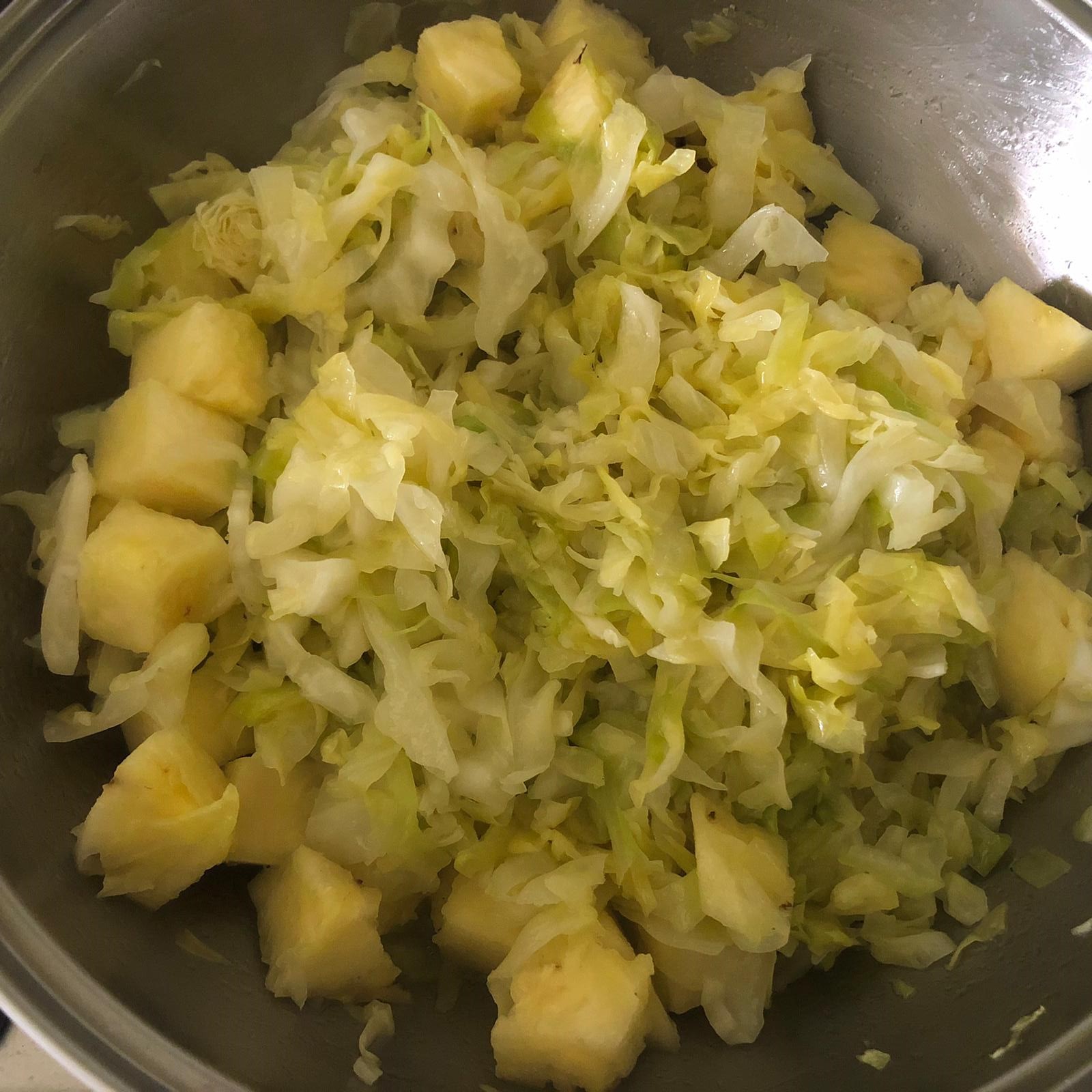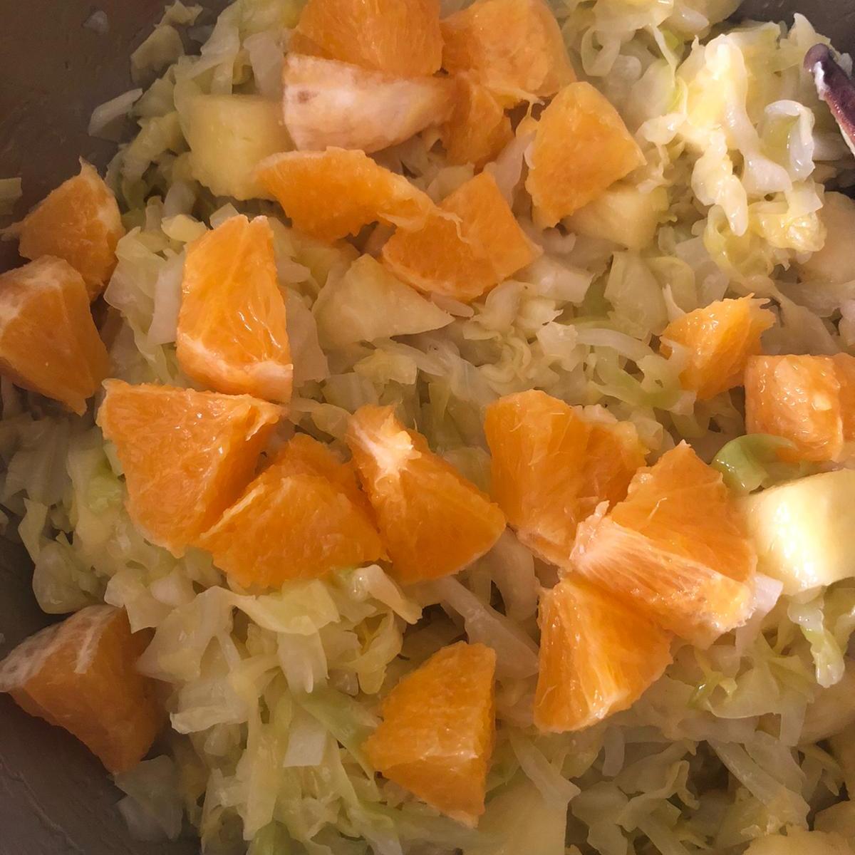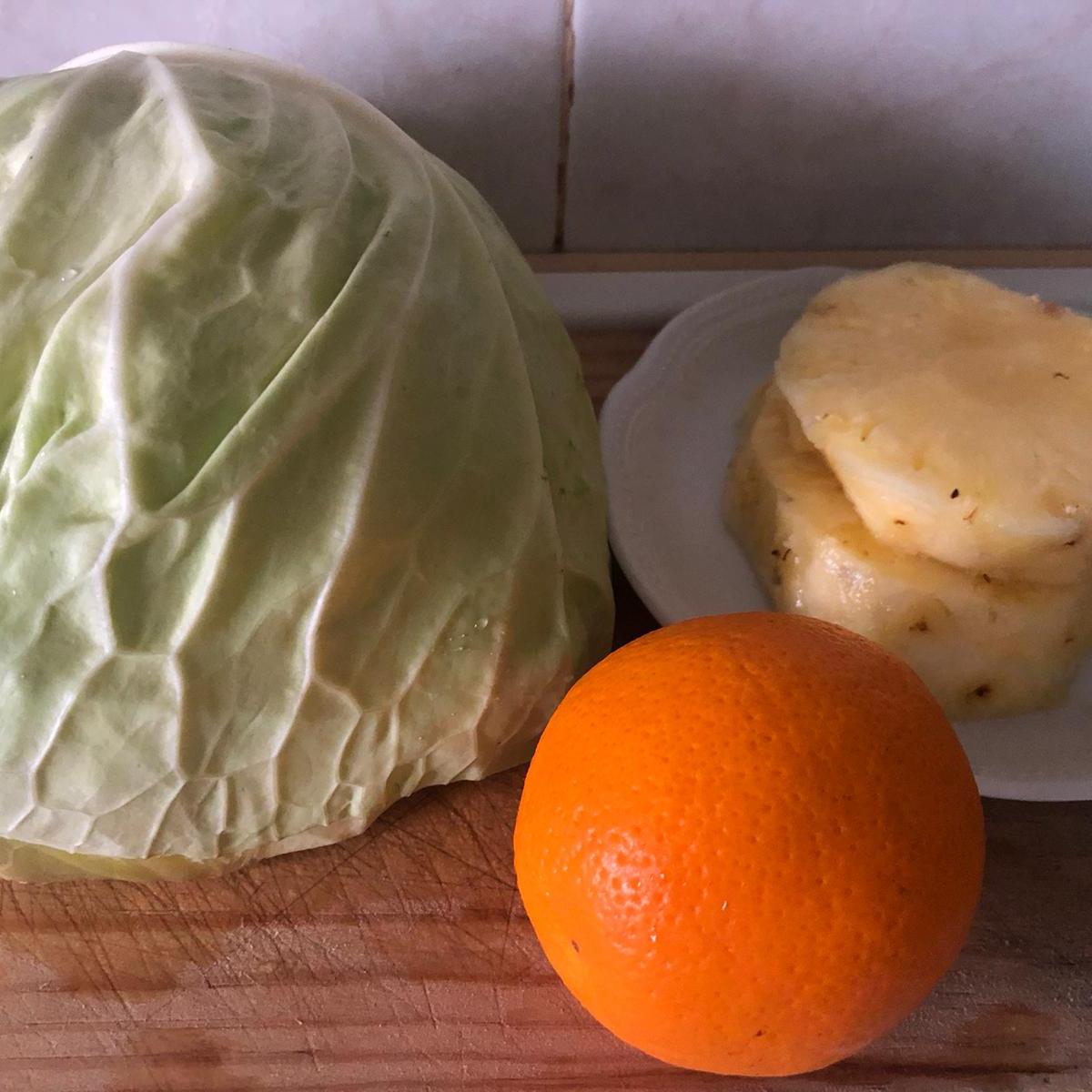 En una sartén un poco honda, cubre el fondo con aceite y rehoga el repollo a fuego lento, dejando que se cocine en su propio jugo. Cuando el repollo esté tierno, salpimenta, añade la naranja y cocina durante unos 4-5 minutos. Añade la piña y cocina otros 5 minutos, dejando que se mezclen todos los sabores.