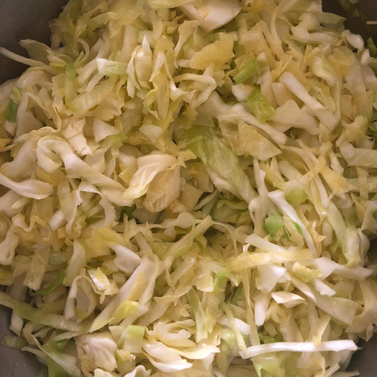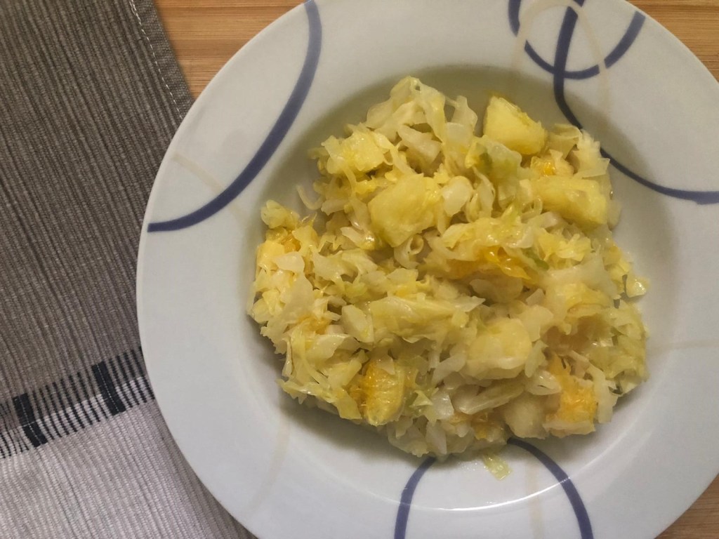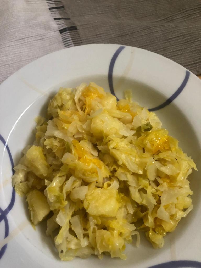 Se trata de una “ensalada templada” de repollo, picado finamente y cocinado en su propio jugo. Se añaden los cítricos y, por último, unos taquitos de queso y se deja fundir un poco. De verdad, está riquísimo, aunque ya hace mucho tiempo que lo hago sin queso. Os animo a probarla y que me contéis vuestras impresiones.