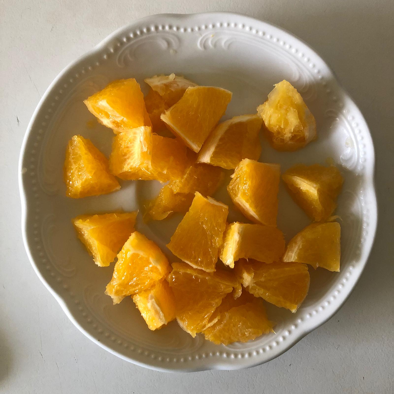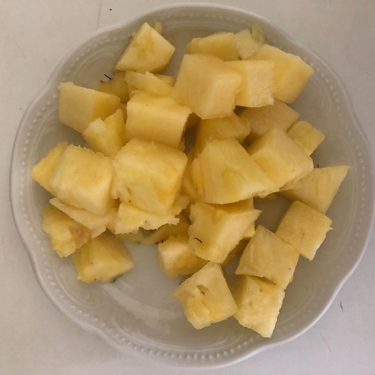 Lava y corta el repollo en tiras finas. Pela las naranjas, retira la parte blanca y corta en cubos. Pela y corta la piña en cubos. Reserva.