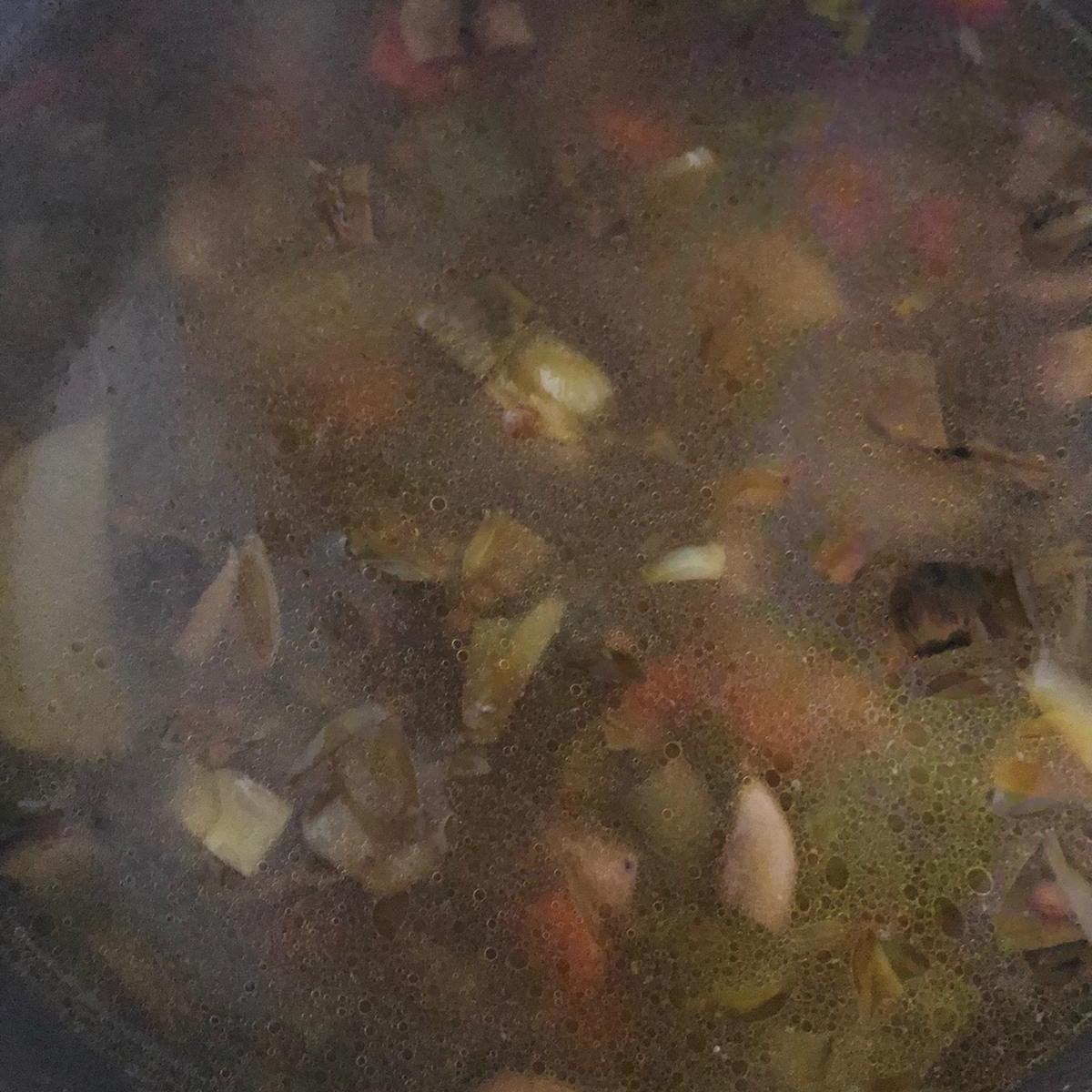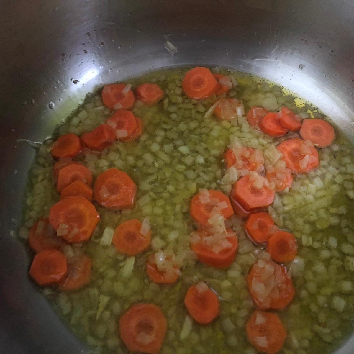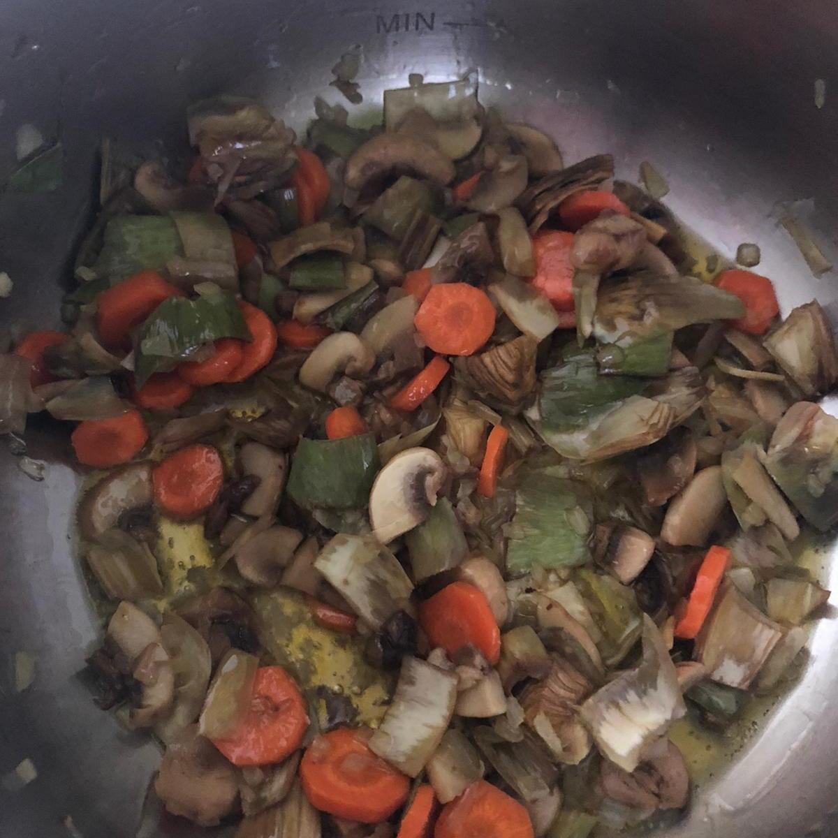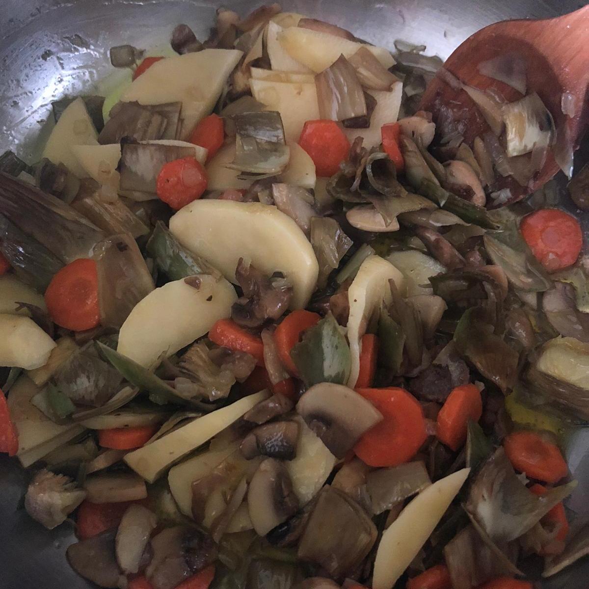 Una vez listas las verduras pon un poco de aceite en una cazuela (o la olla rápida) y sofríe la cebolla a fuego medio. Tras unos minutos, agrega las zanahorias y los champiñones. Por último, añade las alcachofas y las patatas.