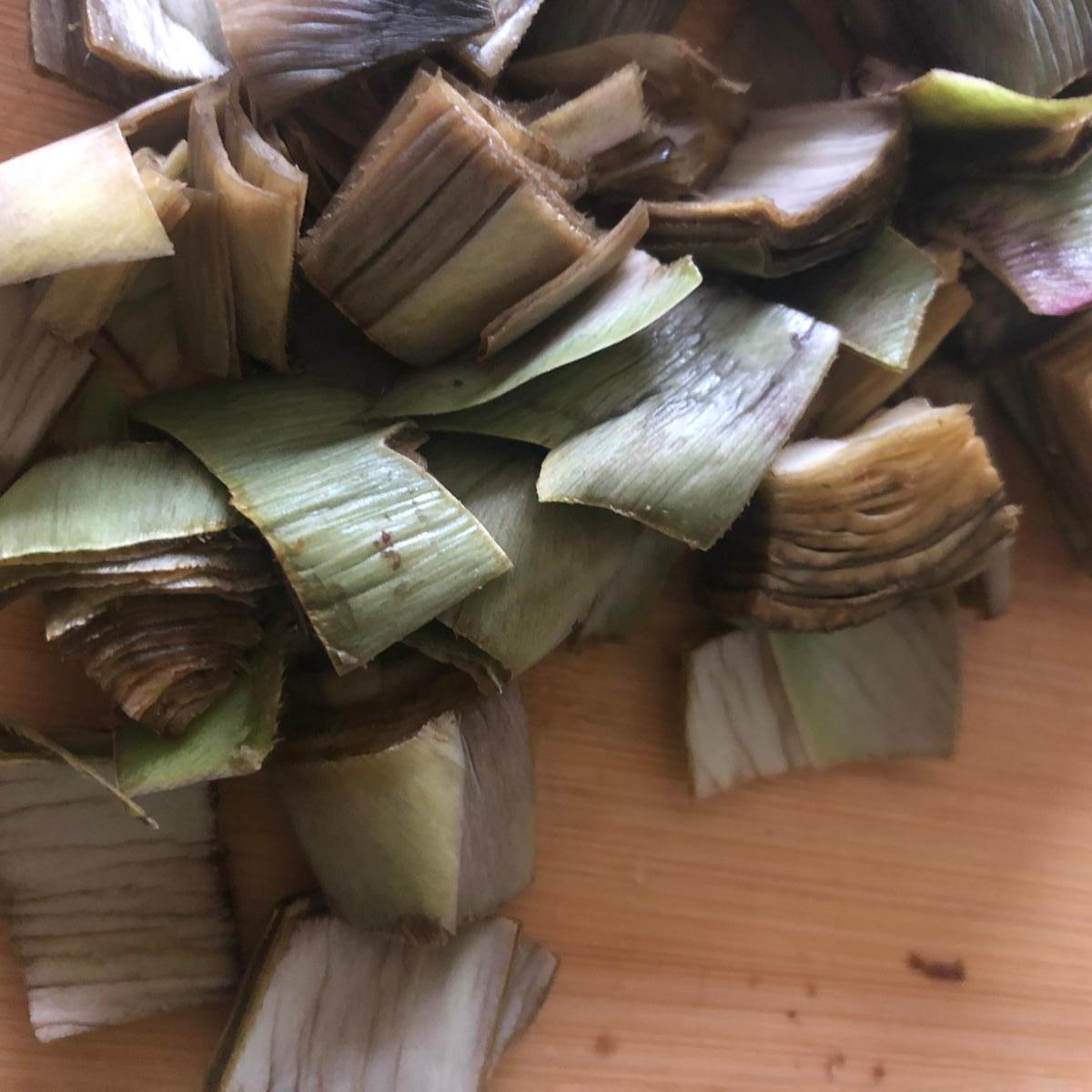 Pica la cebolla en brunoise. Pela y corta la zanahoria en rodajas. Lava los champiñones y corta en láminas. Limpia las alcachofas, quitando las hojas externas (elimina las hojas hasta llegar a la parte tierna), corta las puntas y la base. Trocea en octavos. Pela la patata y córtala en láminas.
