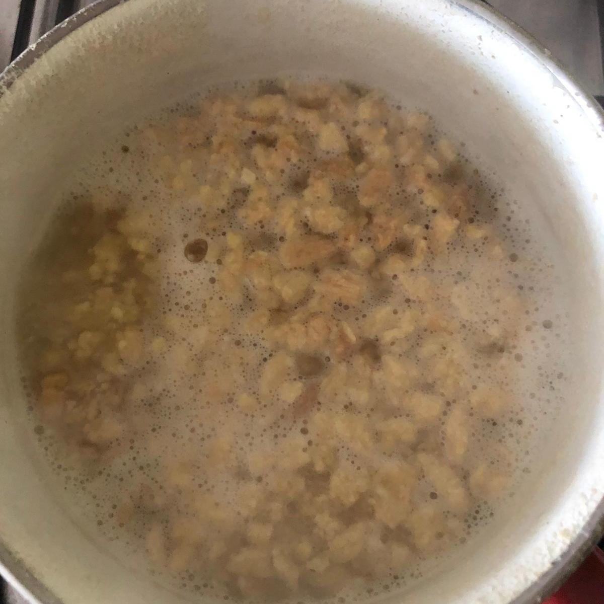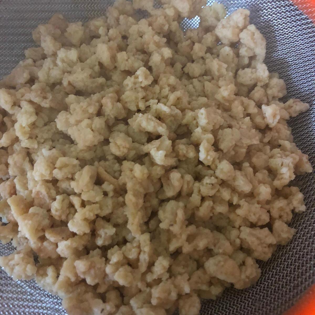 Hidrata la soja texturizada. Pon medio litro de agua a hervir en una cazuela pequeña. Cuando empiece la ebullición, añade la soja. Remueve unos segundos, apaga el fuego y cubre la cazuela durante 15-20 minutos. Pasado este tiempo, escurre el agua, deja enfriar un poco la soja y retira el exceso de agua apretando con las manos. Reserva.