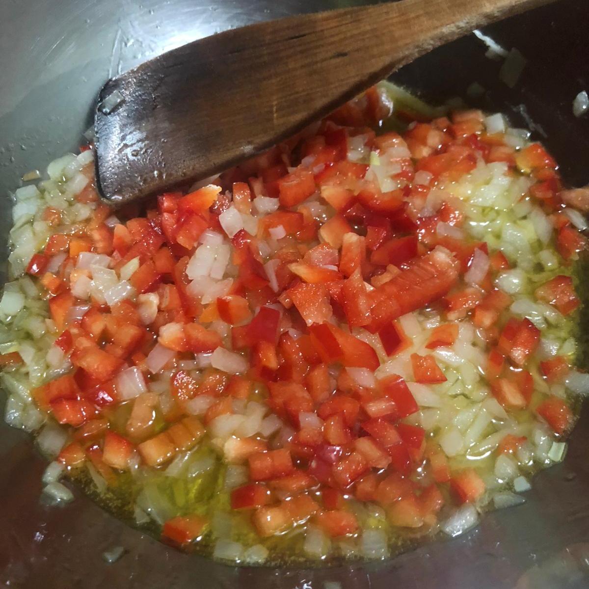 Prepara el sofrito. Corta la cebolla y el pimiento en brunoise. En una sartén honda, vierte un poco de aceite y calienta a fuego lento. Añade la cebolla y el pimiento y cocina hasta que la cebolla comience a estar transparente.