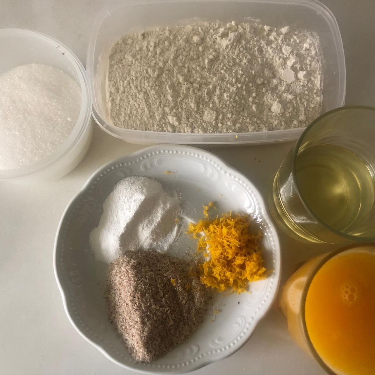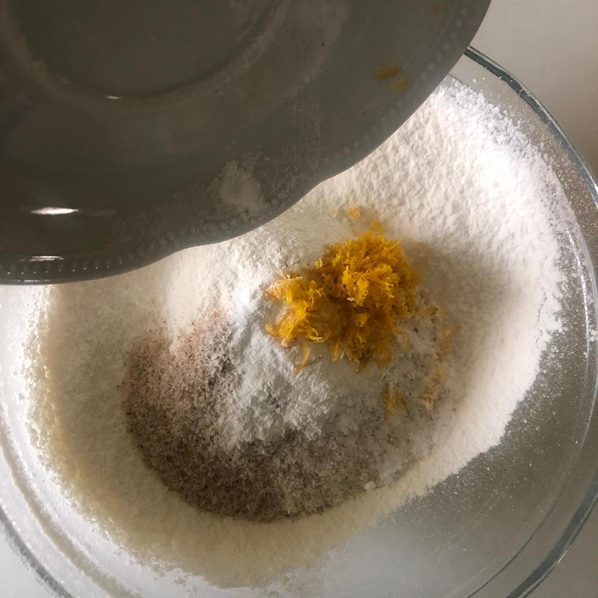 Mezcla los ingredientes secos. Tamiza la harina y agrega la levadura Royal, el psyllium y la ralladura de una naranja. Integra todo bien.