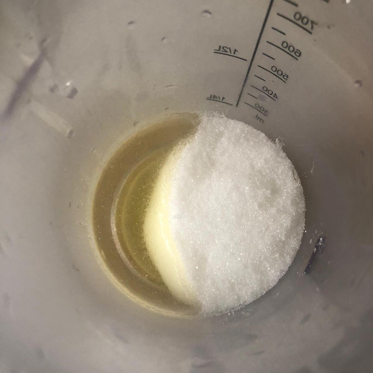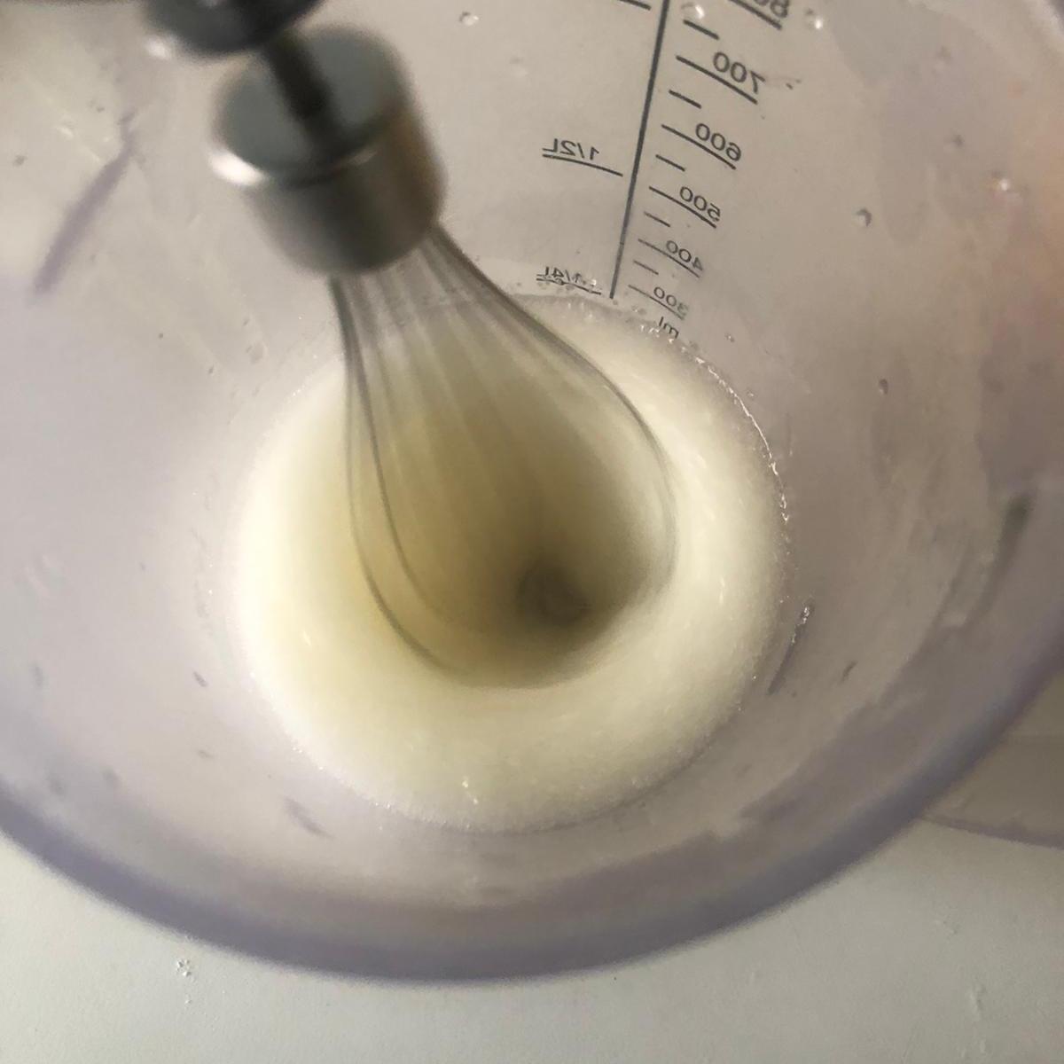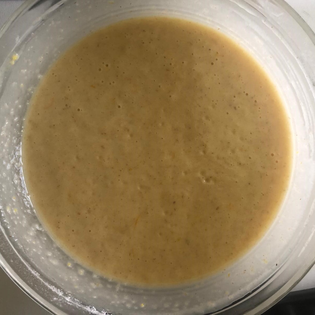En el vaso de la batidora, mezcla el aceite y el azúcar con unas varillas. Bate durante unos minutos. Agrega el zumo de naranja y vuelve a batir hasta hacer espuma. Agrega los ingredientes secos y mezcla todo. Cubre con un papel film y reserva en la nevera durante 30 minutos.