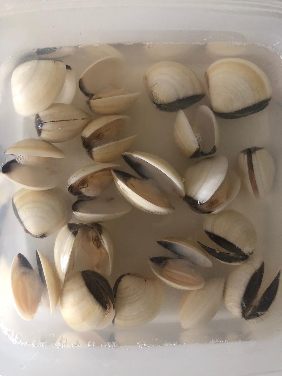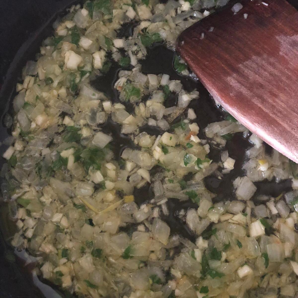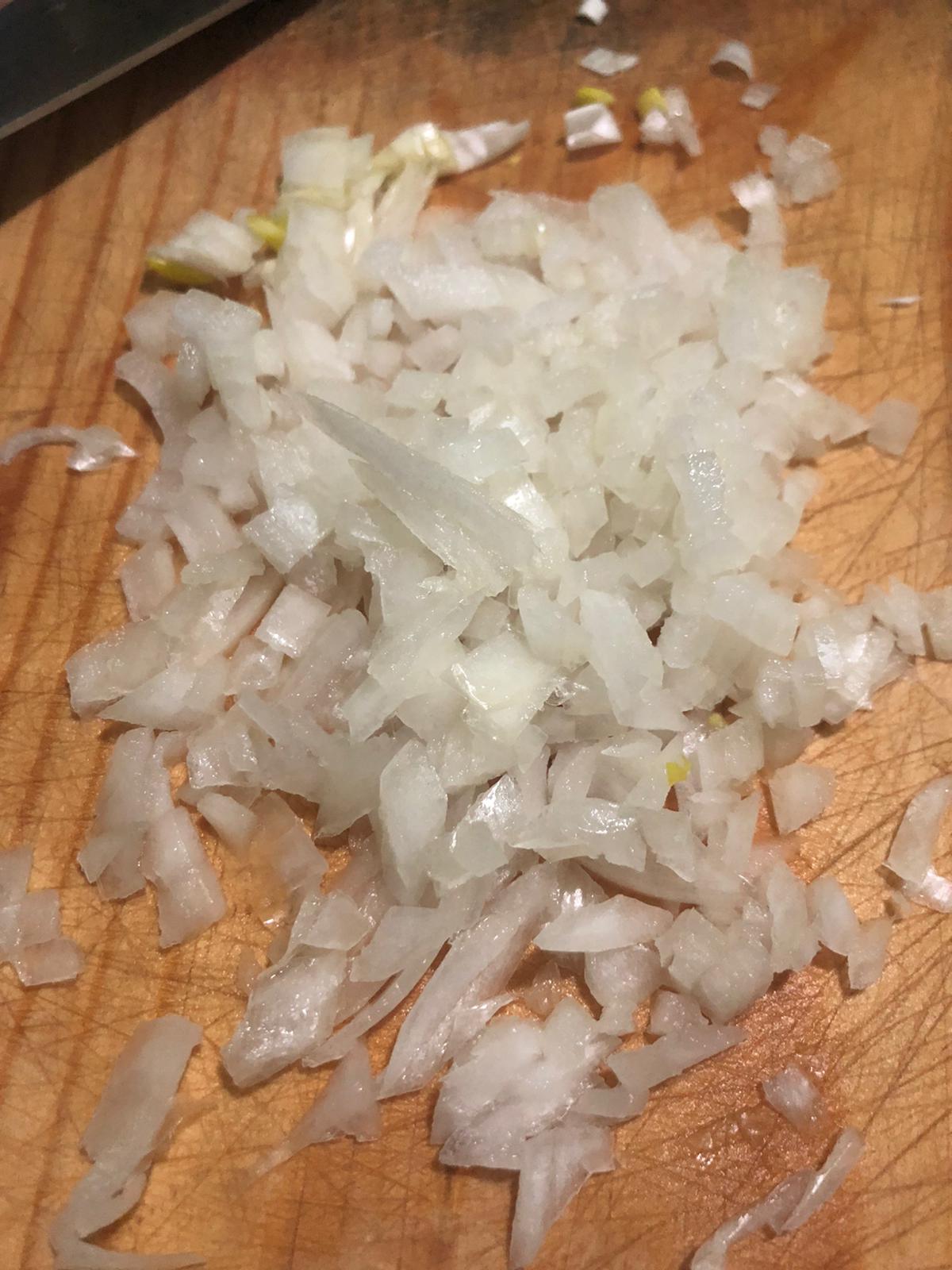 Mientras tanto, corta la cebolla en brunoise y haz un machado con el ajo y el perejil. Deja las almejas en agua con sal para que se abran.
