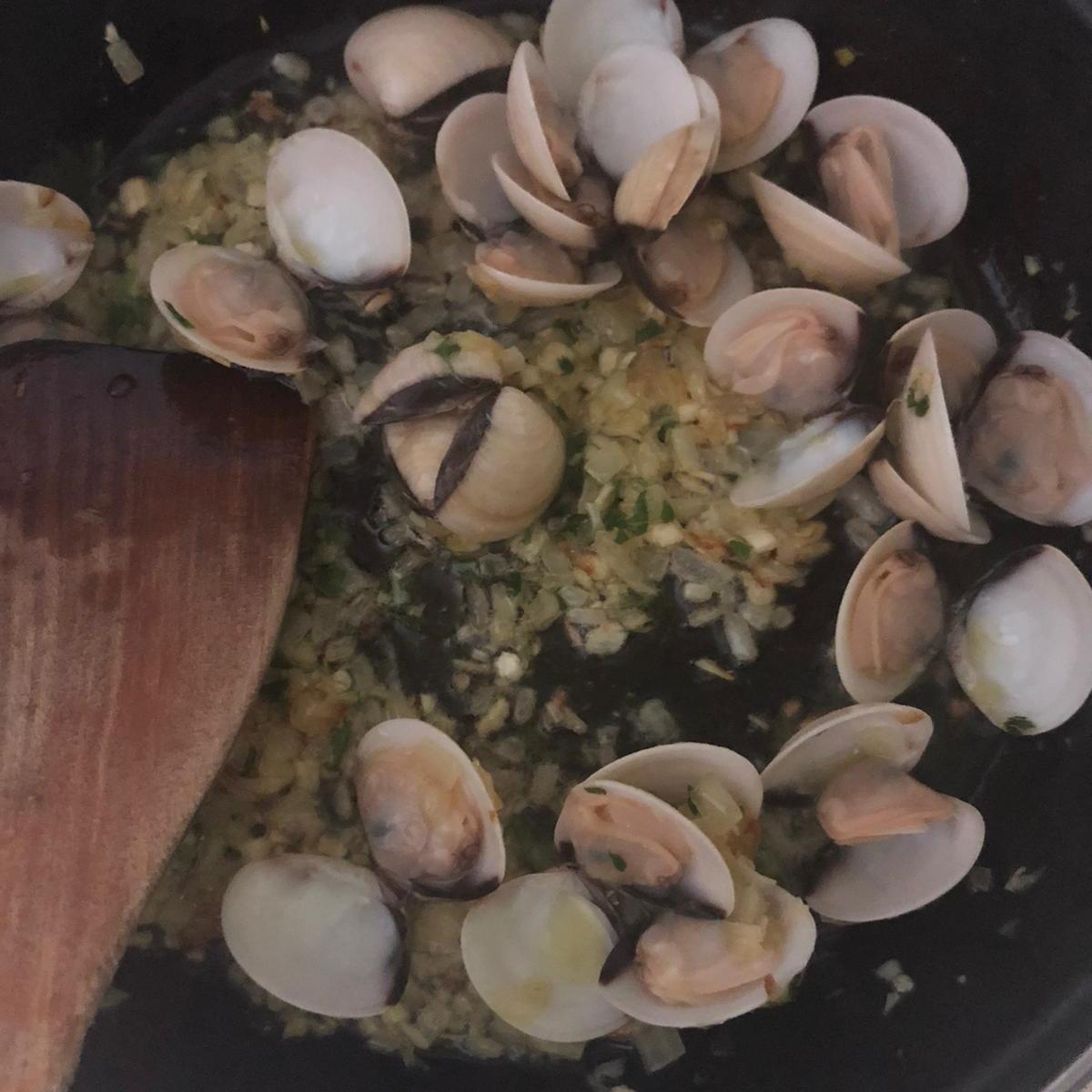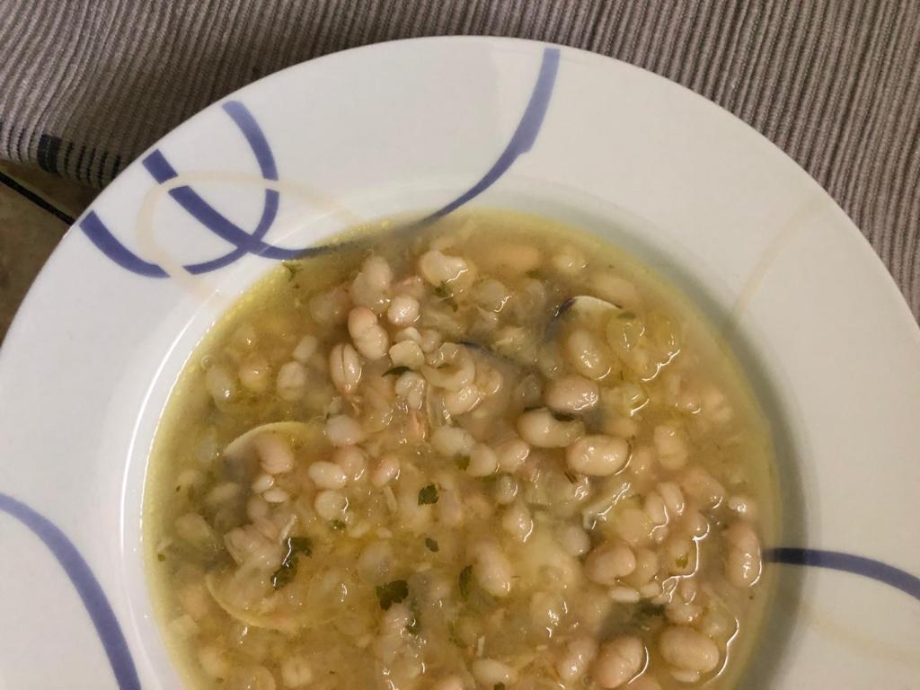 En una sartén con un poco de aceite, sofríe la cebolla a fuego lento. Cuando comience a transparentar añade el machado de ajo-perejil. Sofríe unos minutos. Aclara las almejas y agrega al sofrito. Mezcla todo y vierte en la olla de las alubias. Dale un último hervor, para que se integre todo y listo para servir.