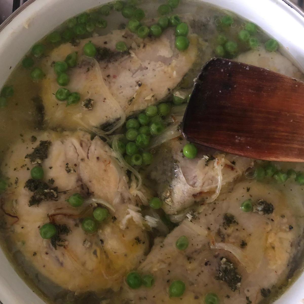 Prepara un machado de ajo y perejil. Da la vuelta al pescado, añade el machado y cocina otros 10 minutos.