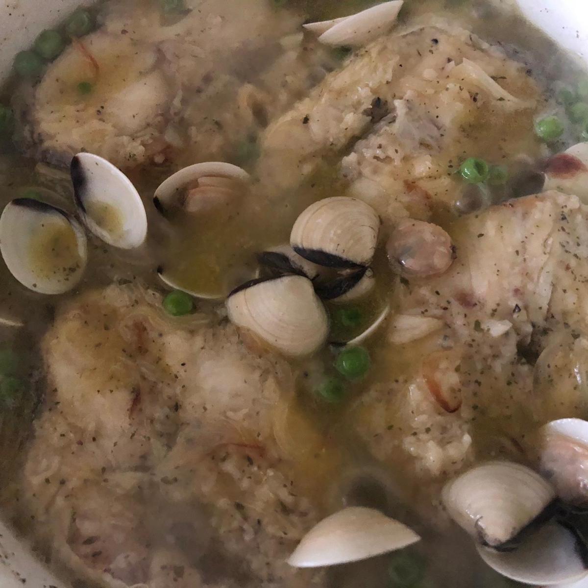 Agrega los guisantes y el agua y deja cocer un poco. Por último, añade las almejas y deja reducir un poco el caldo.