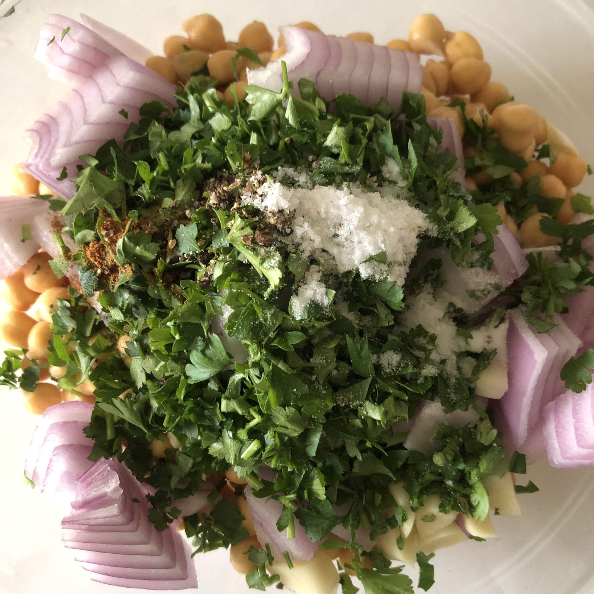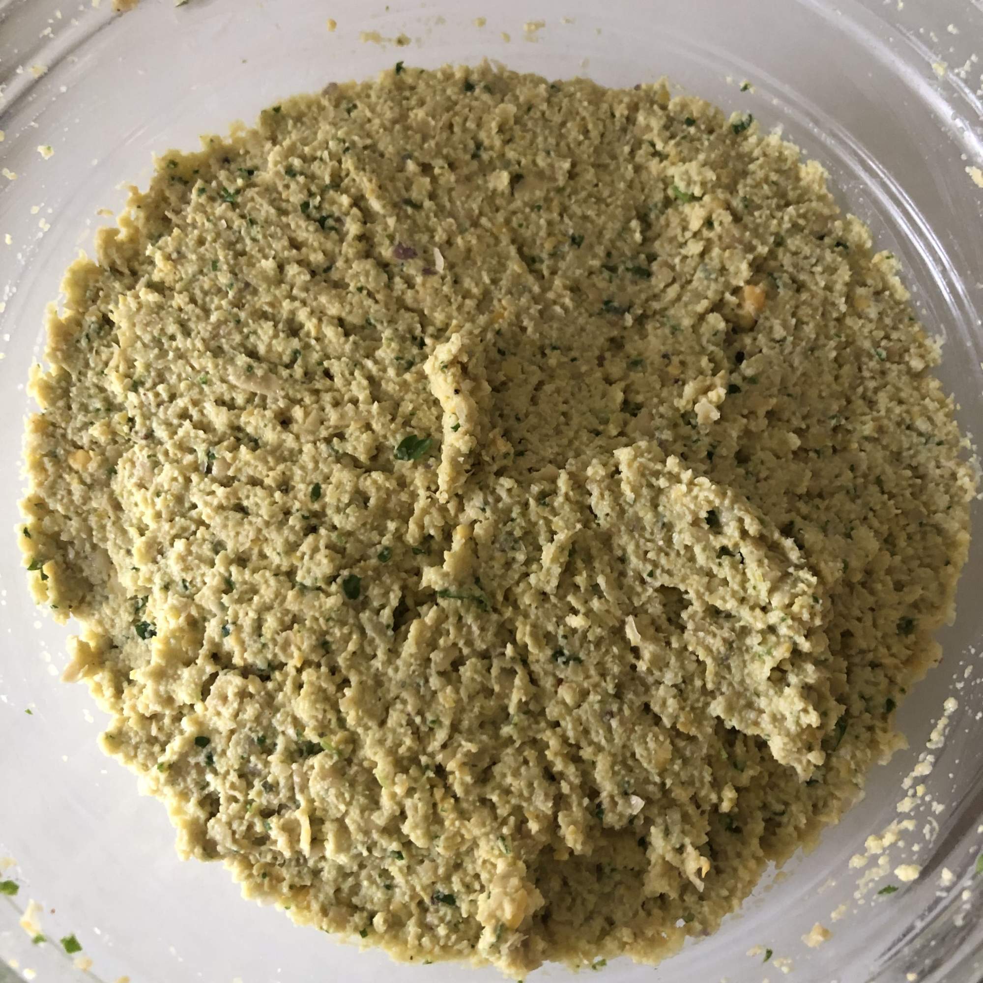Añade las especias (pimienta negra, comino y cayena) y la sal y tritura con la batidora. Tiene que quedar una masa manejable, pero no completamente suave. Deja que se noten los trocitos de garbanzo.