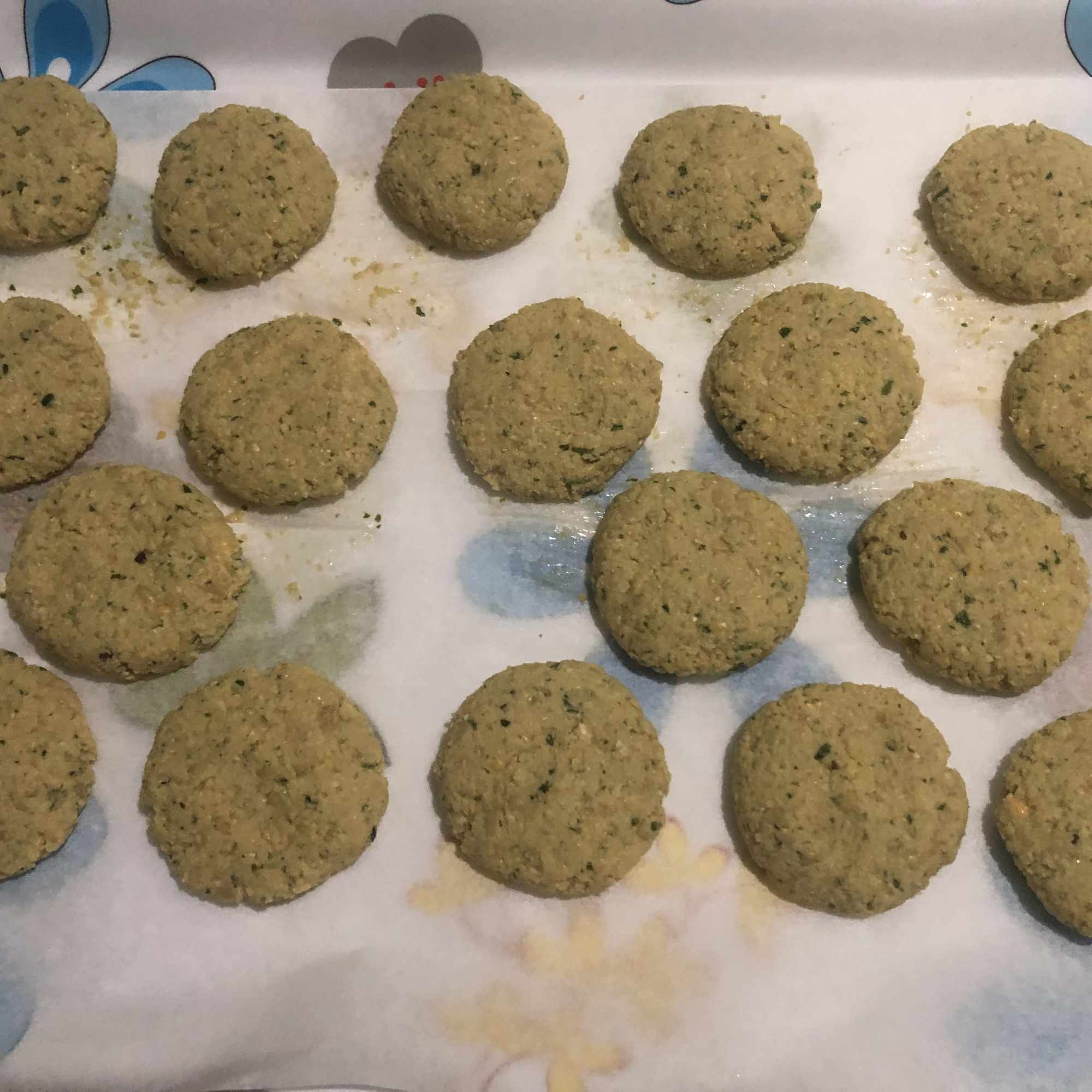 Añade la harina de garbanzos y deja reposar la masa en la nevera, cubierta con papel film, durante una horita. Pasado este tiempo, toma porciones de masa del tamaño de una pelota de ping pong (vamos, que son pequeñitas), haz una bola y aplasta. La masa es bastante húmeda, pero te recomiendo no echar mucha más harina, porque quedará demasiado seca.
