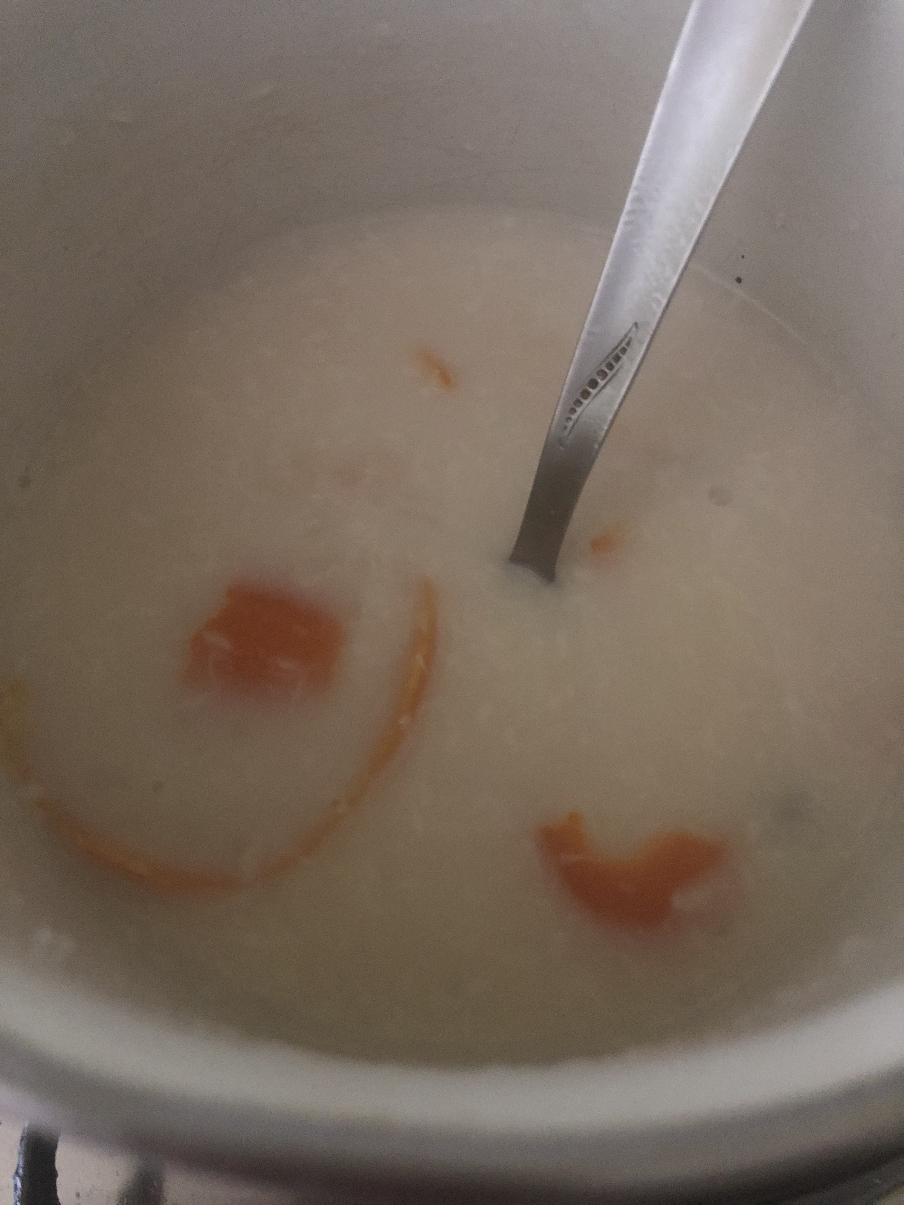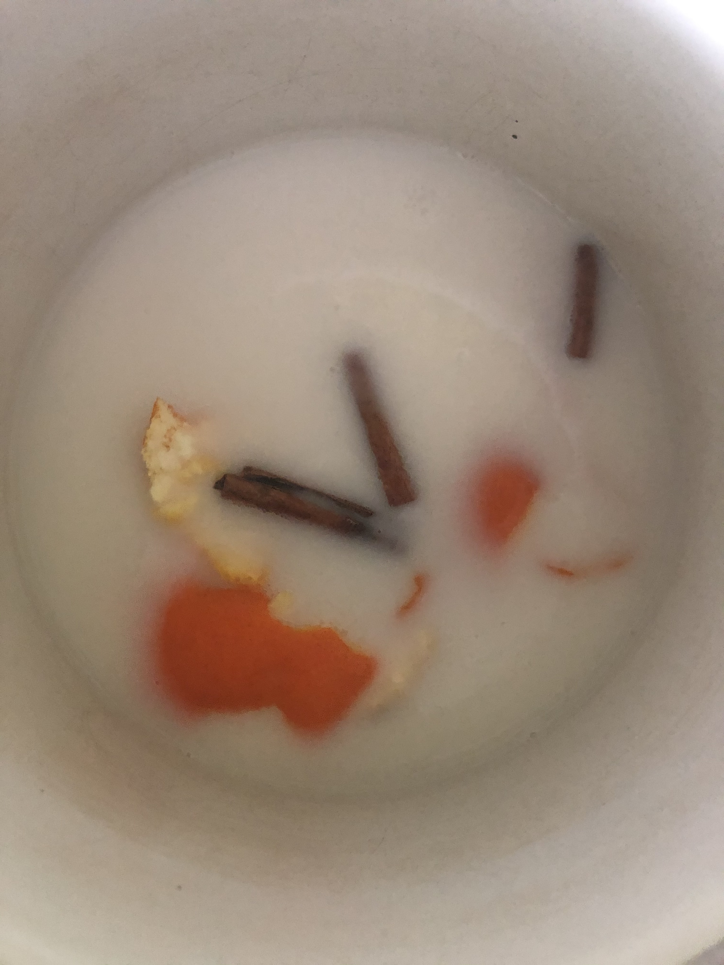 Calienta la leche con la canela, la piel de naranja, el coco y el azúcar a fuego lento. Deja cocer todo junto, lentamente, removiendo de vez en cuando para que no se pegue y el coco se vaya hidratando. Retira del fuego, cubre y deja infusionar unos 5-10 minutos. Retira la canela y la piel de naranja y tritura con una batidora si deseas que el coco no se note tanto.