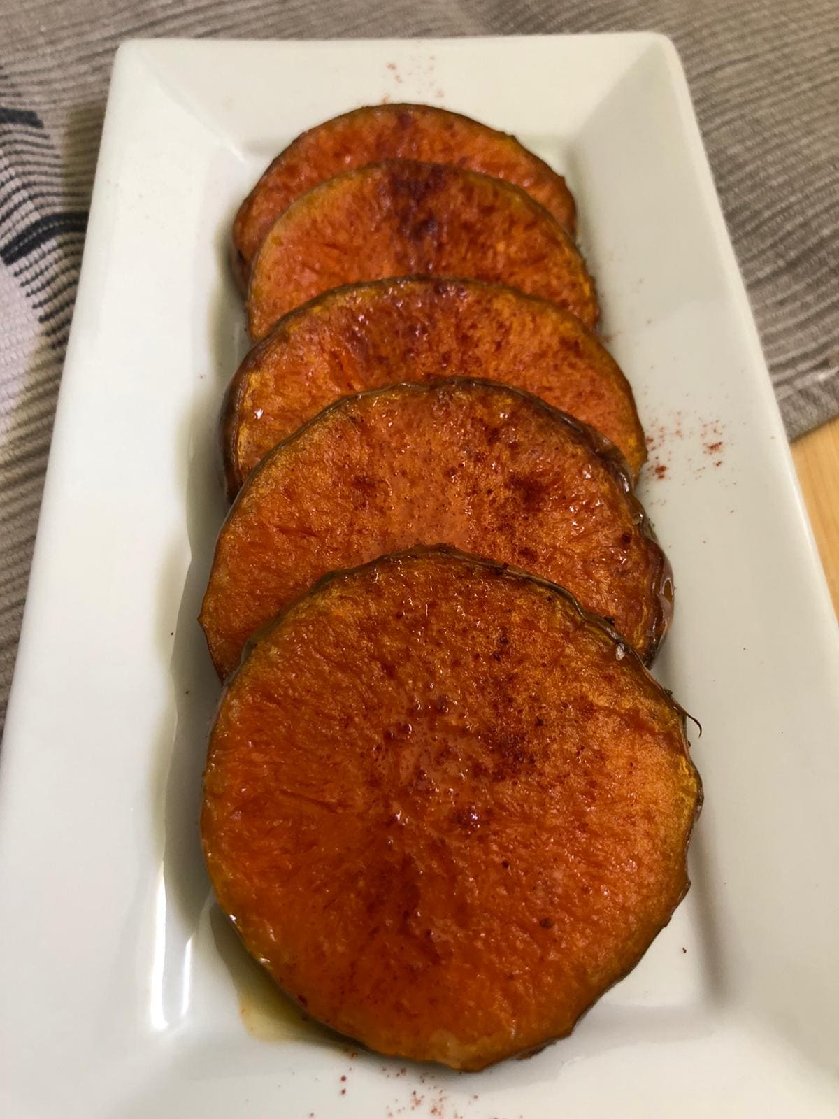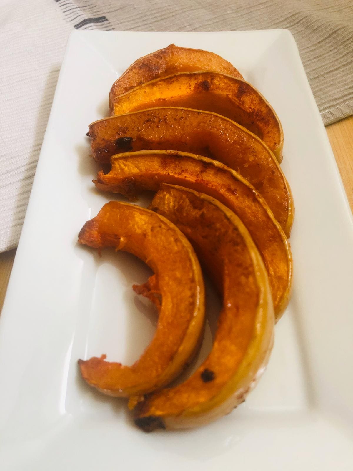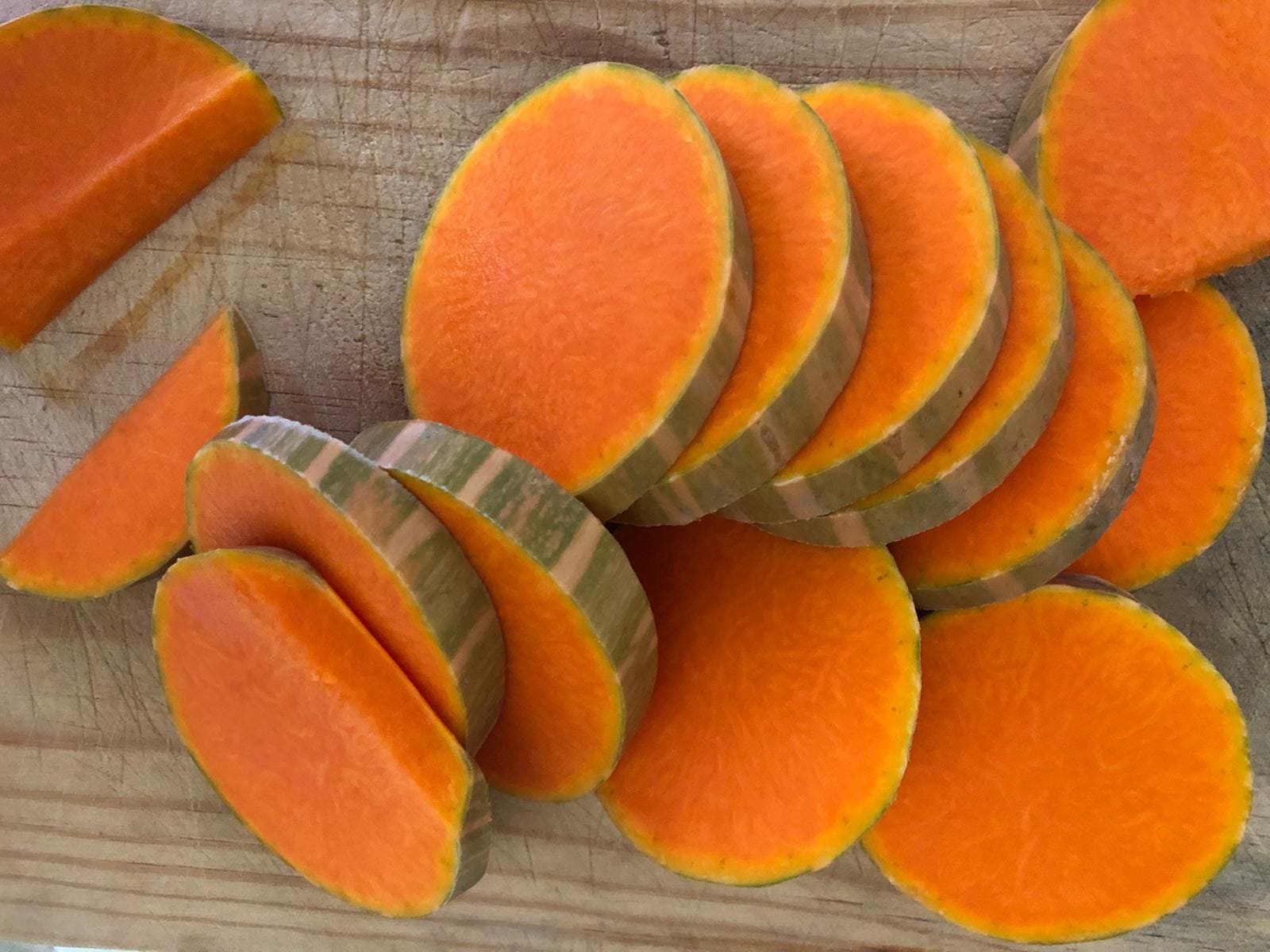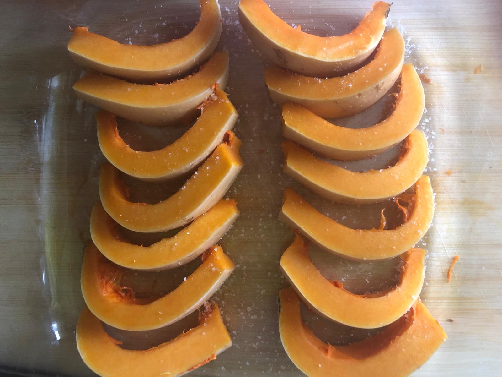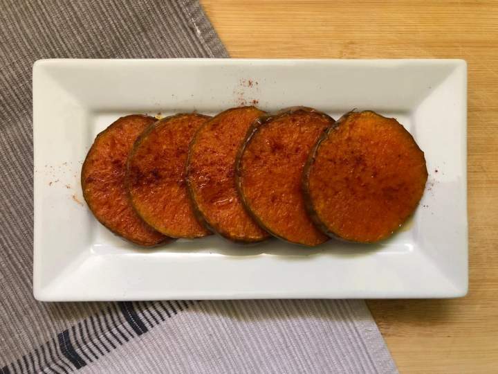 Lava bien la calabaza, ya que la vamos a preparar con piel. Si es de tipo alargado, córtala en rodajas de 1 cm aproximadamente. Si es de las redondas, puedes cortarla con forma de rodaja de melón (retira antes las pipas y limpia bien por dentro). Sazona.