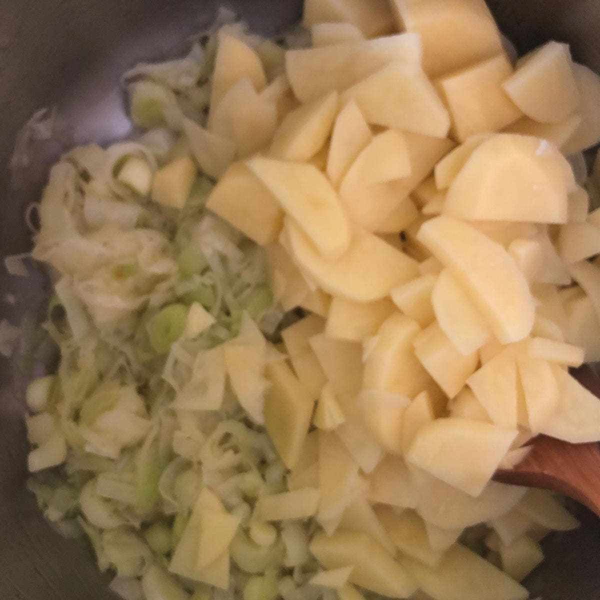Limpia los puerros. Haz un corte al medio y lava debajo del grifo, separando con cuidado las partes. Seca un poco y corta en rodajas finas. Pela las patatas y pícalas en láminas finas.