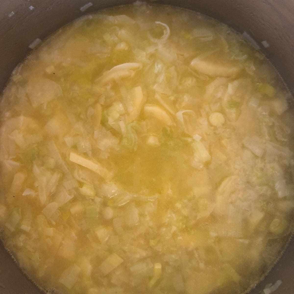 En una cazuela (u olla rápida), con un poco de aceite de oliva, sofríe el puerro a fuego medio hasta que comience a transparentar. Añade las patatas y cocina unos minutos más. Salpimenta y agrega el caldo de verduras (que lo cubra). Cuece hasta que la patata esté blandita. En la olla he tardado unos 20 minutos.