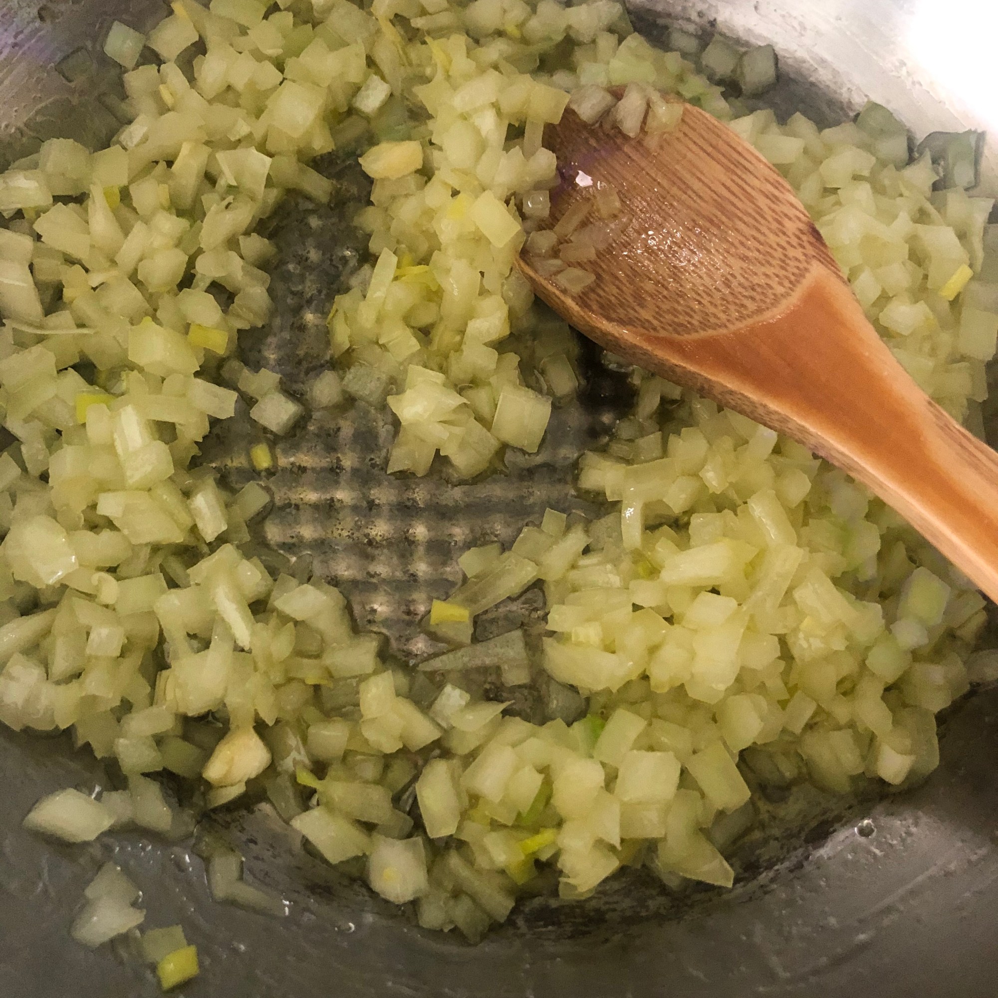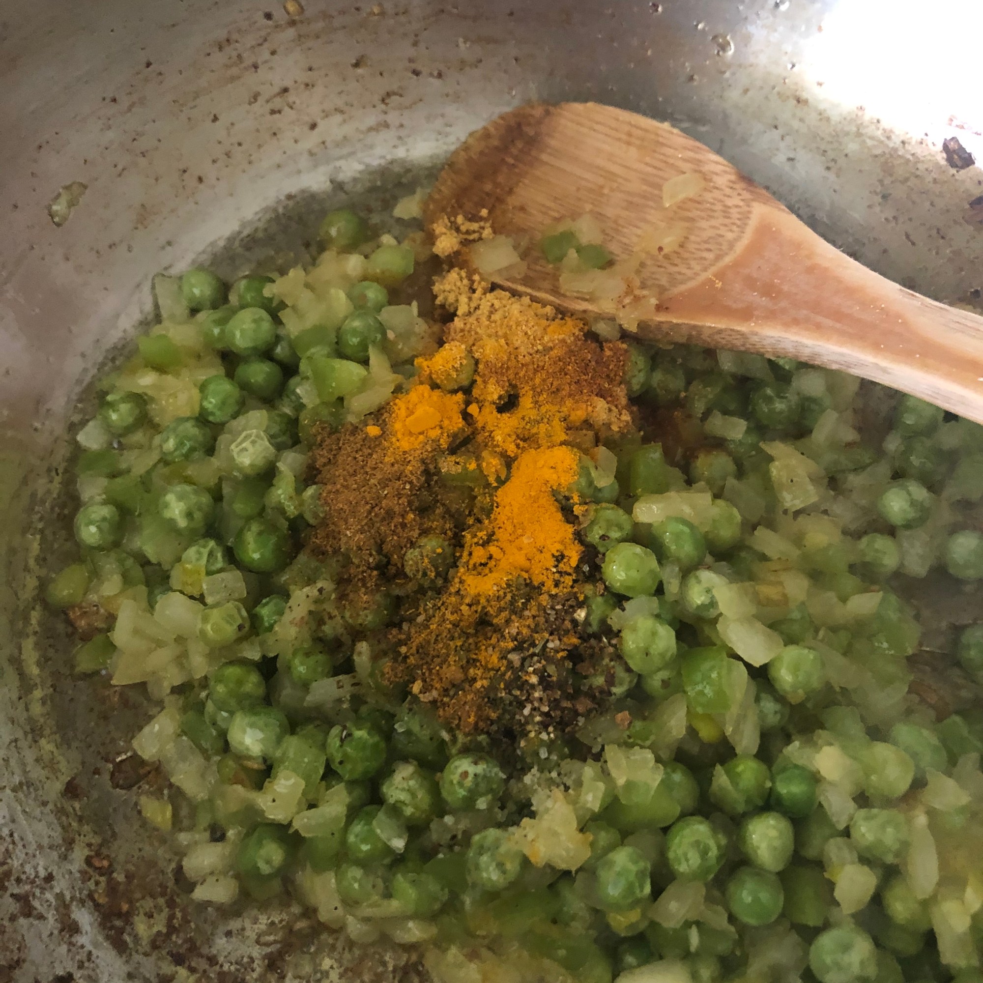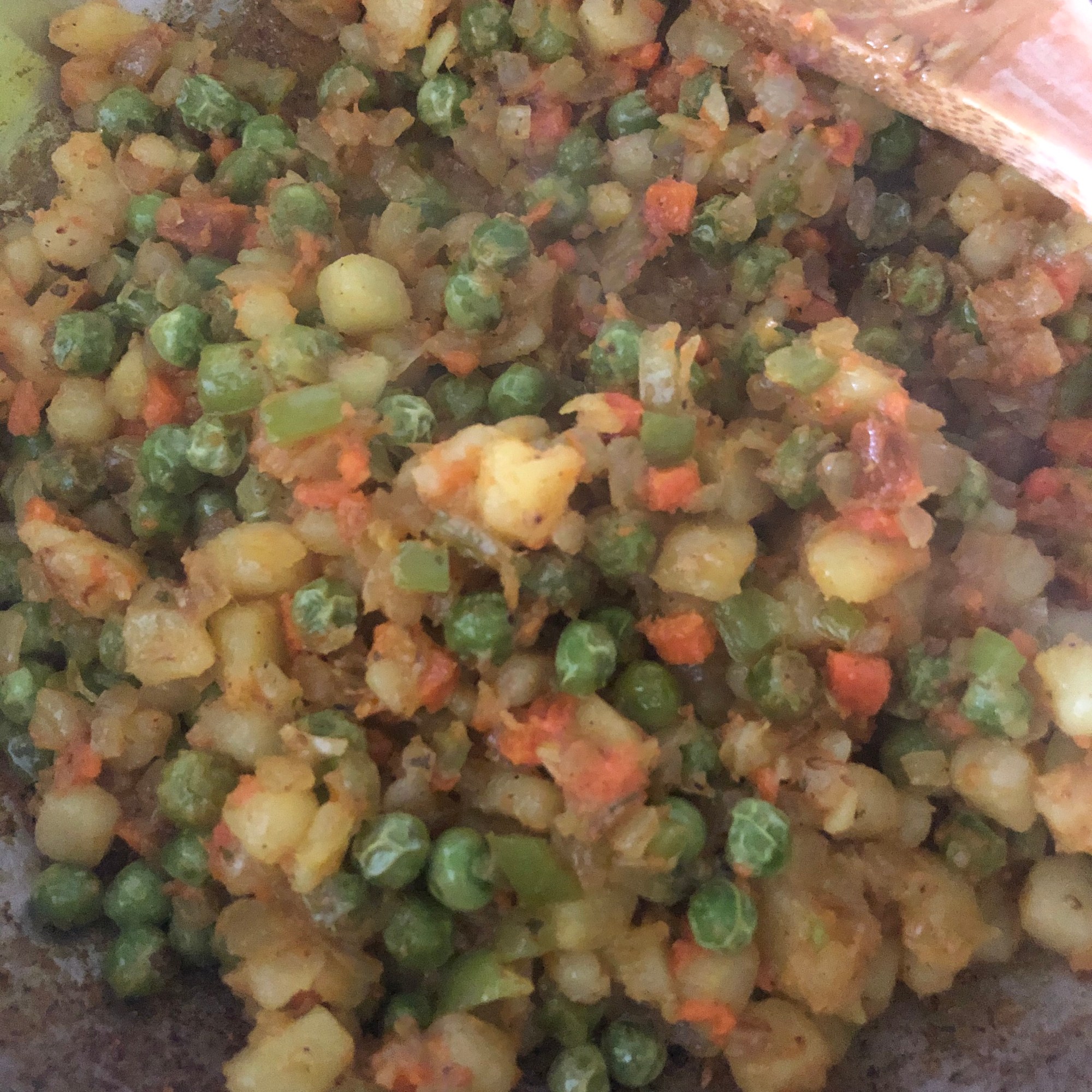 Por último, añade las especias y mezcla todo bien unos segundos, sin dejar que se quemen. Es hora de incorporar la patata y la zanahoria. Mezcla todo bien unos minutos más, apaga el fuego y deja templar.