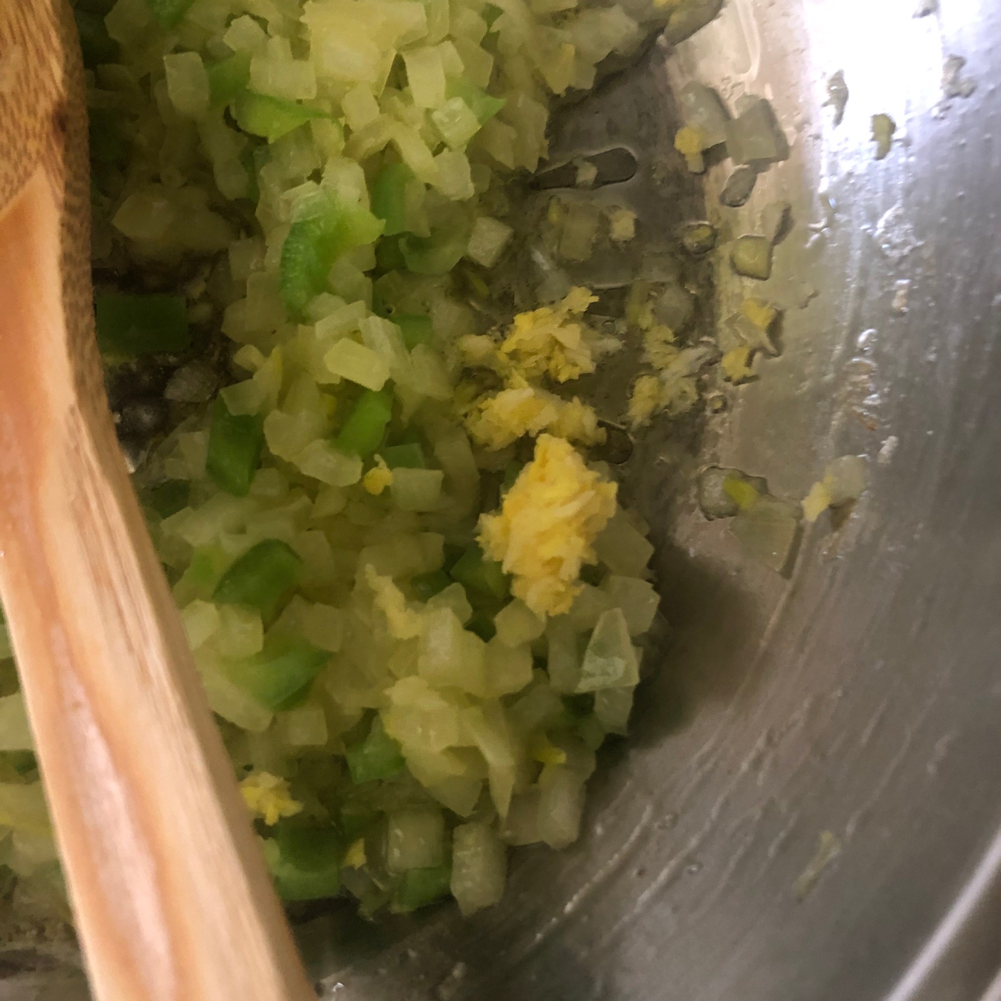 Prepara el relleno. En una sartén con un poco de aceite, pon a freír la cebolla a fuego ligero. Mueve constantemente. Cuando empiece a transparentar, añade el pimiento y cocina unos minutos. Después agrega el ajo y el jengibre machado, seguidamente los guisantes.