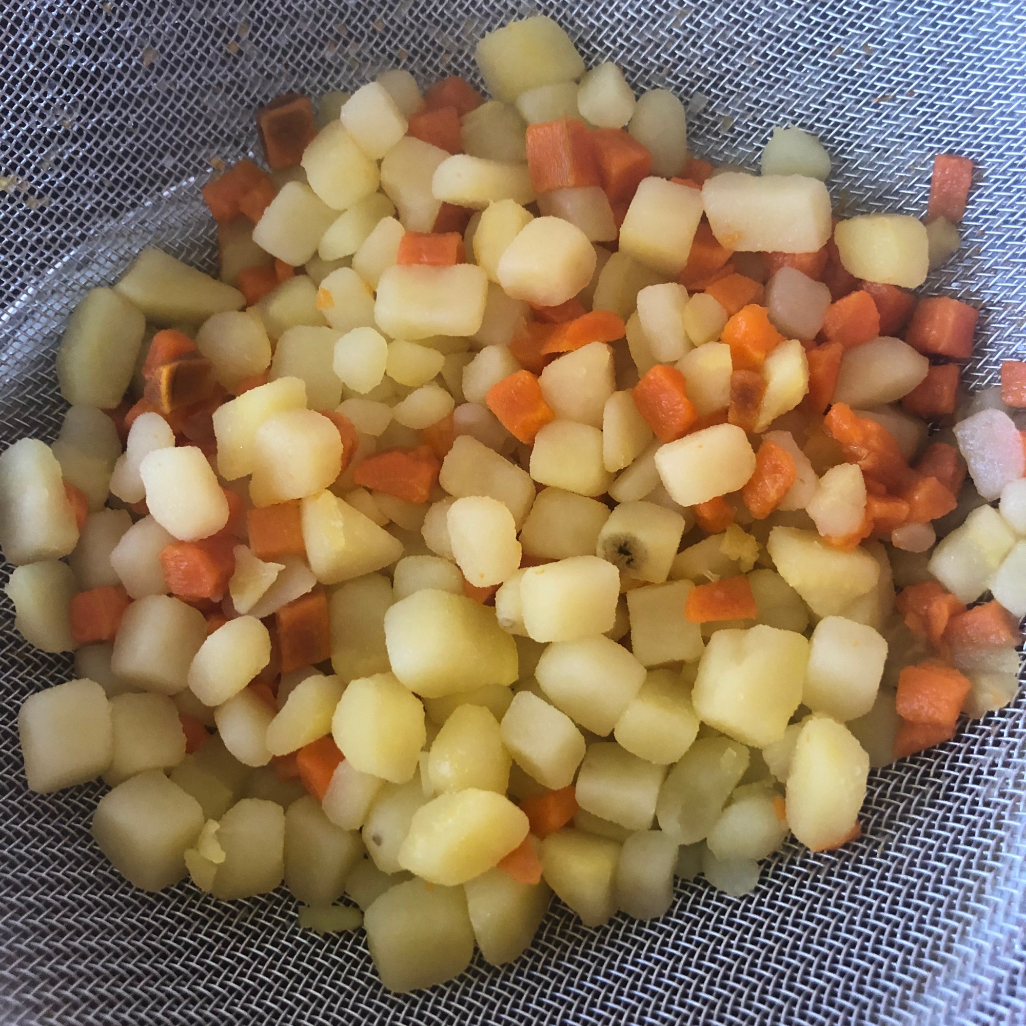 Lo primero que haremos será poner una cazuela con agua y sal a hervir. Pela las patatas y las zanahorias, corta en cubos pequeños y cuando el agua rompa a hervir cuece todo junto durante unos 30 minutos o hasta que estén tiernas (pero que no se rompan). Después escurre y reserva. Si utilizas guisantes frescos, es momento de cocerlos.