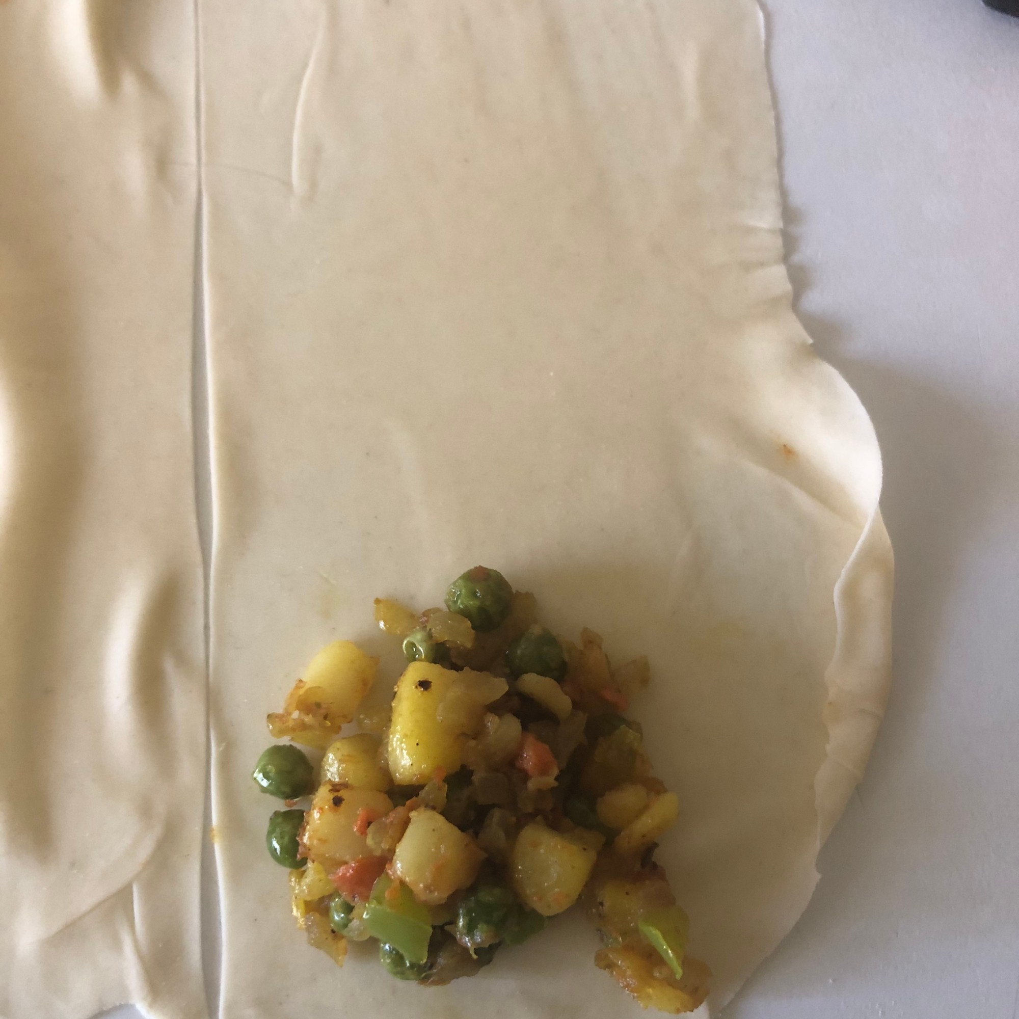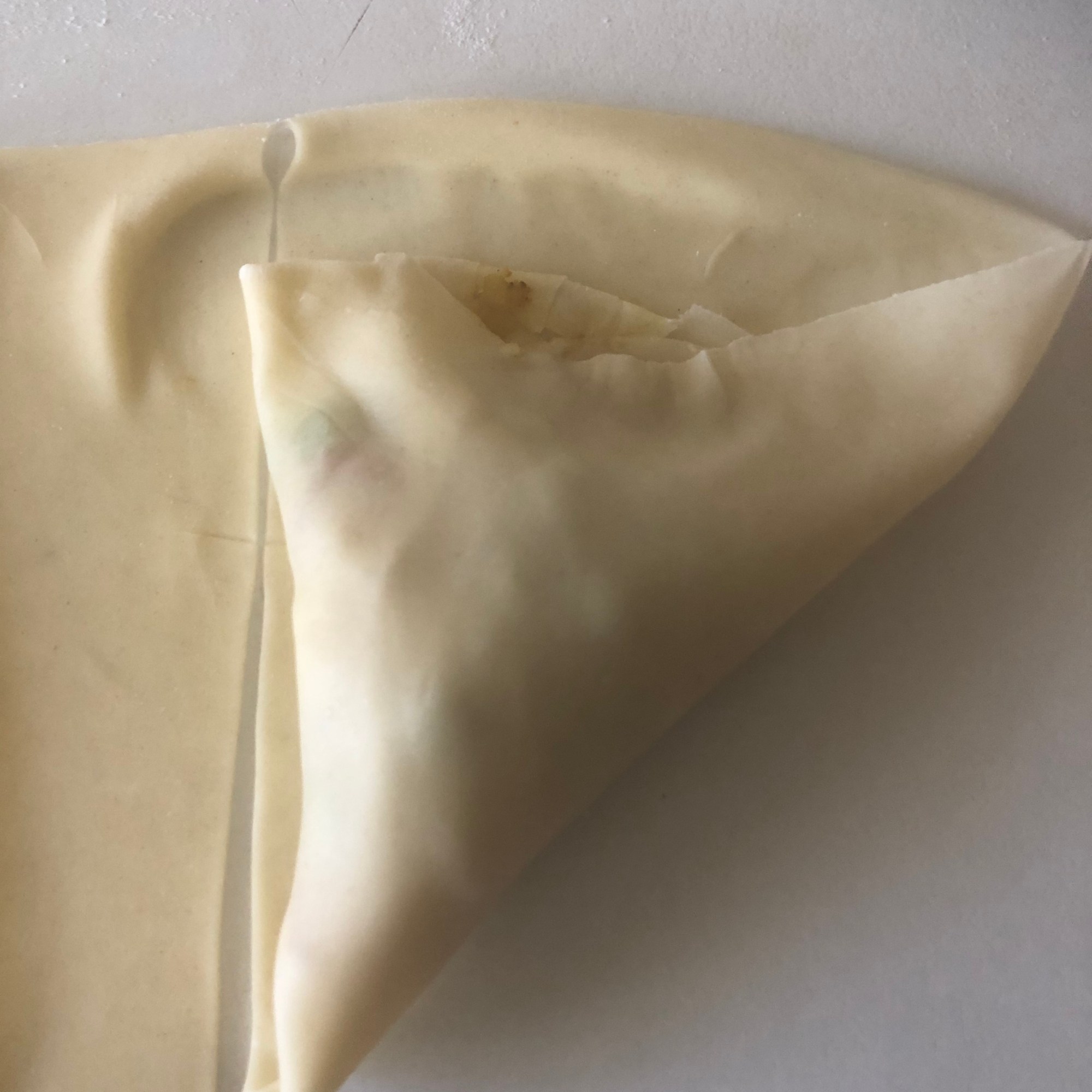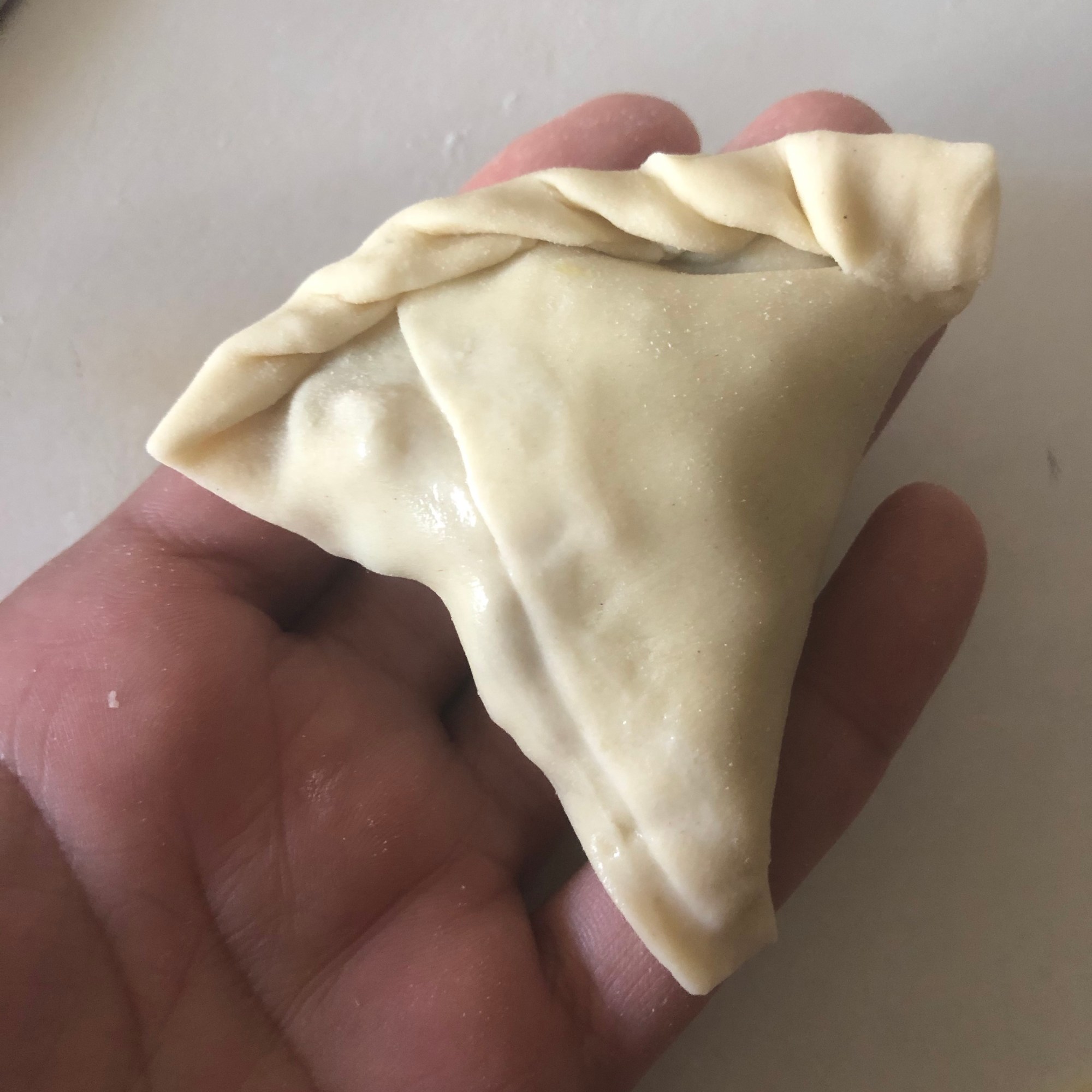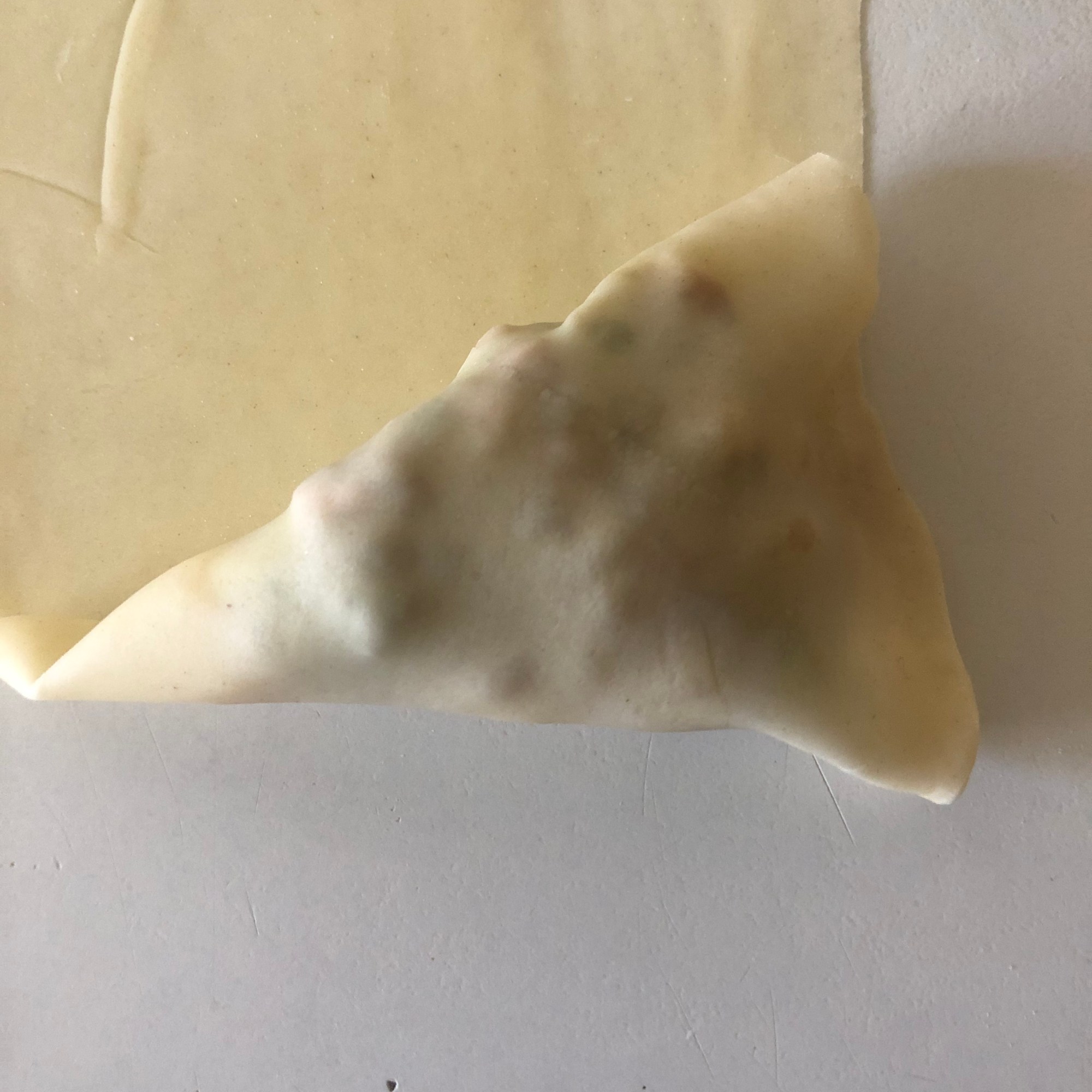 Forma 1: enharina la mesa y estira cada bolita con un rodillo, haciendo círculos de unos 15 cm de diámetro y un grosor muy finito. Aunque es una masa bastante elástica yo soy incapaz de hacer un círculo perfecto (como puedes ver en la foto). Puedes cortarlo con una tapadera. Divide el círculo en dos partes iguales. Dobla una esquina hacia adentro, haciendo un triangulito y luego la esquina opuesta (cerrando el triángulo). Coge la masa como si fuera una manga pastelera y rellena con las verduras. Presiona con los dedos para quede bien sellada o hazle un borde bonito, como las empanadillas. Si lo necesitas, humedece la masa con un poco de agua y sella la parte que queda abierta. Es más fácil si te enseño los pasos:
