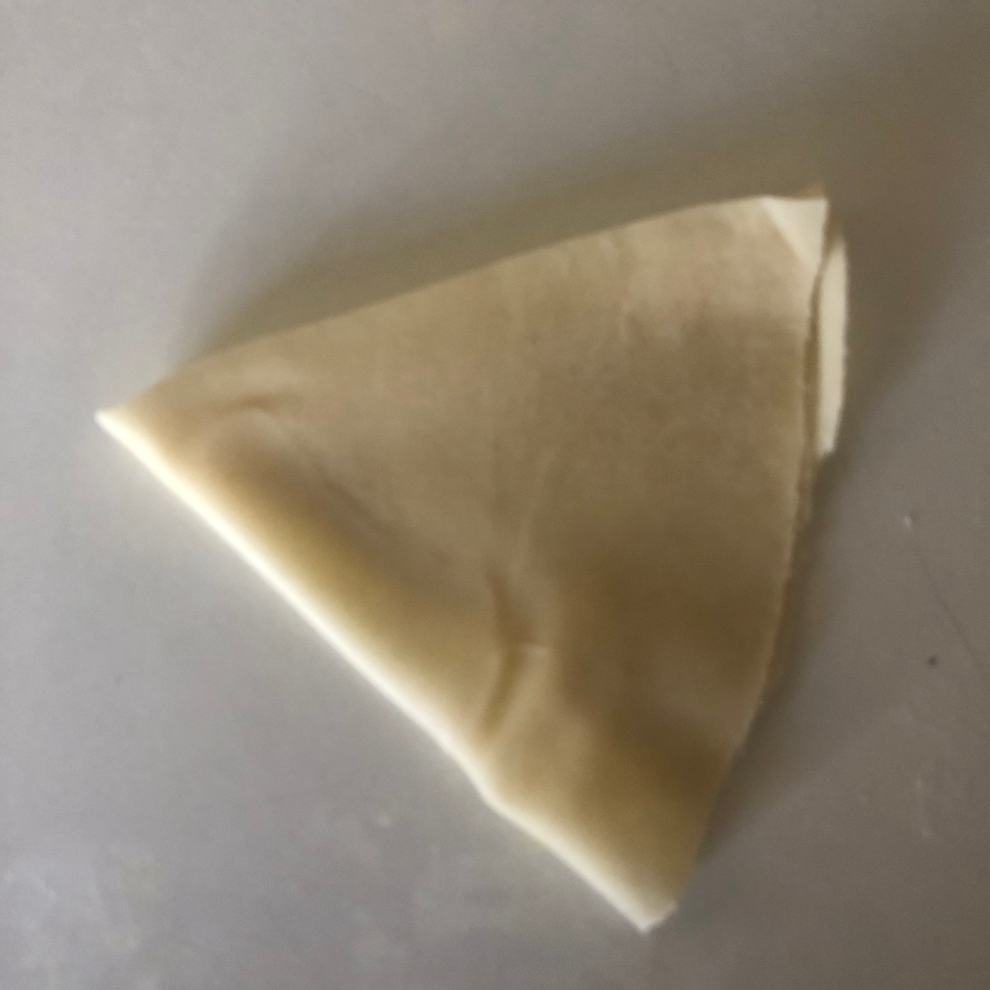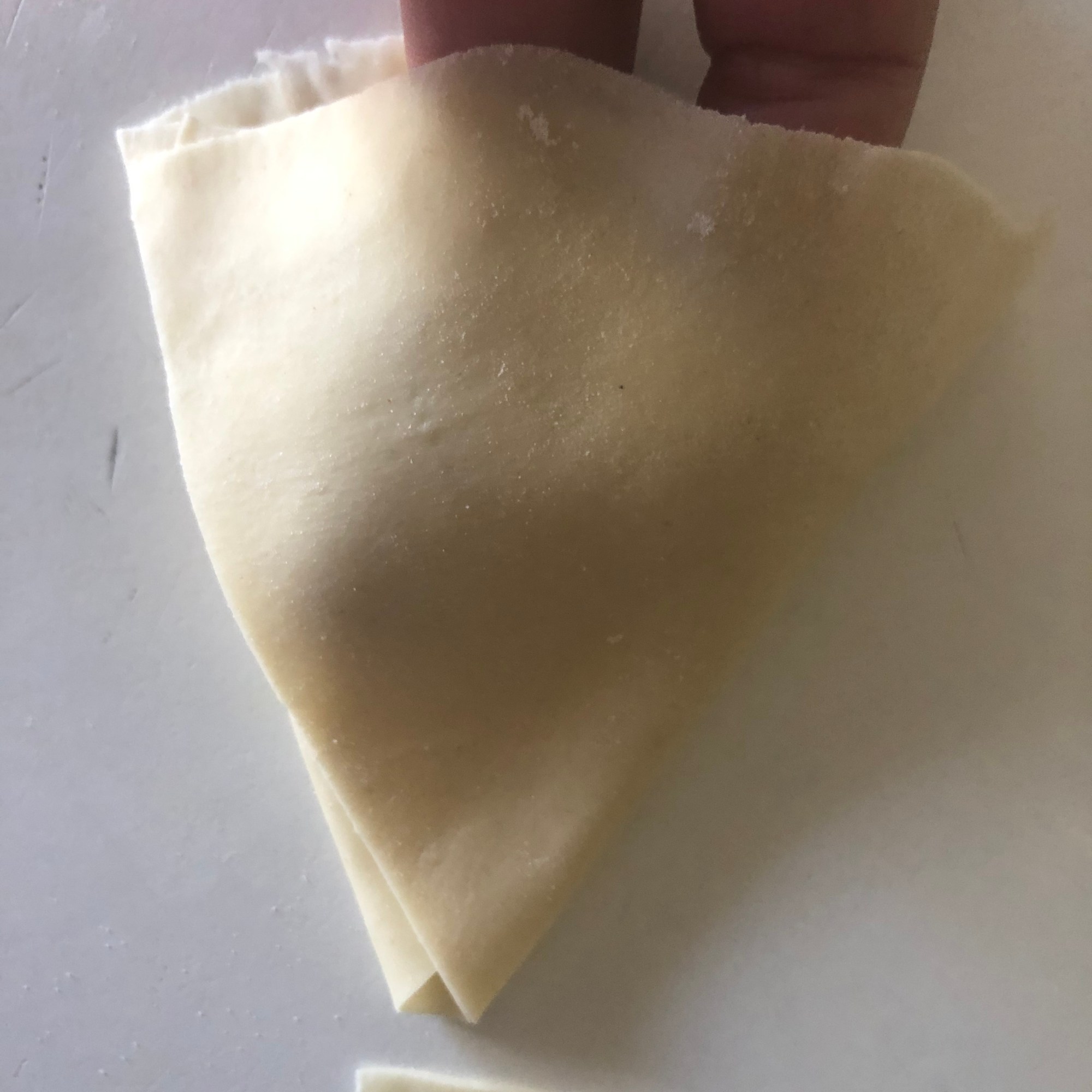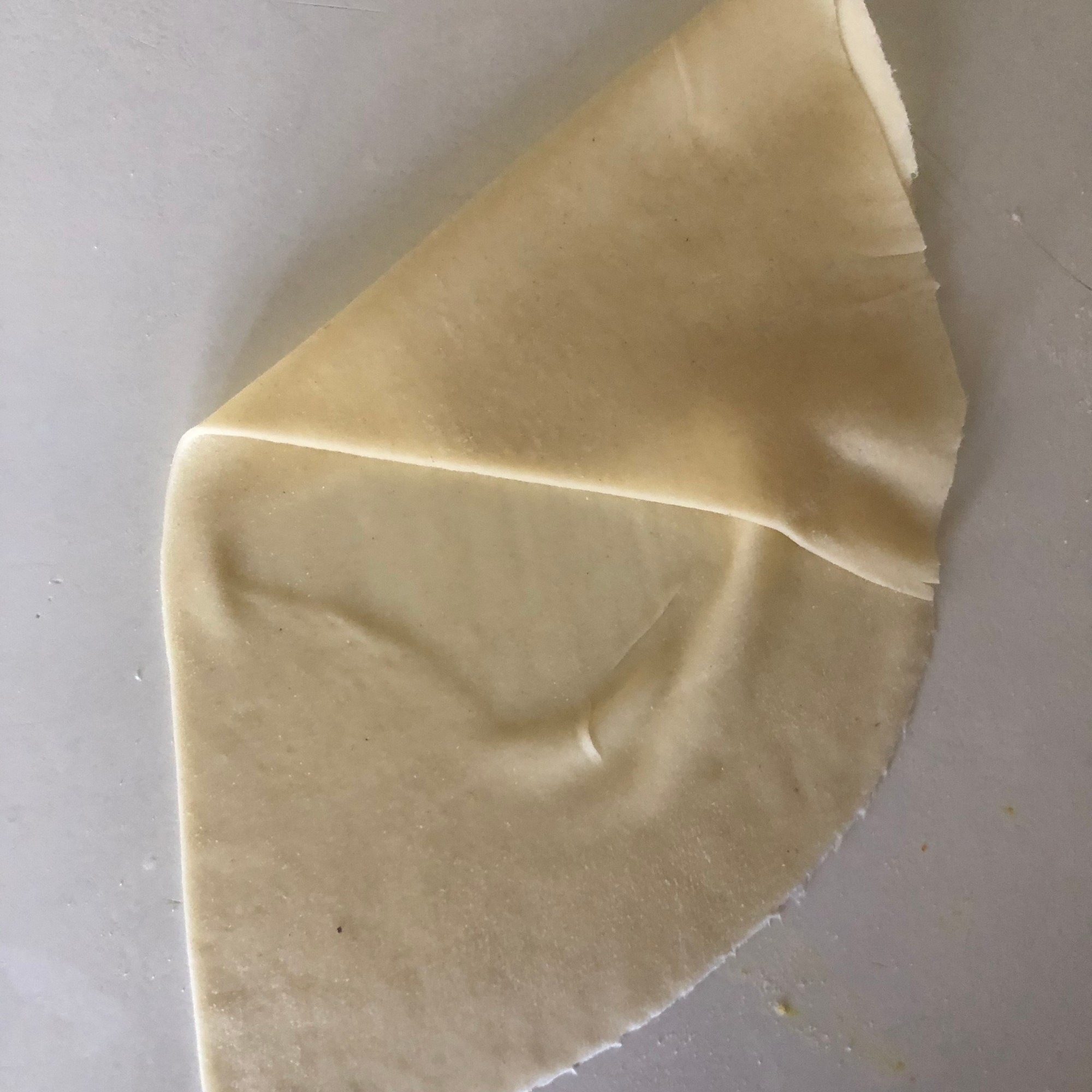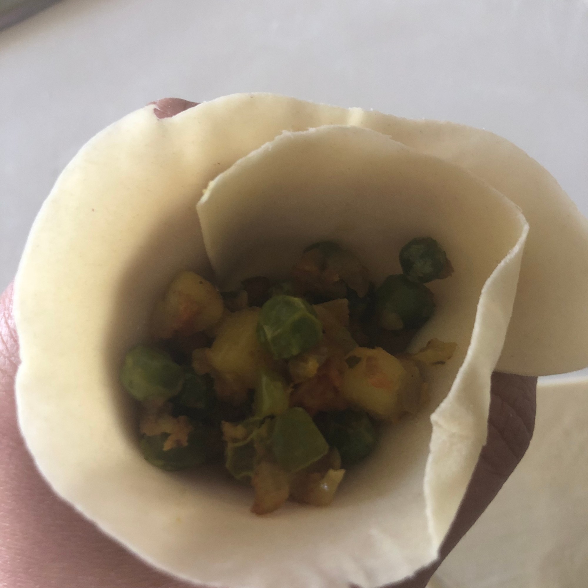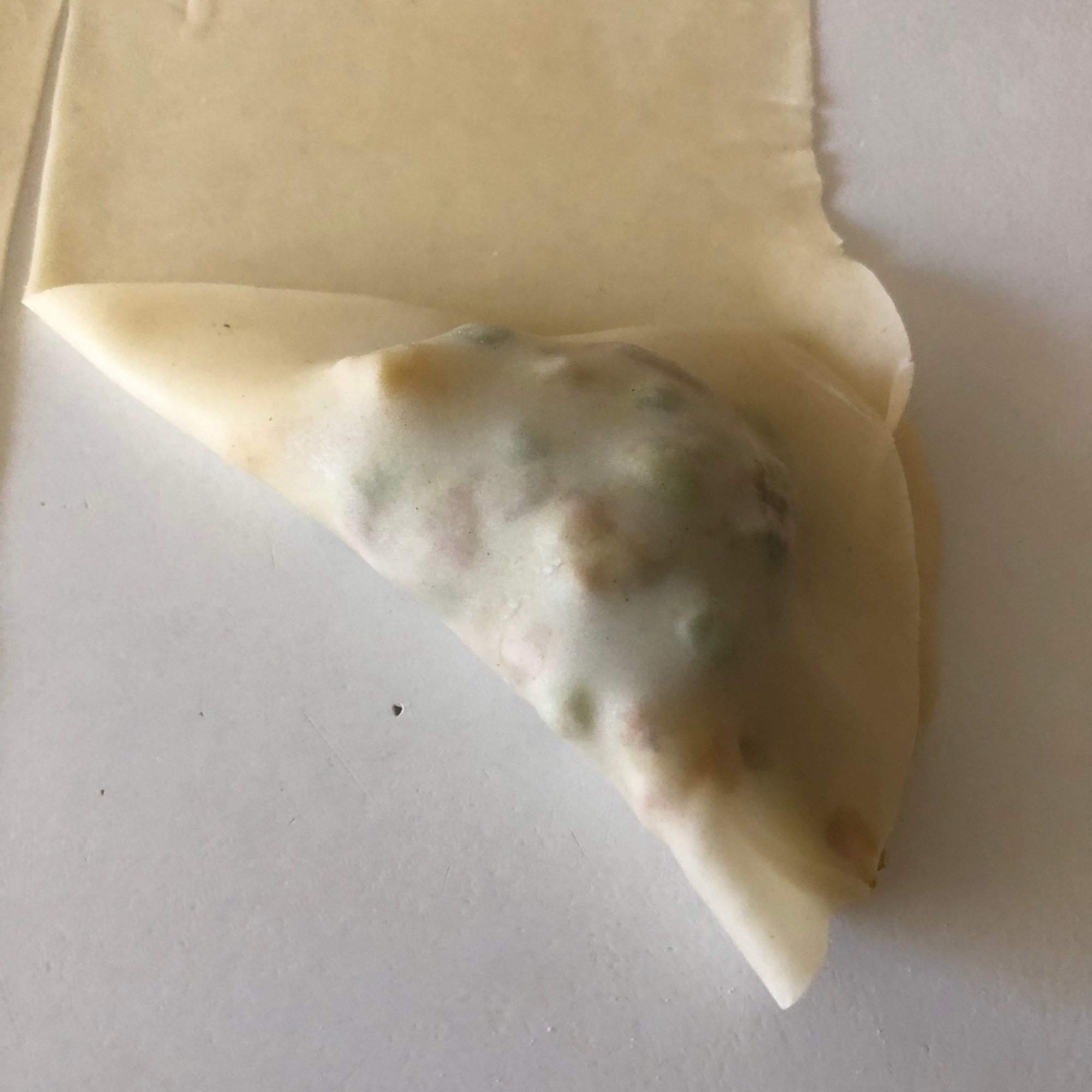 Forma 1: enharina la mesa y estira cada bolita con un rodillo, haciendo círculos de unos 15 cm de diámetro y un grosor muy finito. Aunque es una masa bastante elástica yo soy incapaz de hacer un círculo perfecto (como puedes ver en la foto). Puedes cortarlo con una tapadera. Divide el círculo en dos partes iguales. Dobla una esquina hacia adentro, haciendo un triangulito y luego la esquina opuesta (cerrando el triángulo). Coge la masa como si fuera una manga pastelera y rellena con las verduras. Presiona con los dedos para quede bien sellada o hazle un borde bonito, como las empanadillas. Si lo necesitas, humedece la masa con un poco de agua y sella la parte que queda abierta. Es más fácil si te enseño los pasos:
