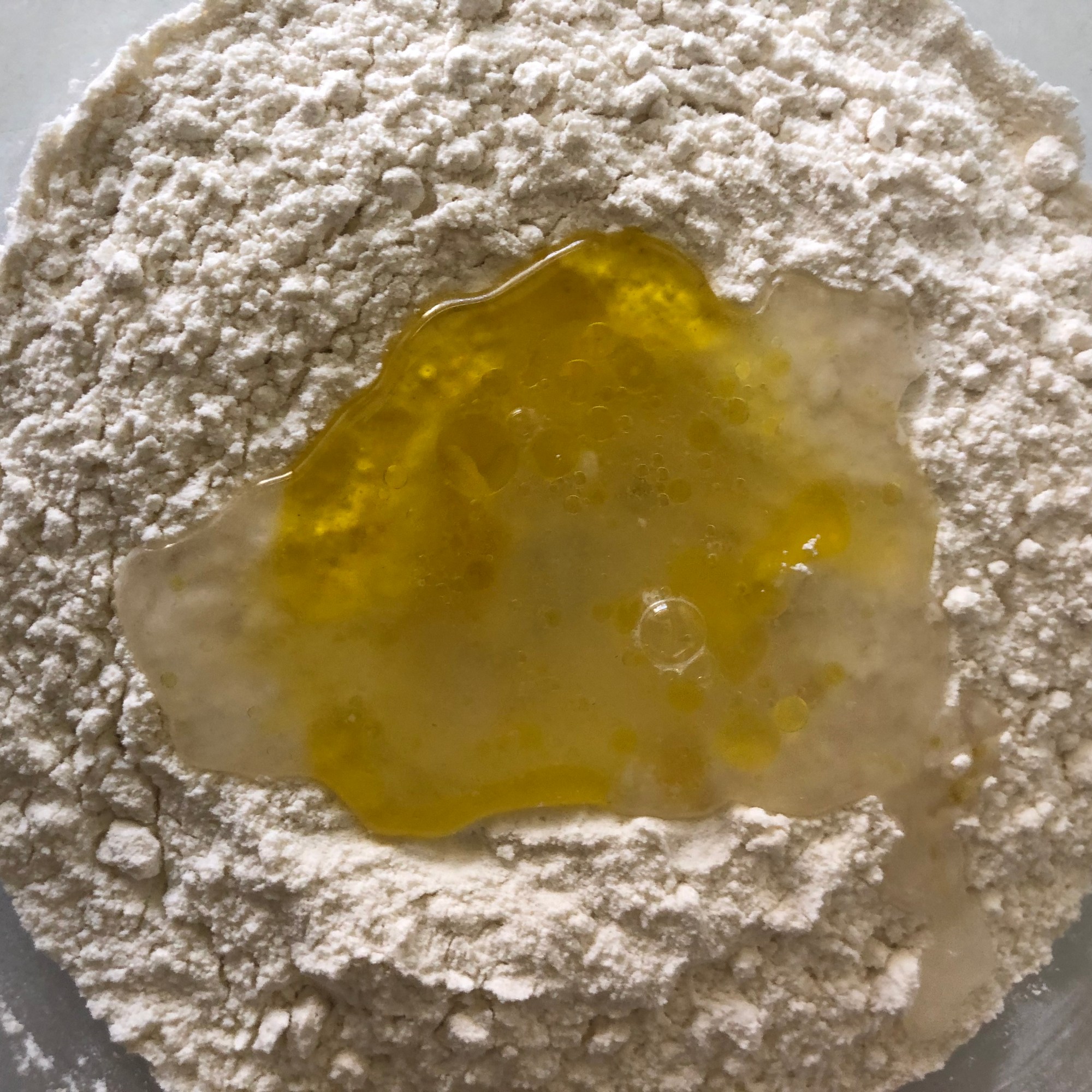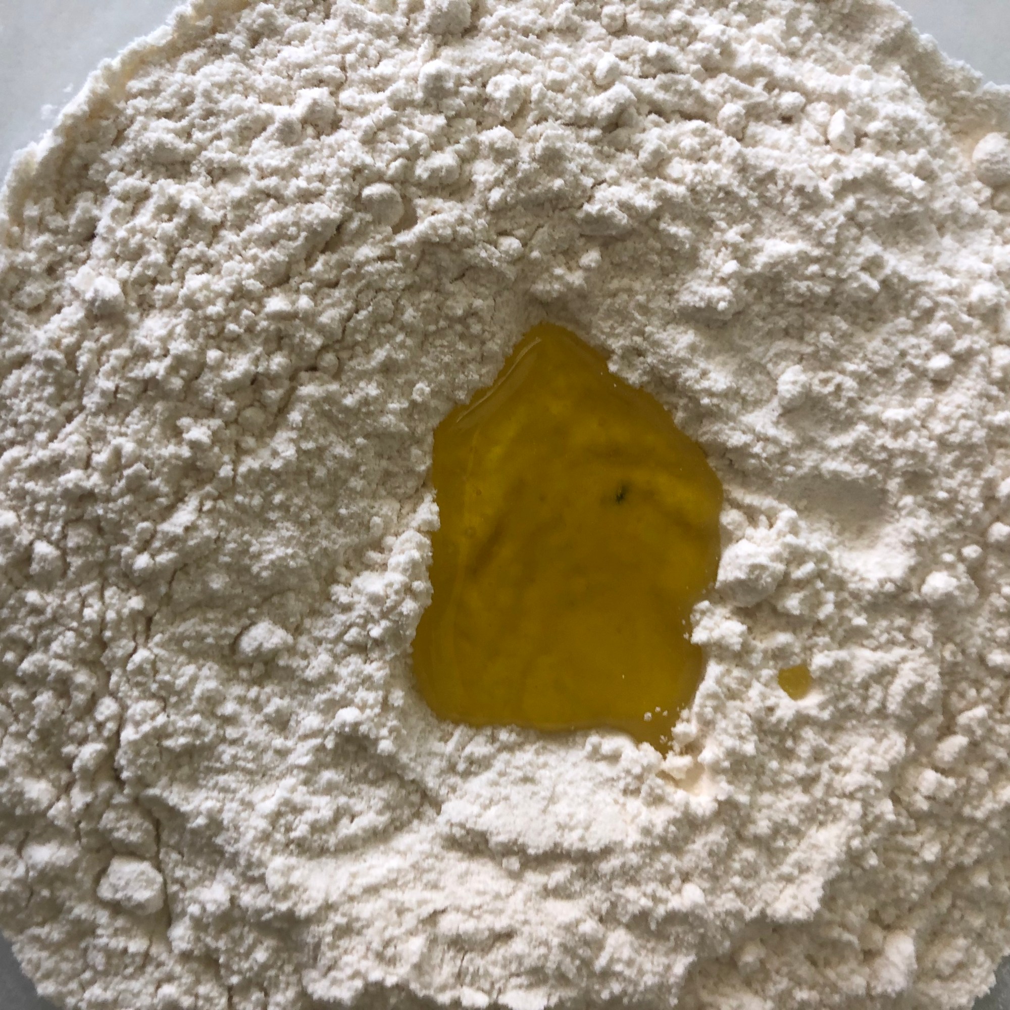 Prepara la masa. Para ello mezcla la harina con la sal en un recipiente. Haz un agujero en el centro y añade el aceite y el agua. Te aconsejo que añadas el agua de a poco para no pasarte. Integra la harina con los líquidos hasta que esté todo mezclado.