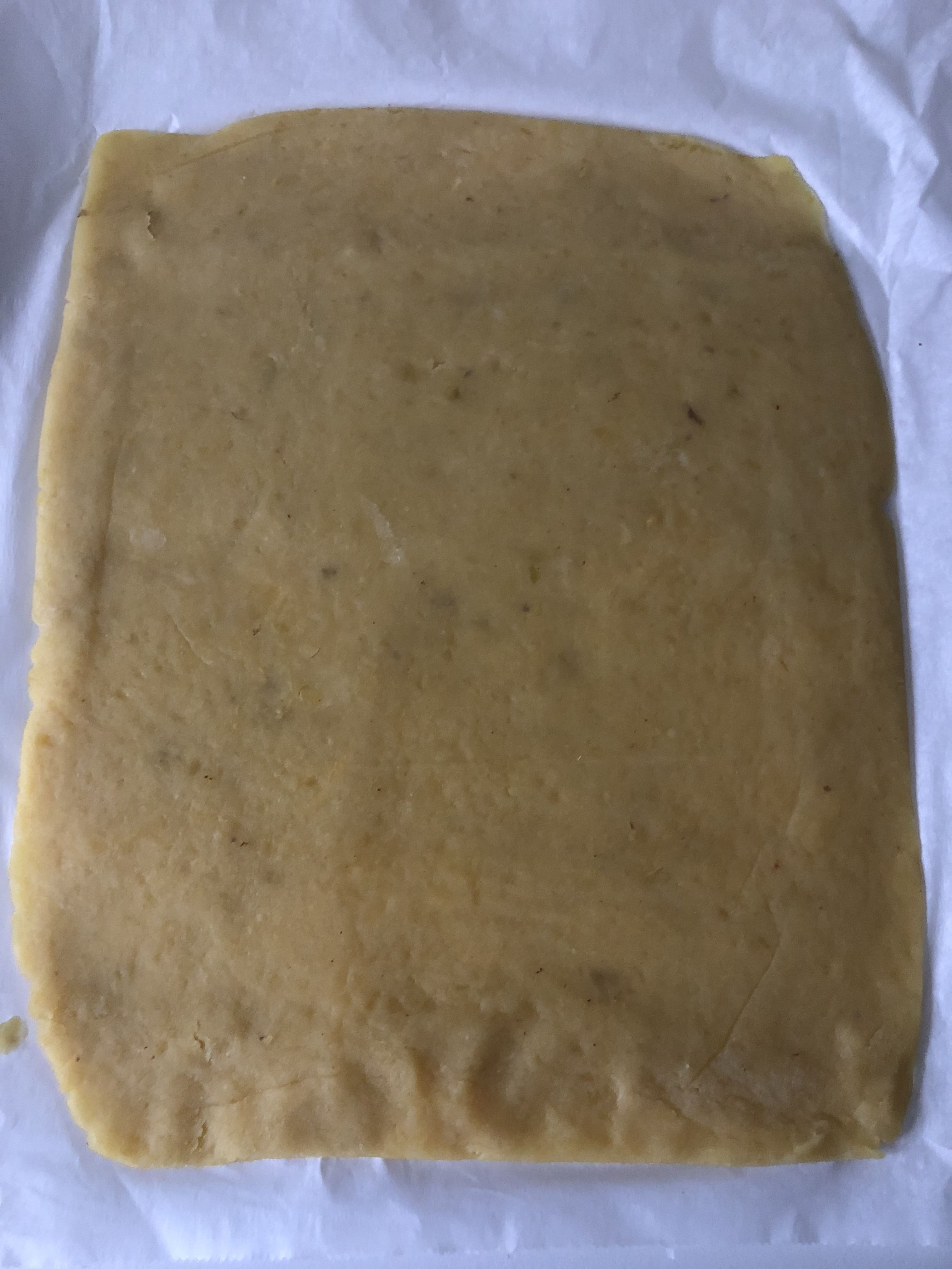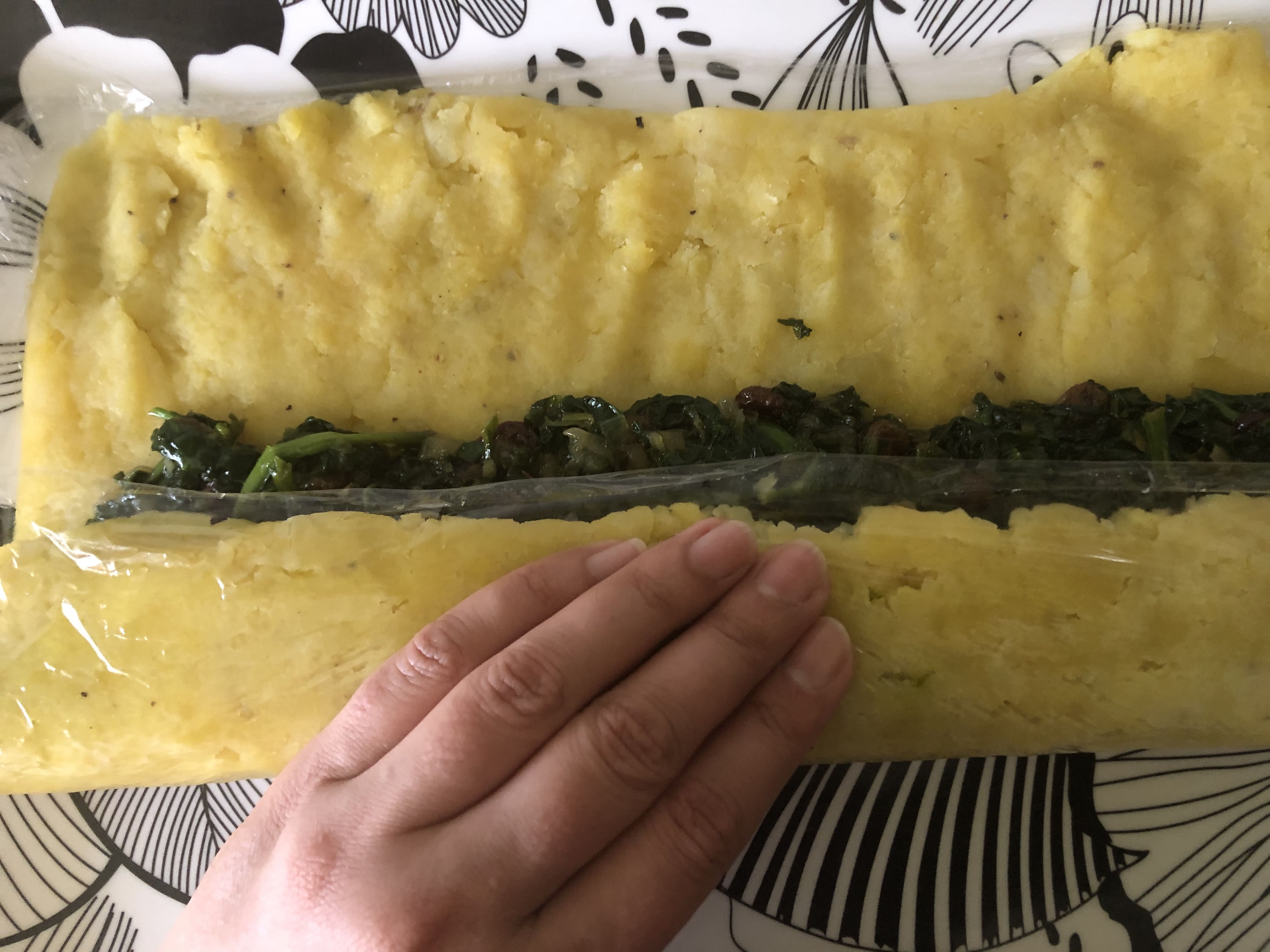 Sobre un papel film o papel de horno, estira el puré, dejando un grosor de un centímetro (yo lo hago con dos papeles sulfurizados). Encima, coloca el relleno de espinacas y estíralo por toda la superficie (menos un poquito) con ayuda de una espátula. Enrolla como si fuera sushi, intentando que quede compacto y soltando el papel a medida que vas enrollando.