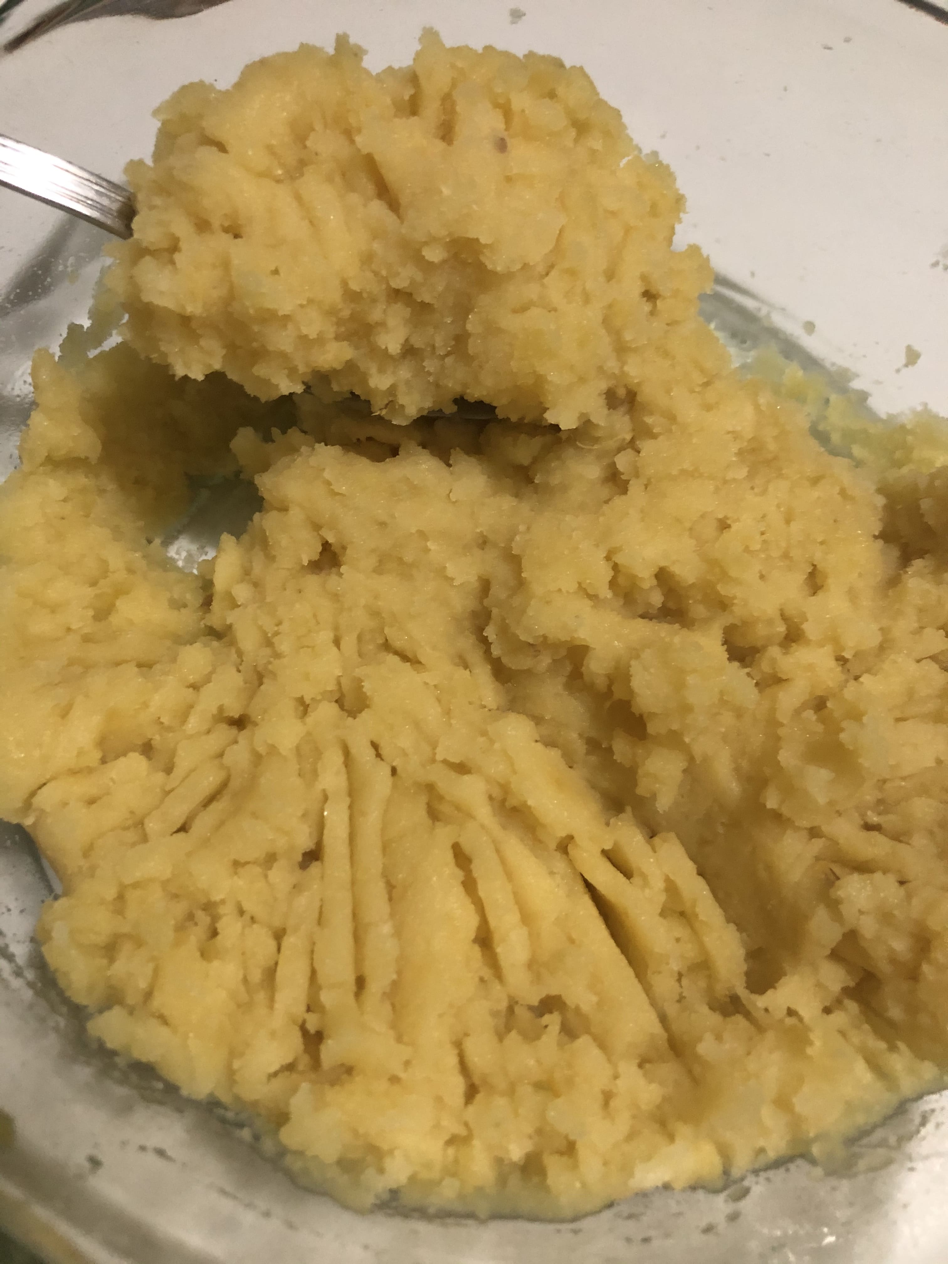 Lava bien las patatas y ponlas a cocer (con piel), en una cazuela con abundante sal hasta que estén blanditas (el tiempo dependerá del tamaño de la patata). Escurre el agua y pela las patatas aún calientes (¡cuidado con los dedos!). Tritura la pulpa con un tenedor hasta conseguir un puré fino. Puedes añadir un poco de sal, pimienta negra y un par de cucharadas de aceite de oliva. Pon las pasas en un vaso con agua caliente para que se hidraten. Lava las espinacas y córtalas en tiras de tamaño mediano.