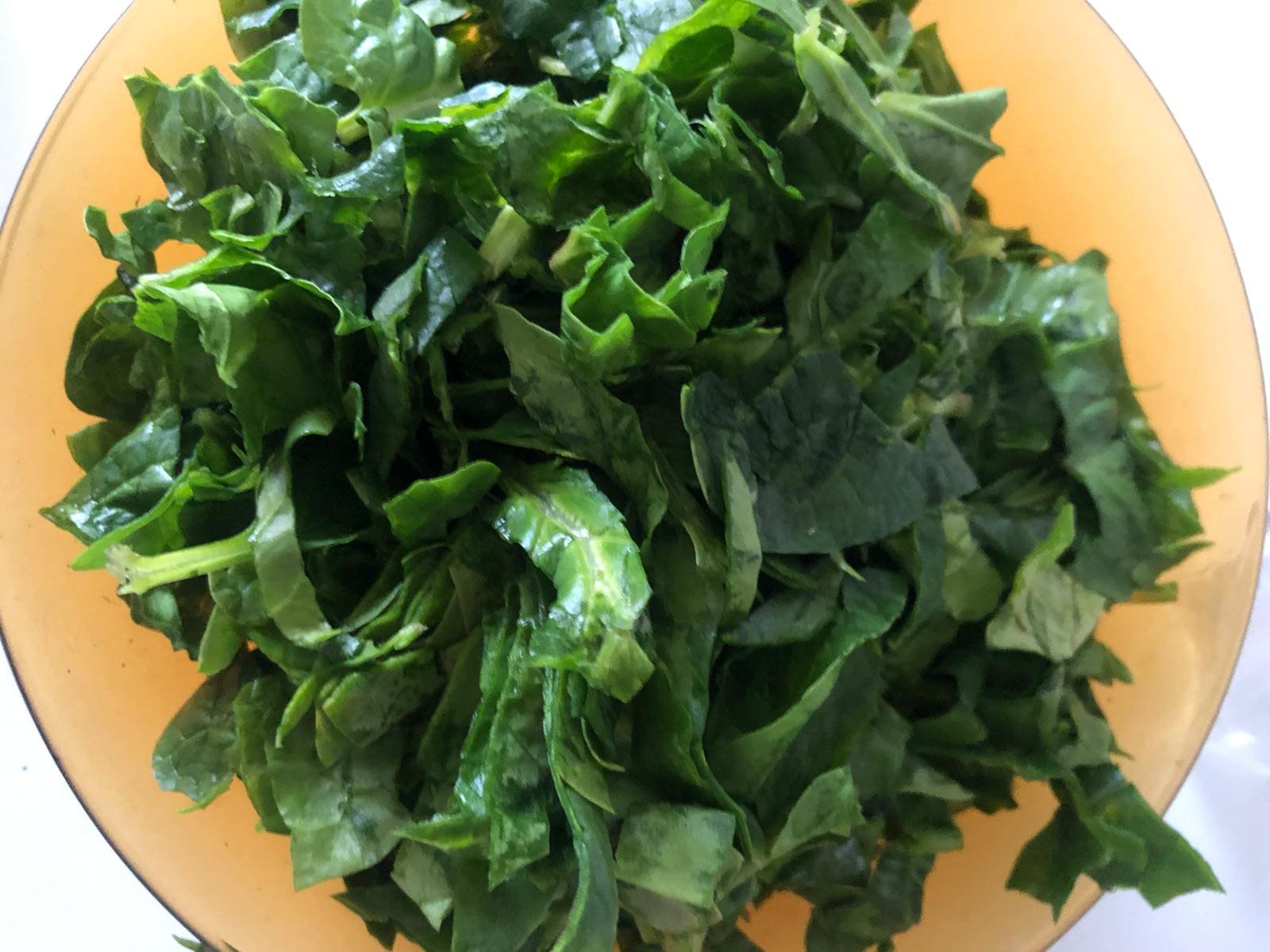 Hidrata las pasas en agua caliente durante unos 15-20 minutos. Lava las espinacas y córtalas en tiras de tamaño mediano.