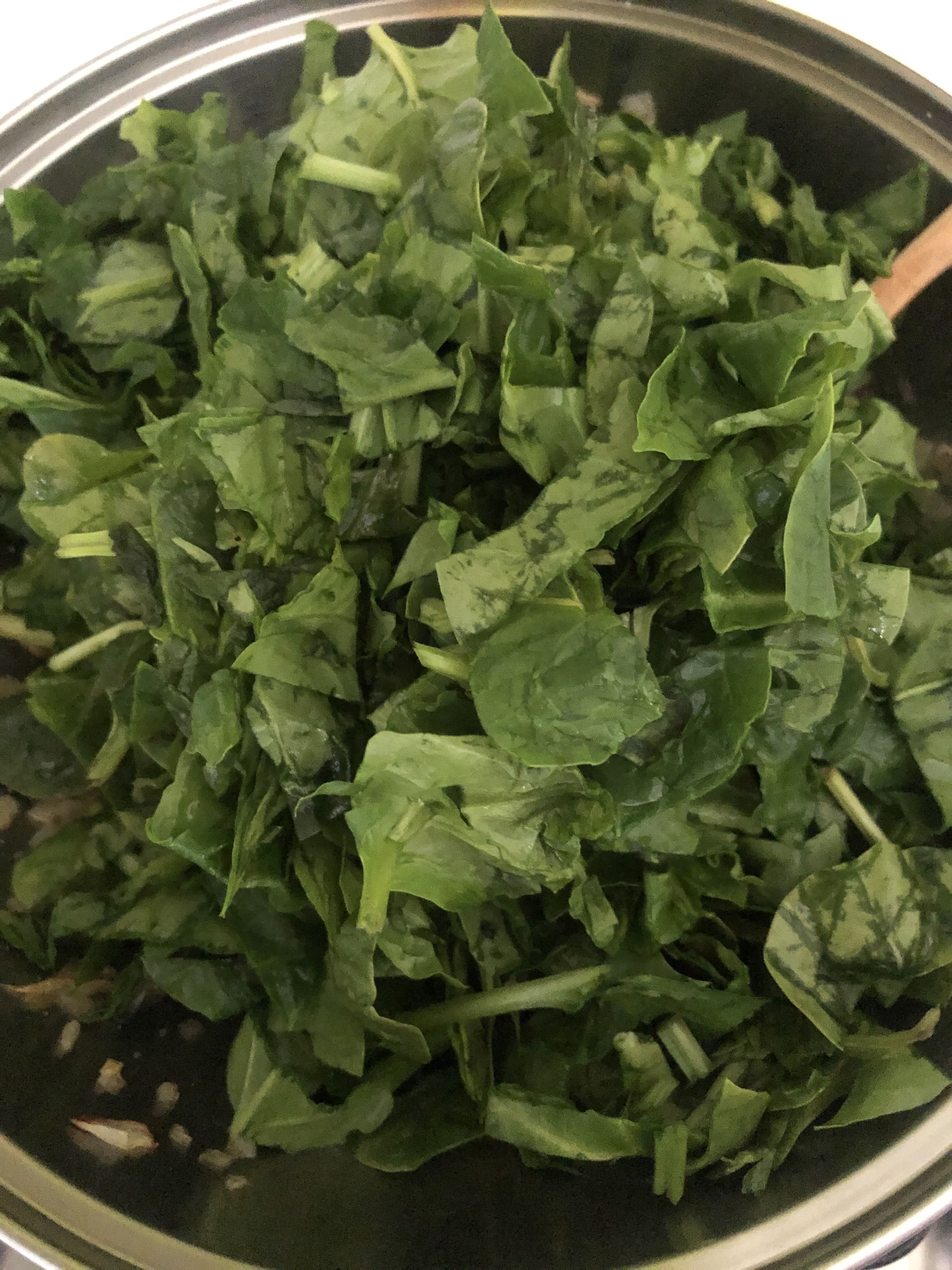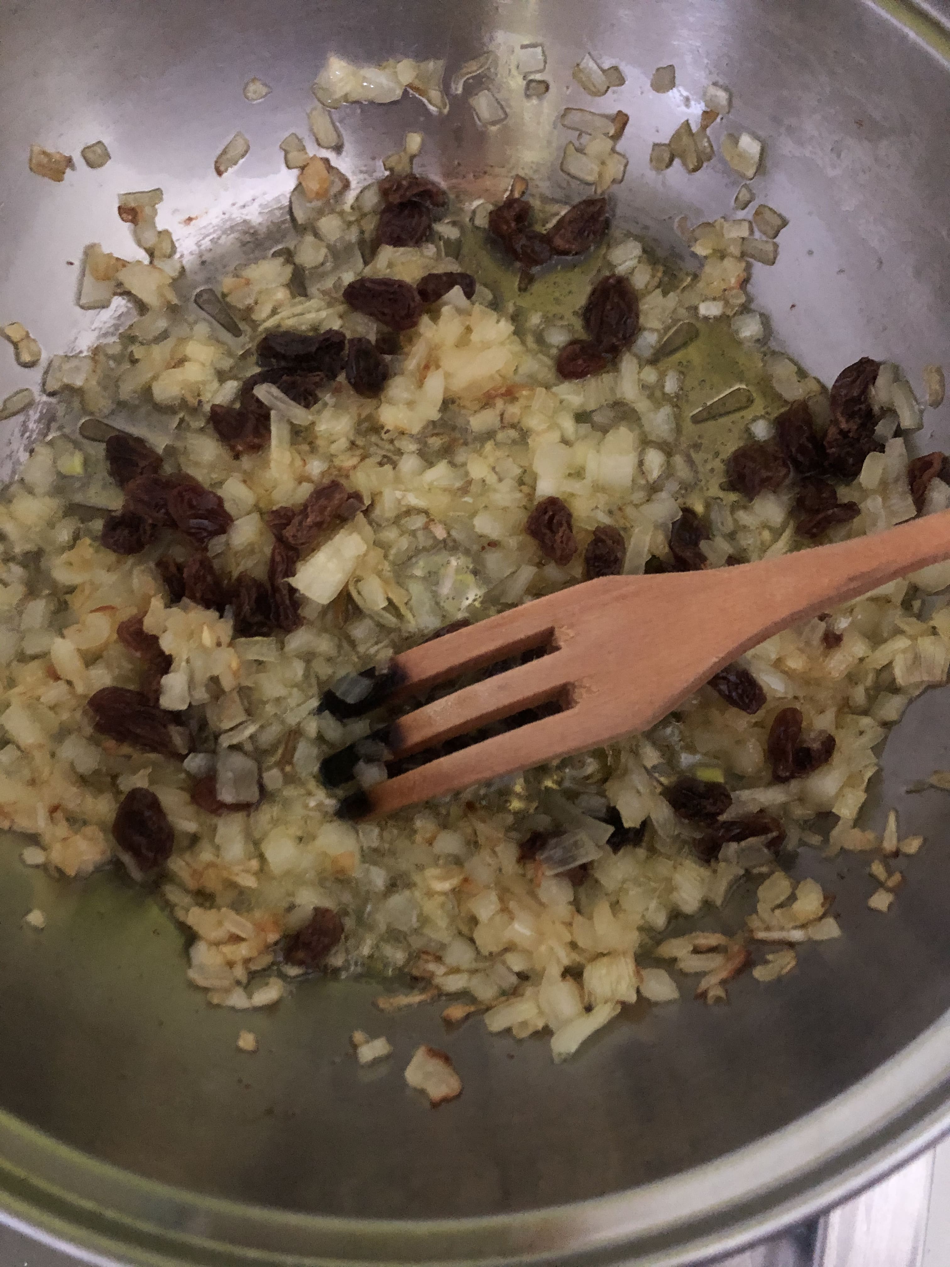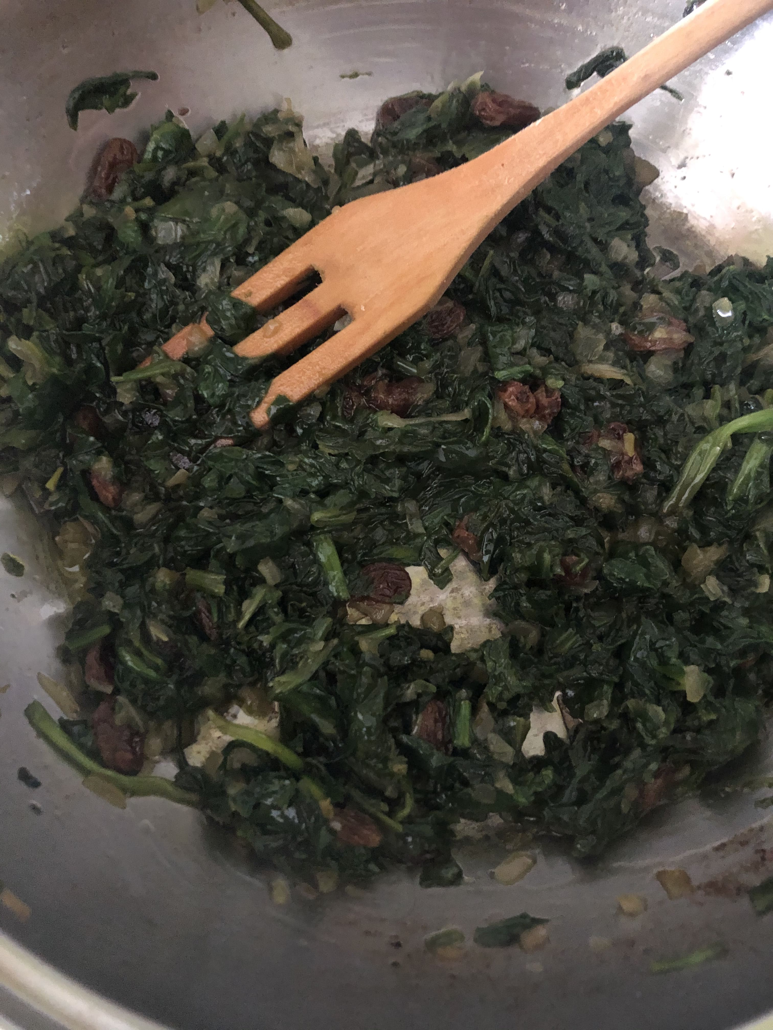 Pica la cebolla en brunoise y pocha en una sartén con un poco de aceite. Cuando transparente añade las espinacas y cocina hasta que estén tiernas. Escurre las pasas y agrega. Cocina hasta que se evapore el agua (la que suelta la espinaca) e intenta que la masa no quede muy húmeda. Deja enfriar.