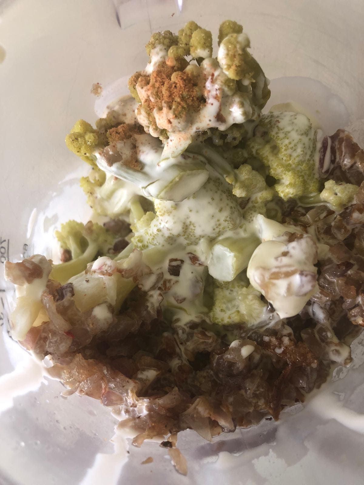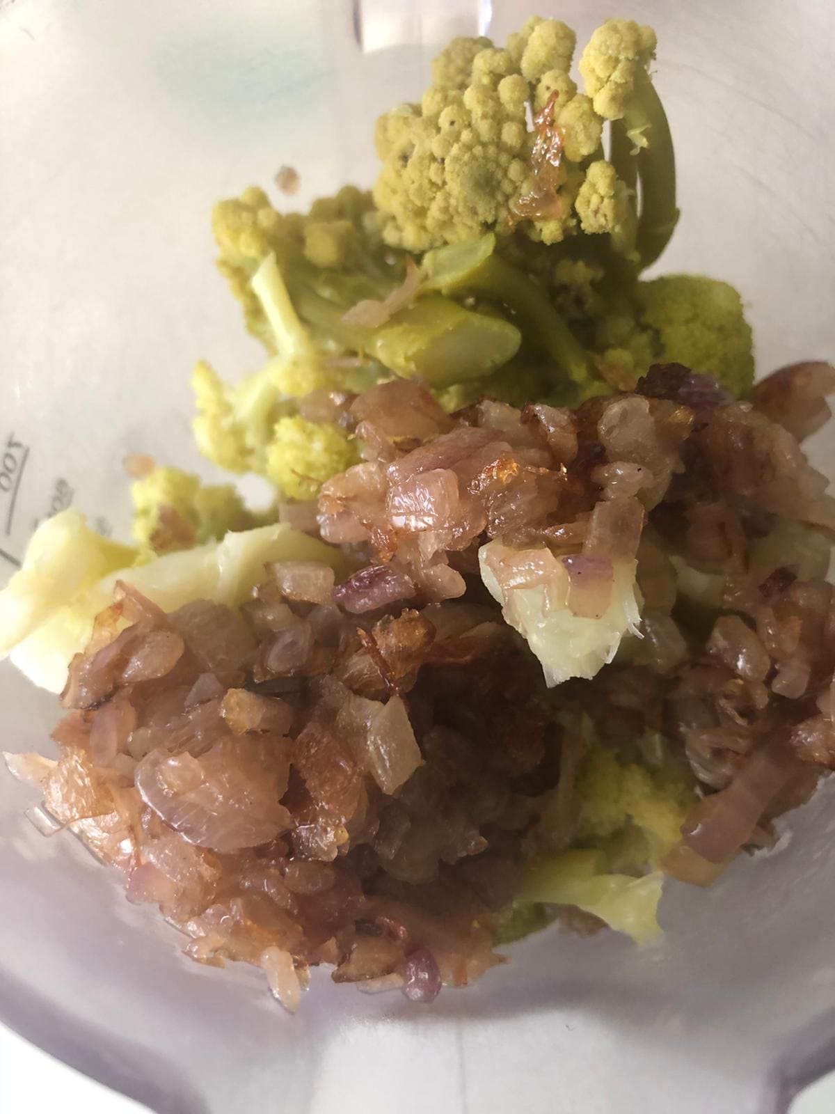 Cuando tengas todo listo, vierte el romanesco en el vaso de la batidora. Añade la cebolla, la sal, las especias y la leche y tritura hasta obtener una crema sin grumos.