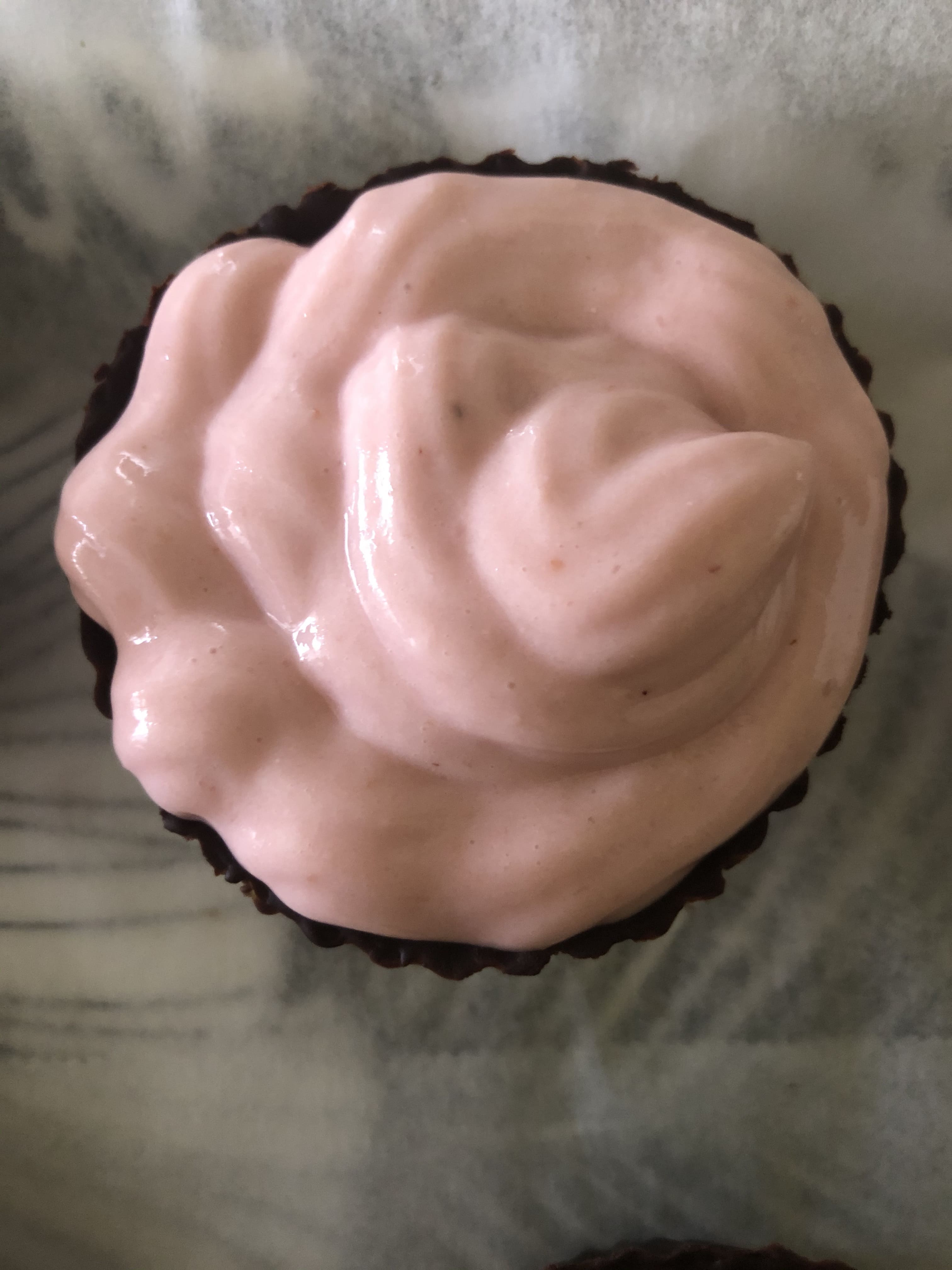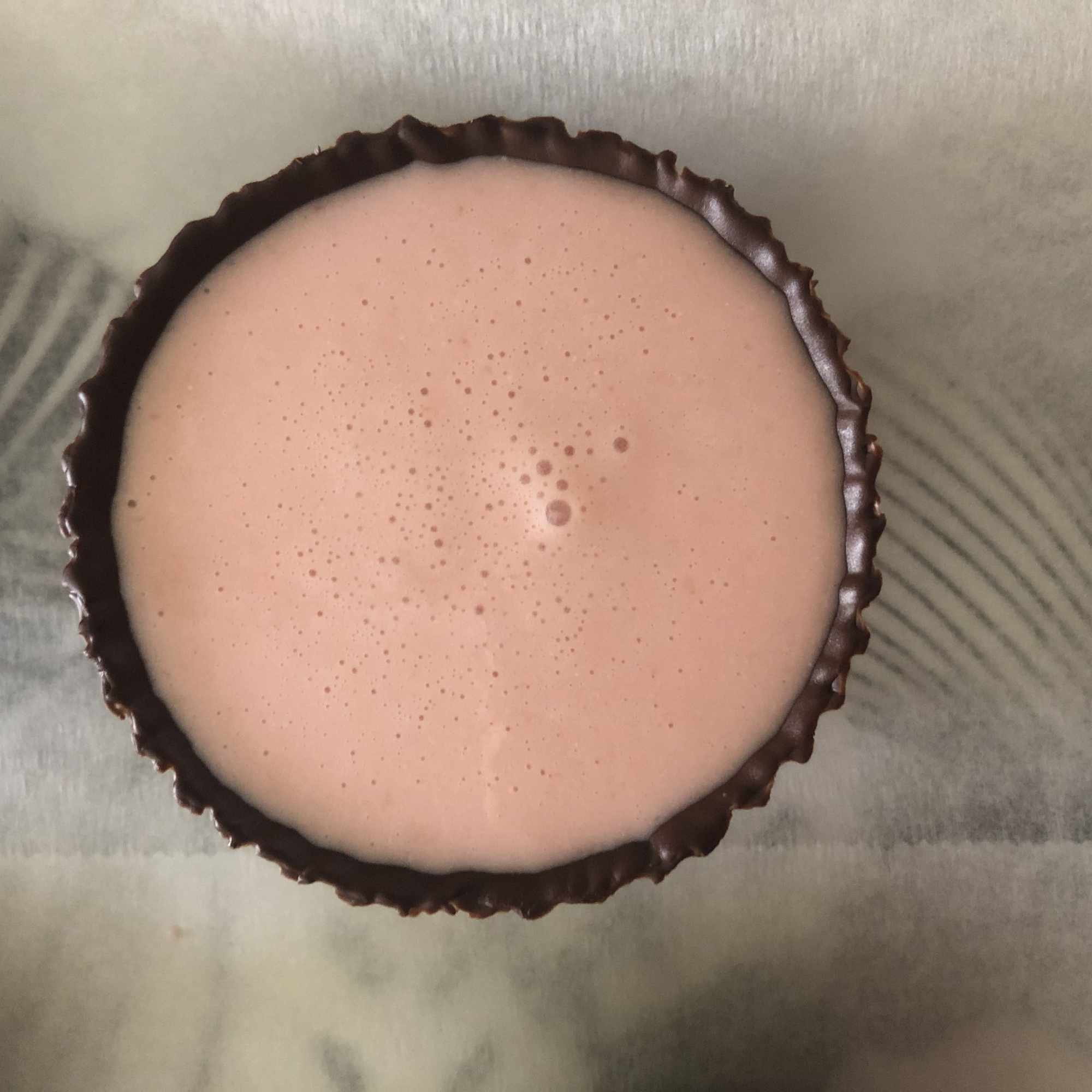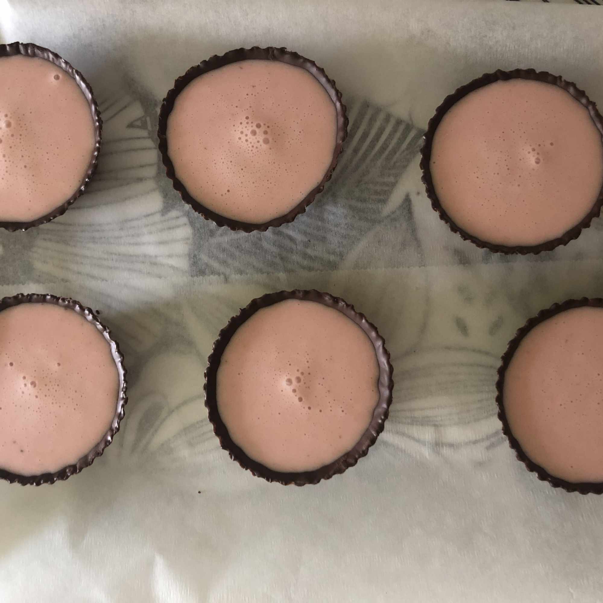 Saca las cestitas de chocolate del congelador (ya deben estar bien frías) y, con mucho cuidado, retira el envoltorio (bien los moldes de silicona o los de papel). Vierte la crema en las cestitas justo hasta el borde. Mete al frigo y deja que cuaje durante mínimo 6 horas (yo prefiero dejarlo toda la noche). Reserva lo que sobre de crema porque lo utilizaremos para decorar.