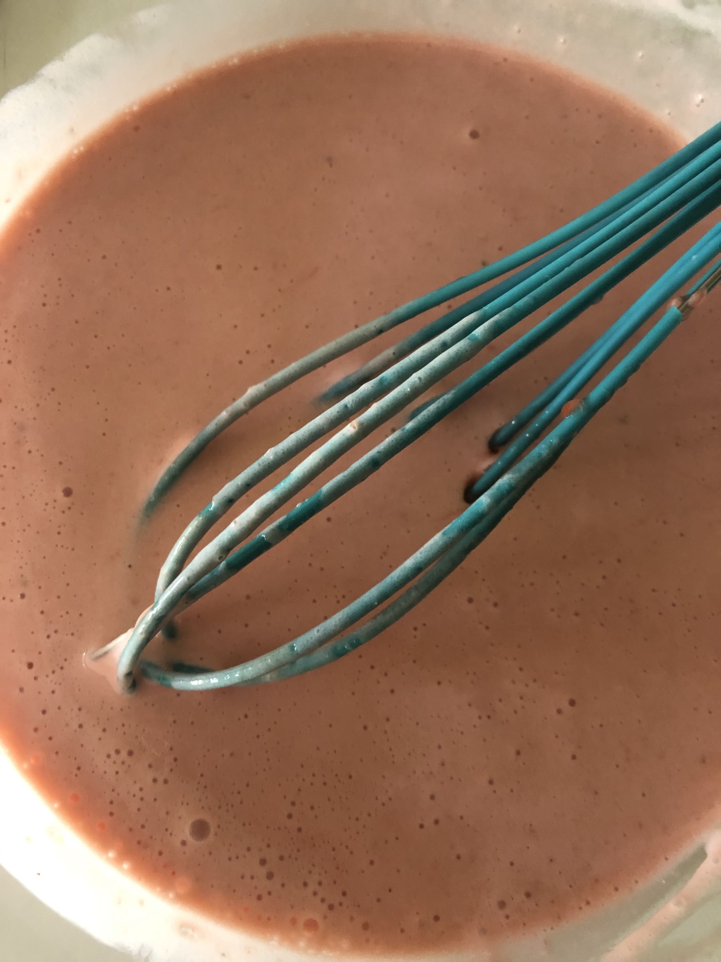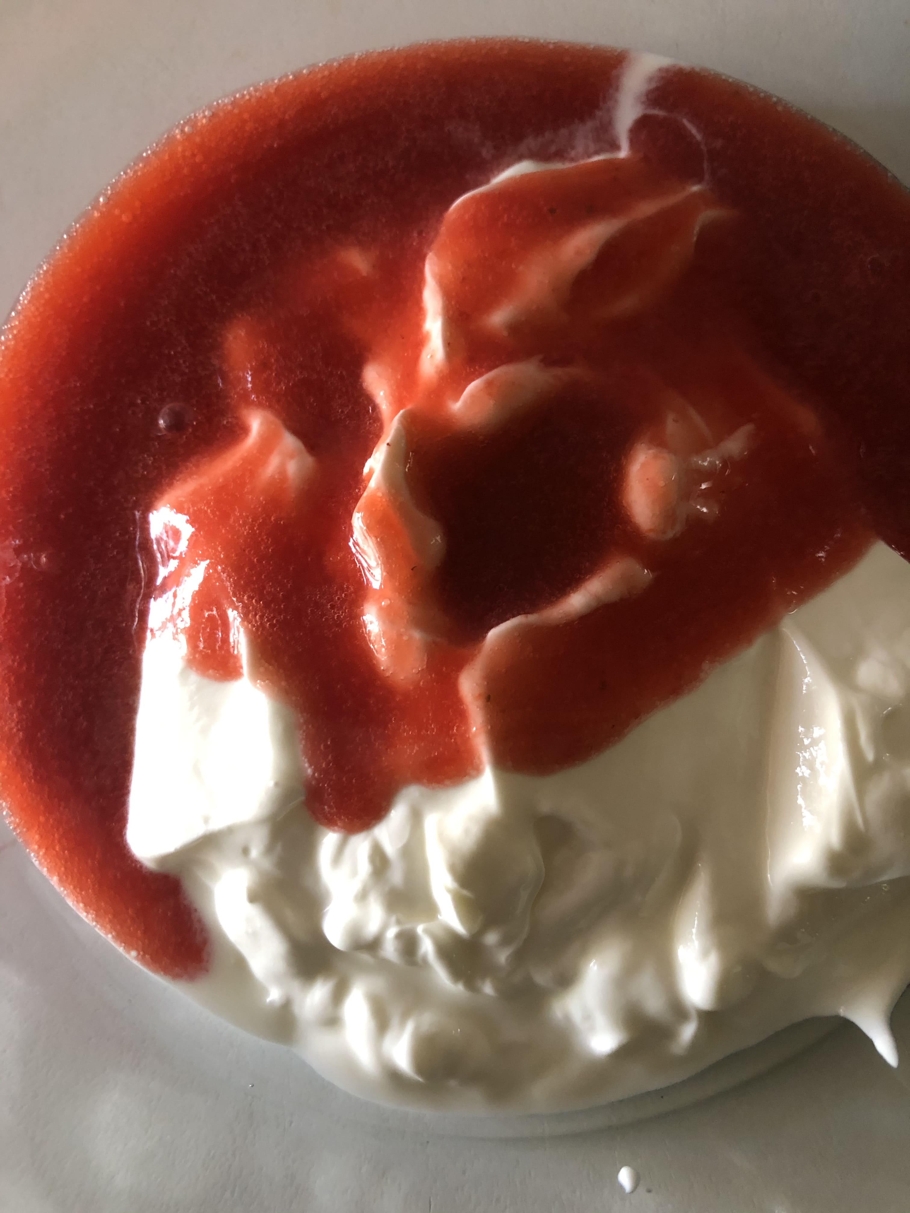 Cuela con un colador pequeño para retirar las pepitas (esto es opcional, yo prefiero hacerlo). Vierte el yogur en un bol y añade el puré de fresas. Mezcla con las varillas, con movimientos envolventes hasta integrar todo (ahora es el momento de rectificar el punto de azúcar).