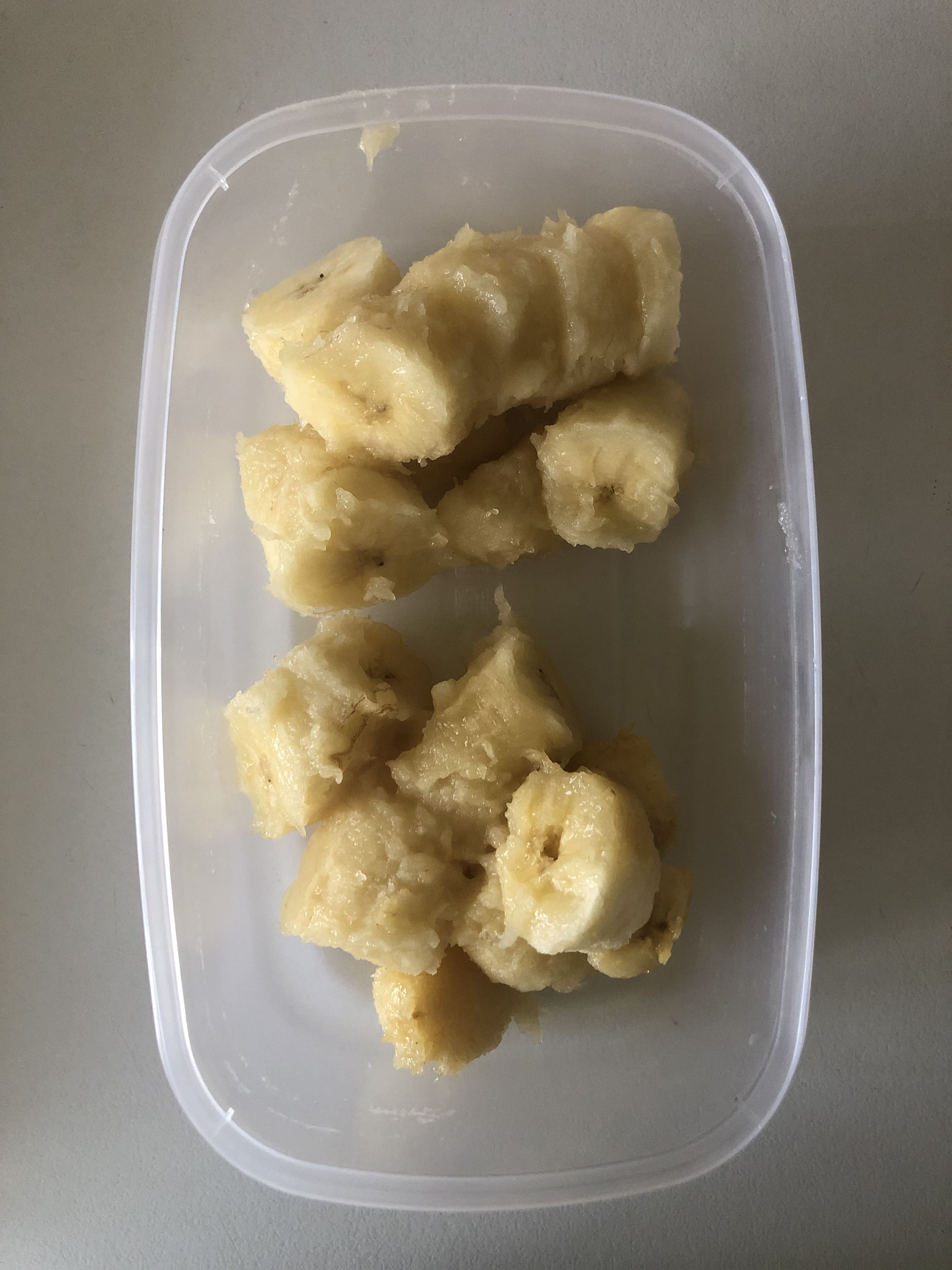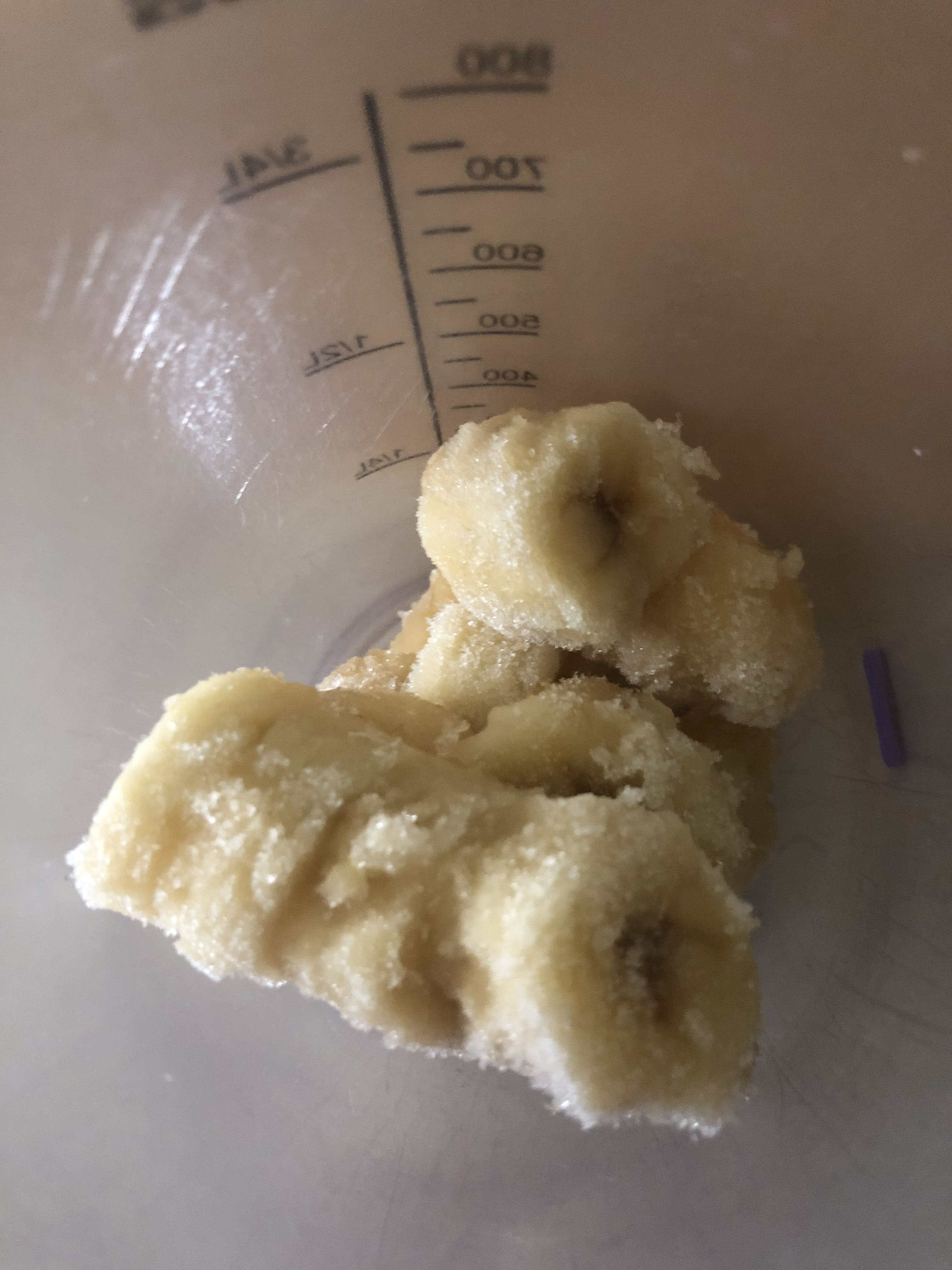 Pelas los plátanos, córtalos en rodajas y congela (yo lo suelo dejar toda la noche).