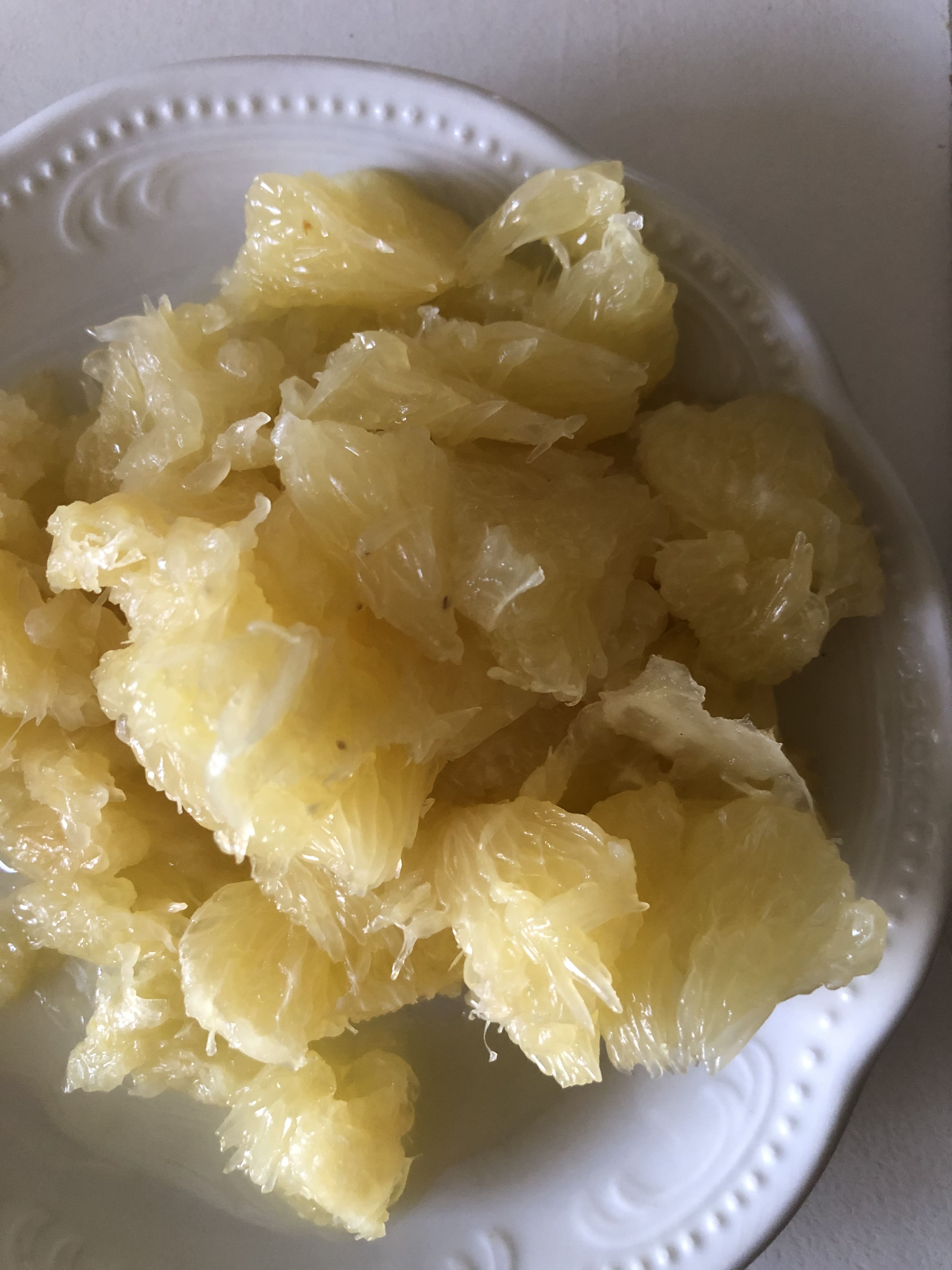 Pela el pomelo y extrae la pulpa de los gajos, intentando eliminar la parte blanca de la piel. Para ello, levanta la piel del gajo con la punta del cuchillo, saca la pulpa con los dedos o una cucharilla y así hasta que termines (un poquito de paciencia, por favor).