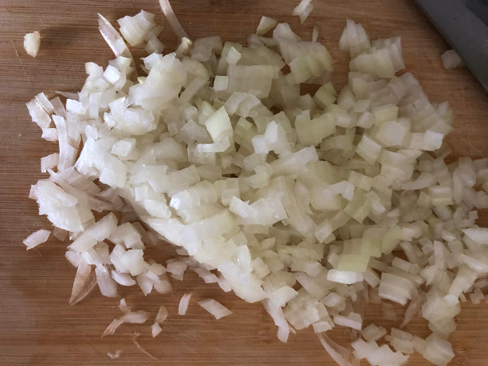 Saca la placa de hojaldre de la nevera y deja que se atempere para el momento de usarla. Mientras tanto, elimina la piel del salmón y córtalo en cubos de tamaño mediano. Corta la cebolla en brunoise y pocha en una sartén con un poco de aceite.