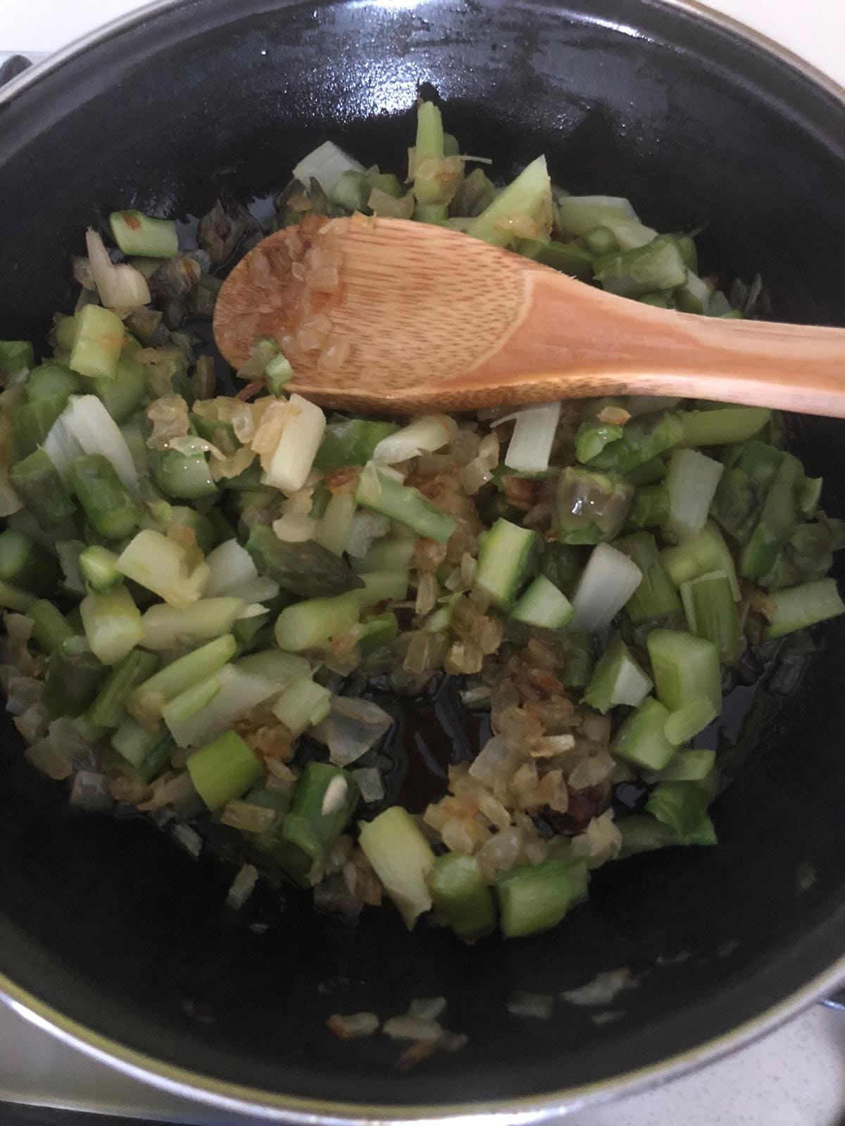 Primero, lava y limpia los espárragos. Elimina la parte de atrás, que está más dura y retira la piel con un rallador (así los tendrás limpios y tiernos de manera rápida). En una cazuela, pon agua con sal y, cuando empiece a hervir, añade los espárragos y blanquéalos durante unos 5 minutos. Escurre y deja enfriar y eliminar el exceso de agua. Una vez fríos, córtalos en trozos y reserva (deja algunos enteros para decorar).
