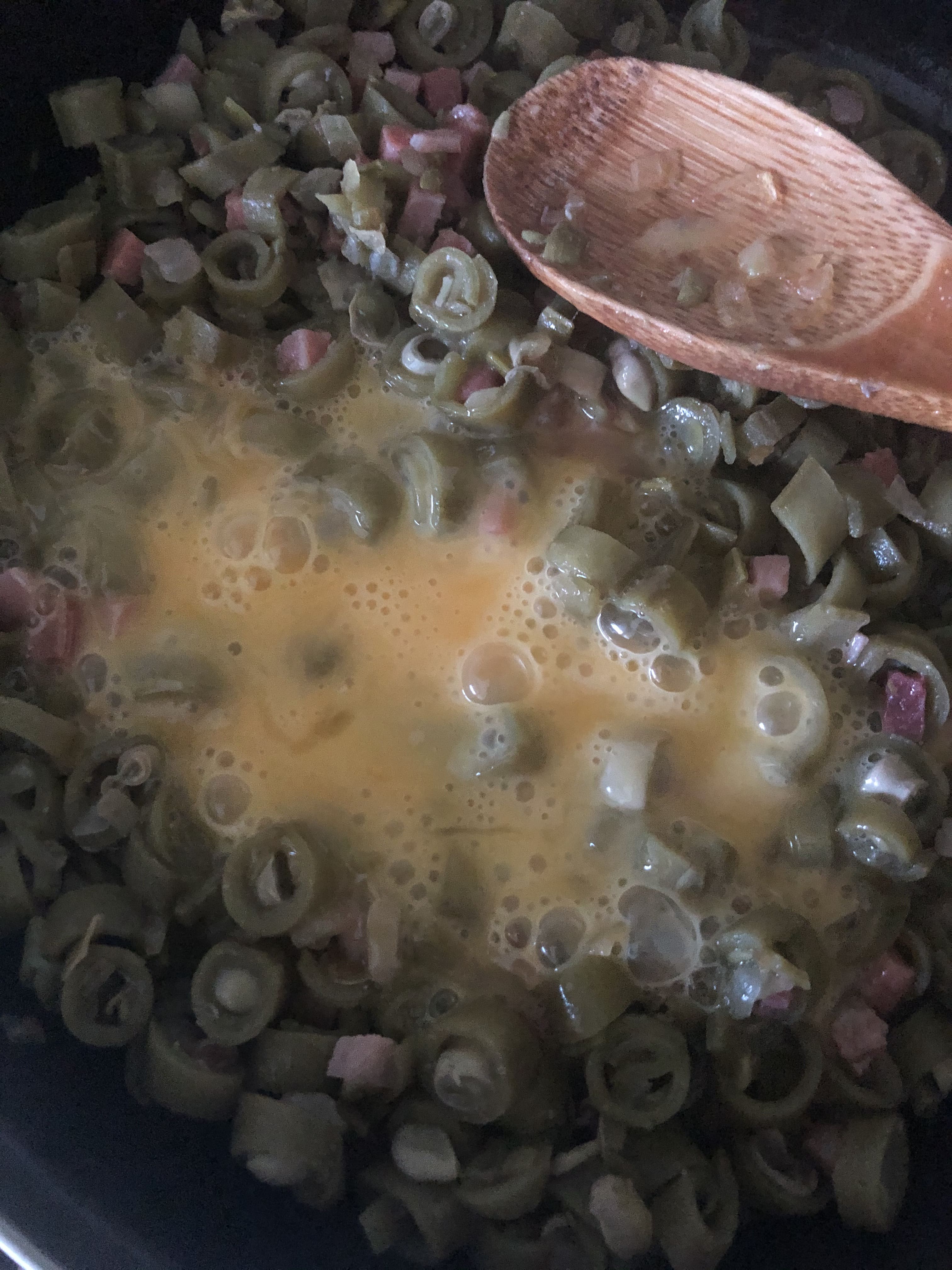 Corta la cebolla en brunoise y pocha en una sartén con aceite suficiente. Cuando esté transparente, añade las habas y mezcla todo bien durante unos minutos. Agrega los taquitos de jamón y cocina un minuto más, lo justo para que cambie de color. Bate los huevos e incorpora a la sartén.