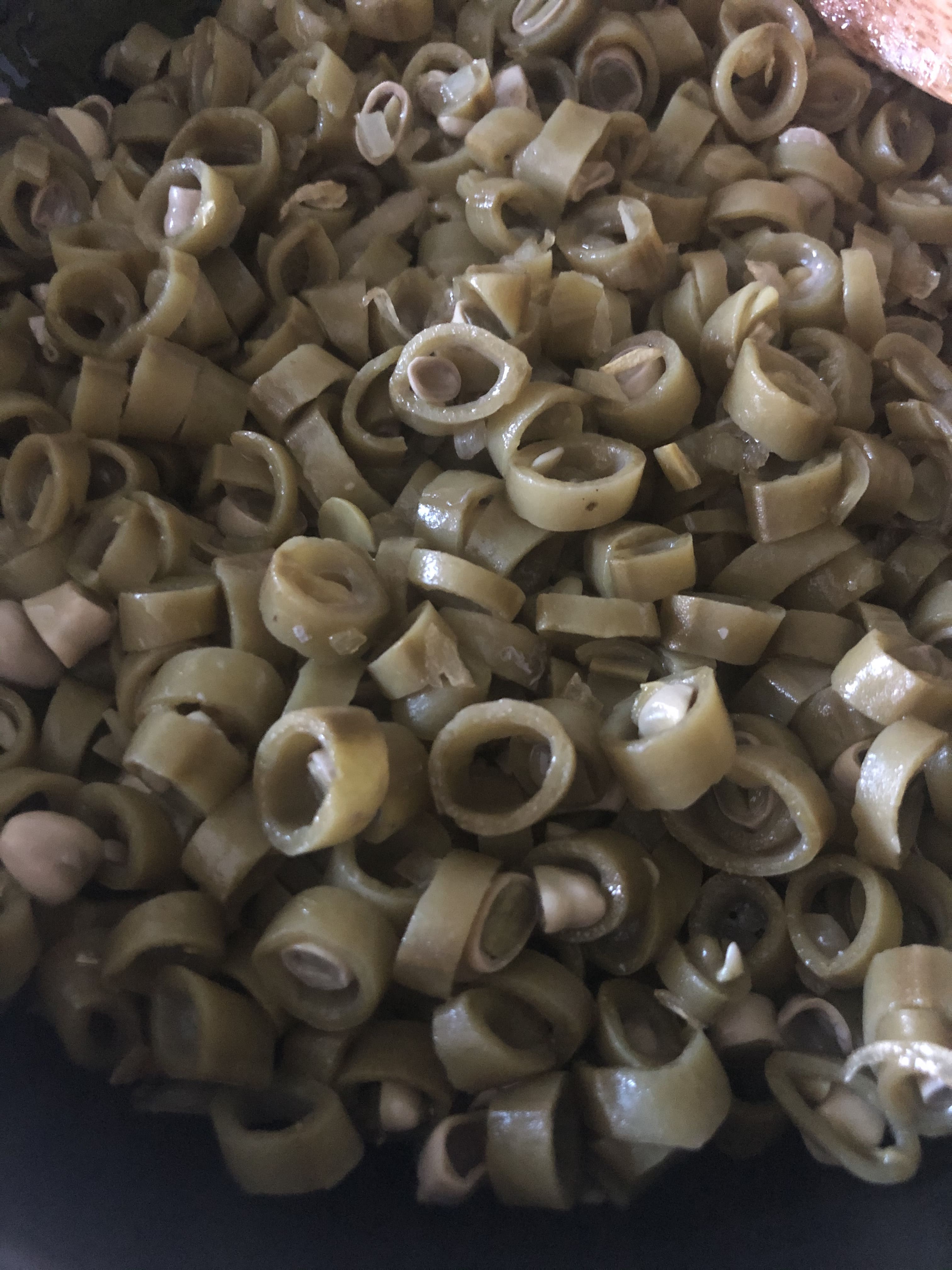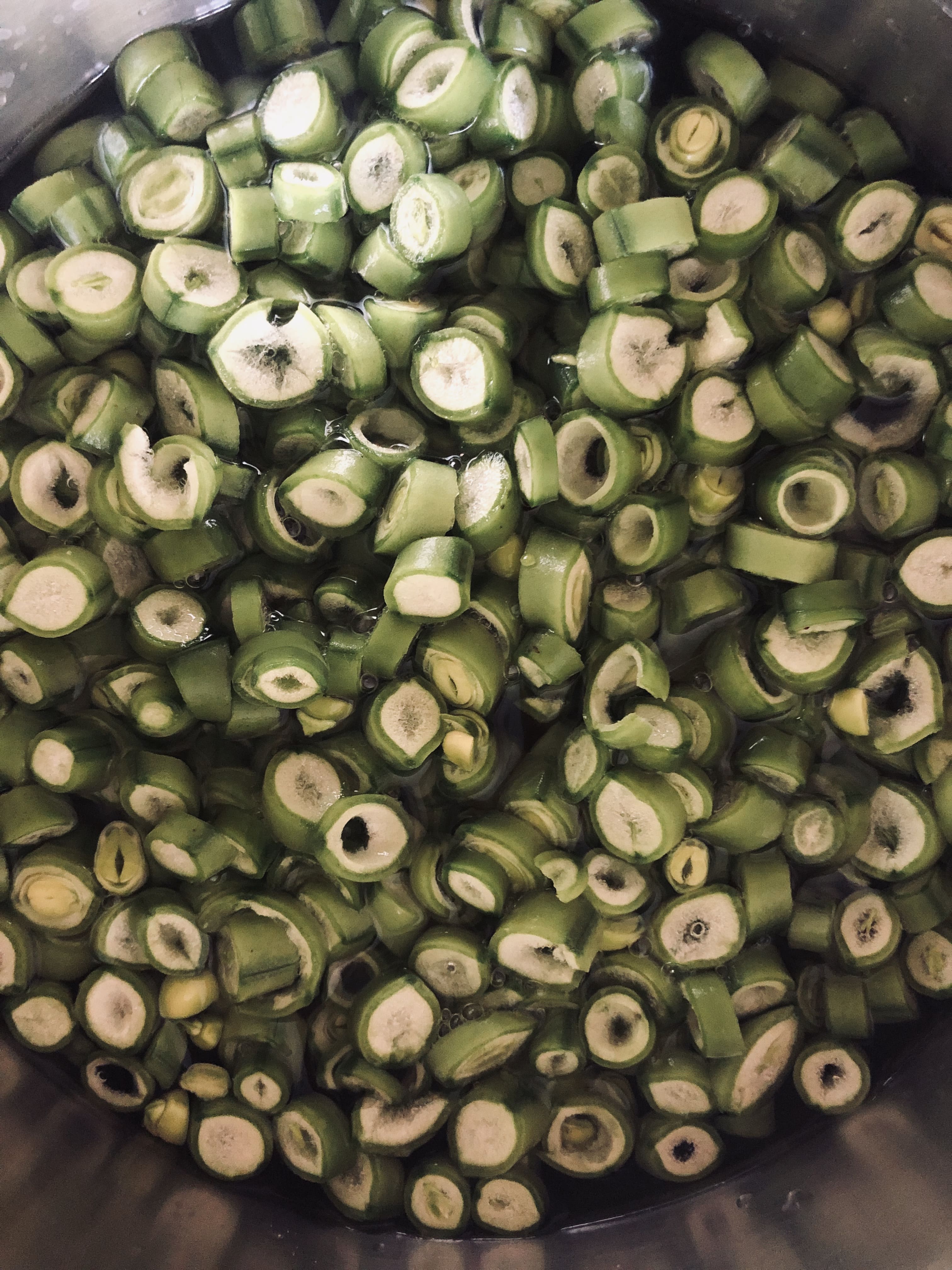 En una cazuela grande, pon abundante agua con sal a hervir. Mientras tanto, Lava las habas y córtales los extremos. Una vez hecho esto, córtalas en rodajitas de 1/2 centímetro de grosor. Cuando el agua empiece a hervir, añade las habas y cuece durante unos 35 minutos o hasta que estén tiernas. Escurre y reserva.