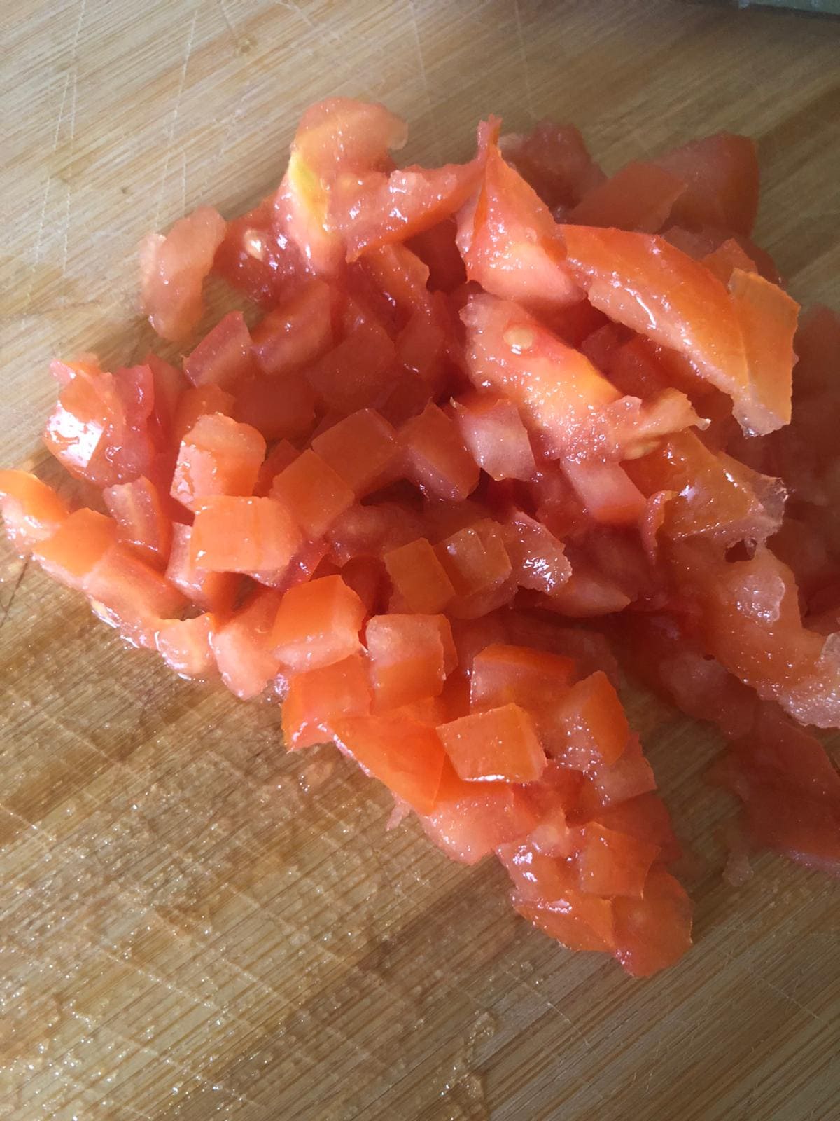Corta el aguacate a la mitad, extrae la semilla y saca la pulpa con ayuda de una cuchara. Coloca en un plato y tritúrala con ayuda de un tenedor (no hace falta que quede papilla). Lava los tomates, córtalos a la mitad y retira la pulpa. Corta la parte más dura en cuadraditos (no utilizo la pulpa para evitar que la receta quede demasiado acuosa). Corta la cebolla en brunoise y exprime el zumo de limón.