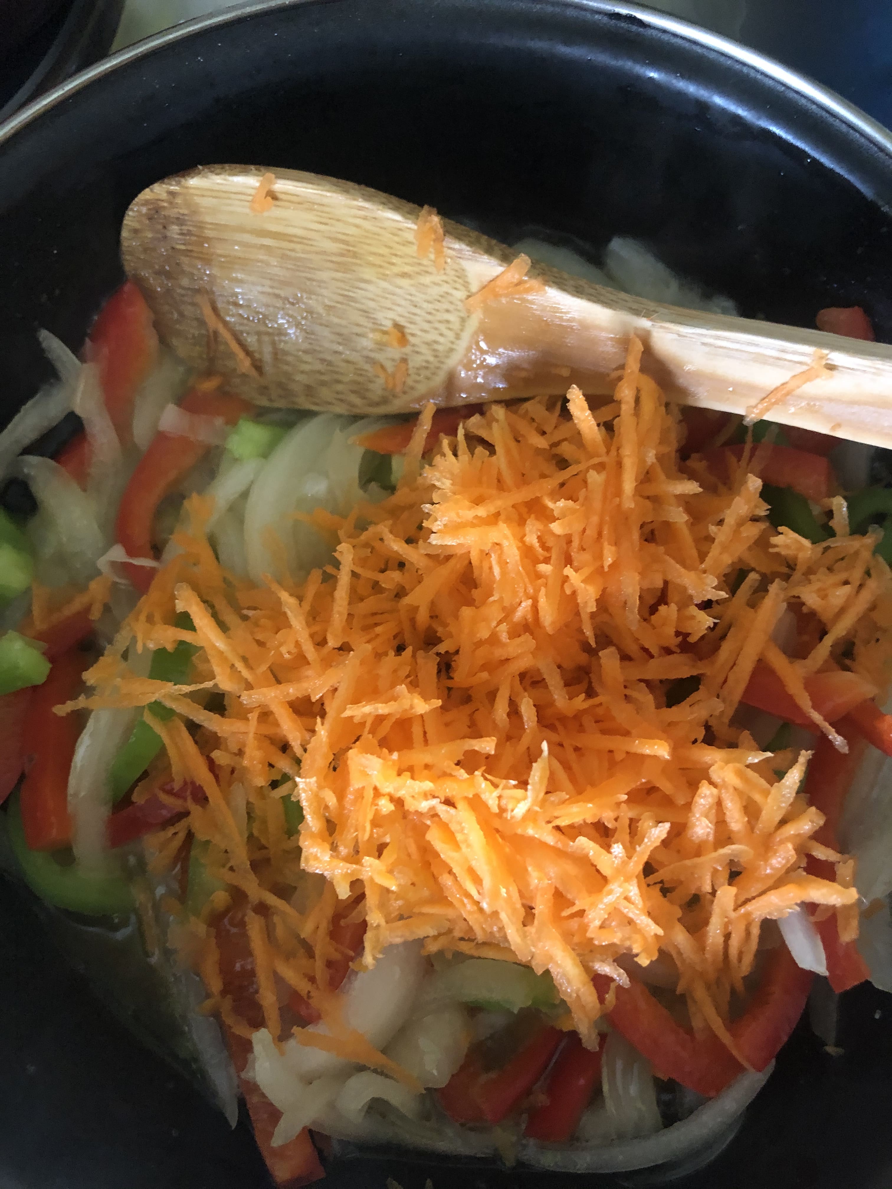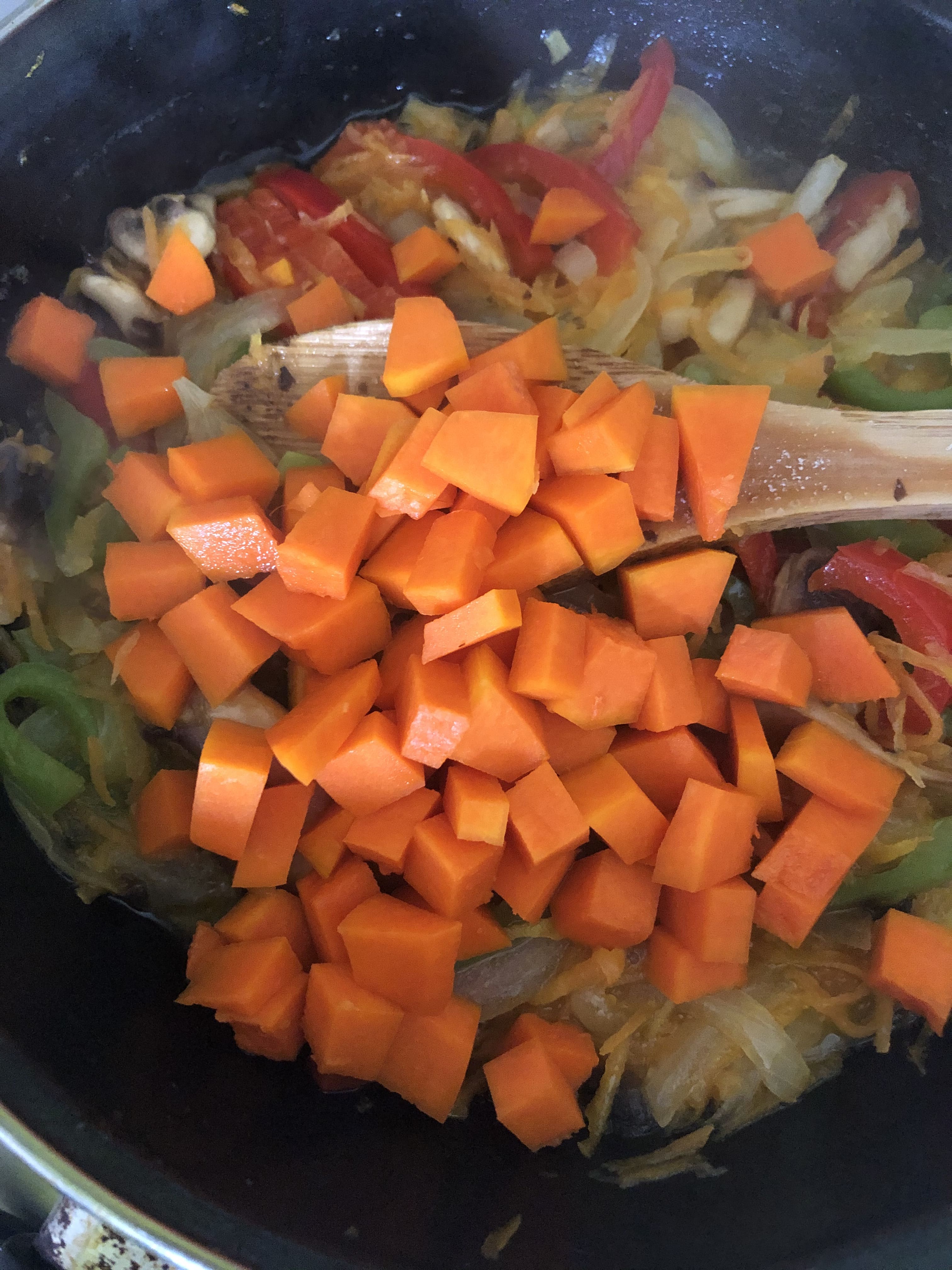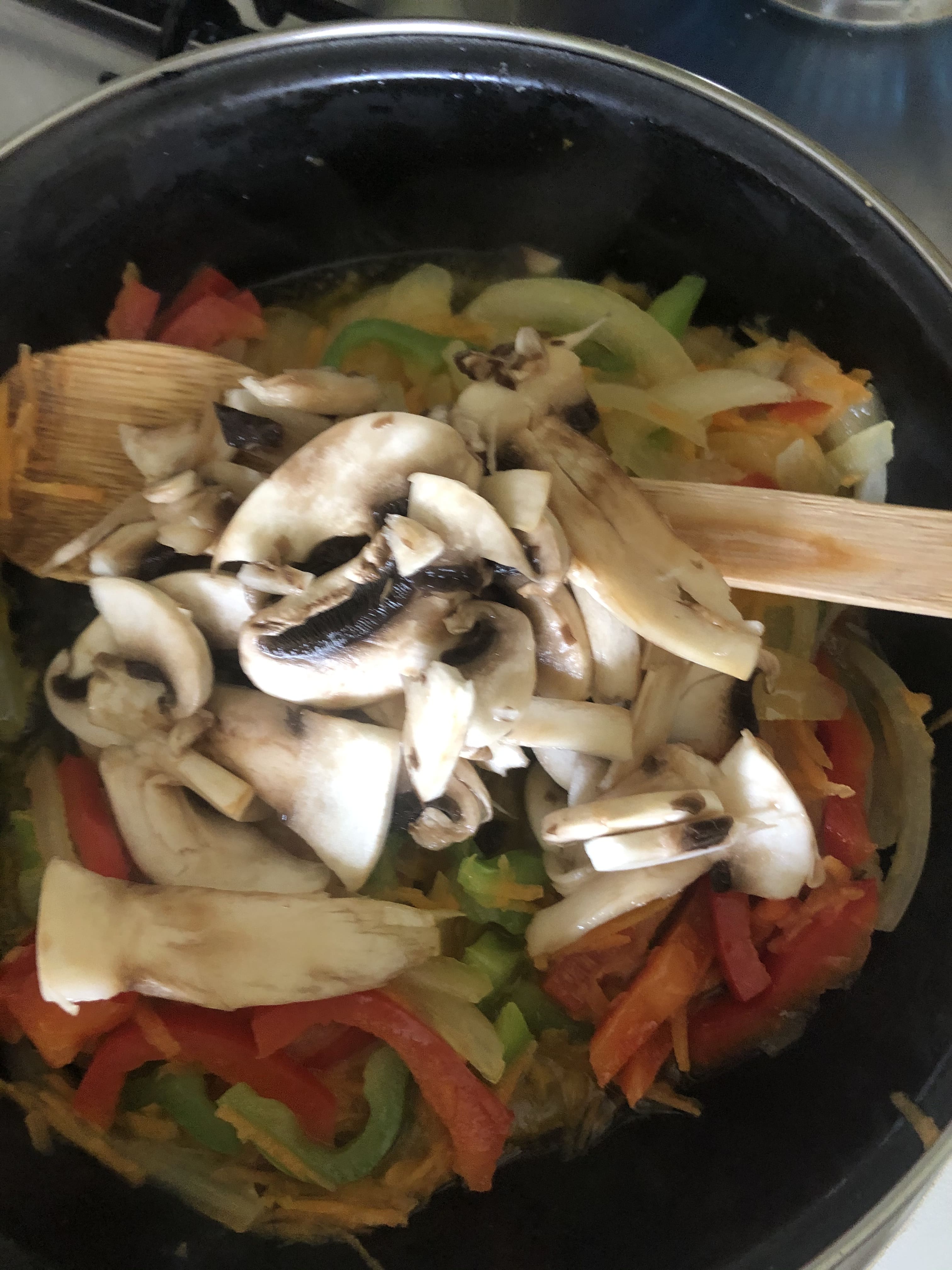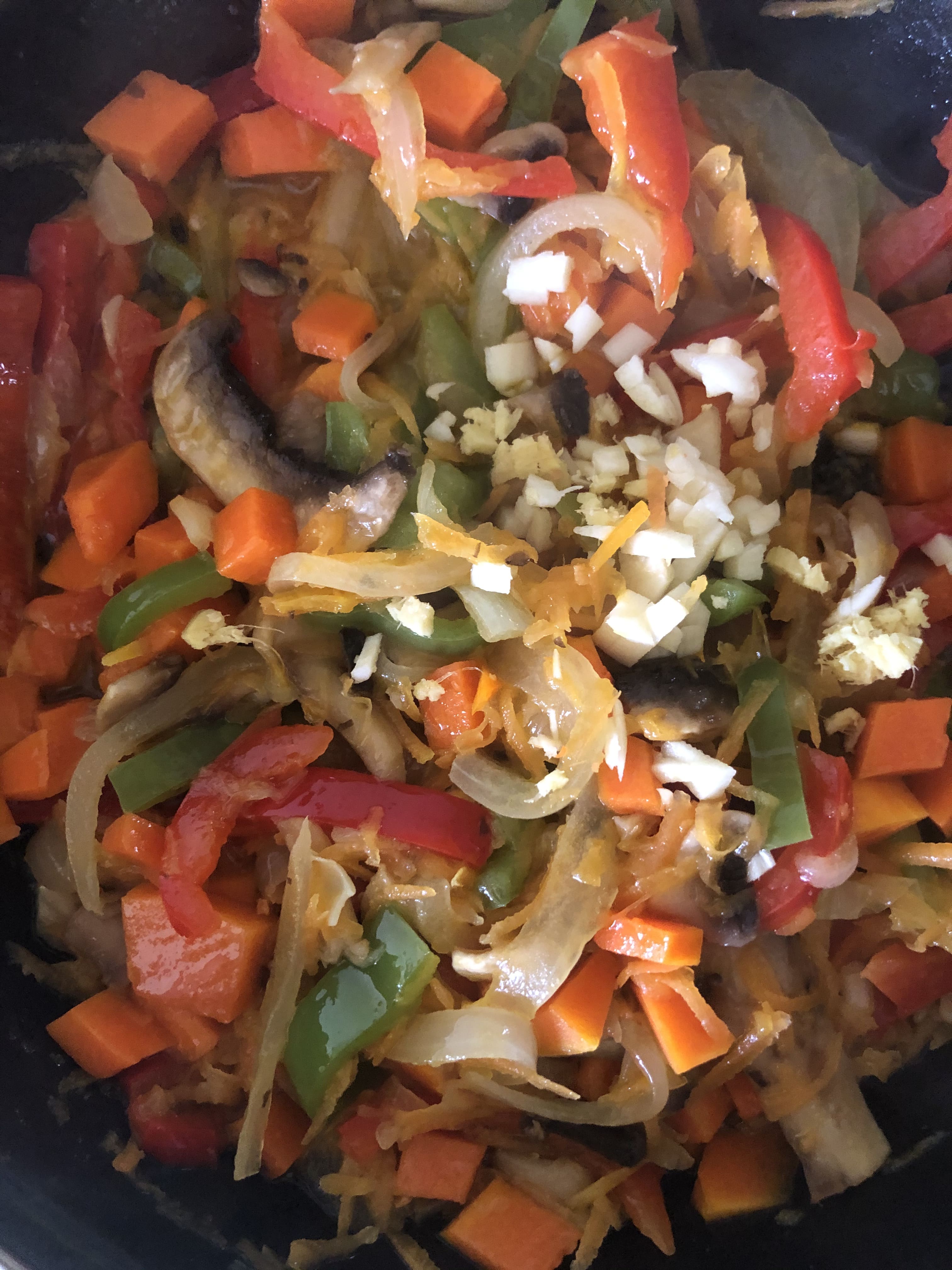 En la olla, vierte un poco de aceite y prepara un sofrito con las verduras. Primero pocha la cebolla. Cuando empiece a transparentar, añade el pimiento y cocina unos minutos. Después, la zanahoria rallada. Cuando esté un poco blanda, agrega los champiñones y, por último, la calabaza. Cuando estén todas las verduras, agrega el machado de ajo y jengibre y mezcla todo bien.