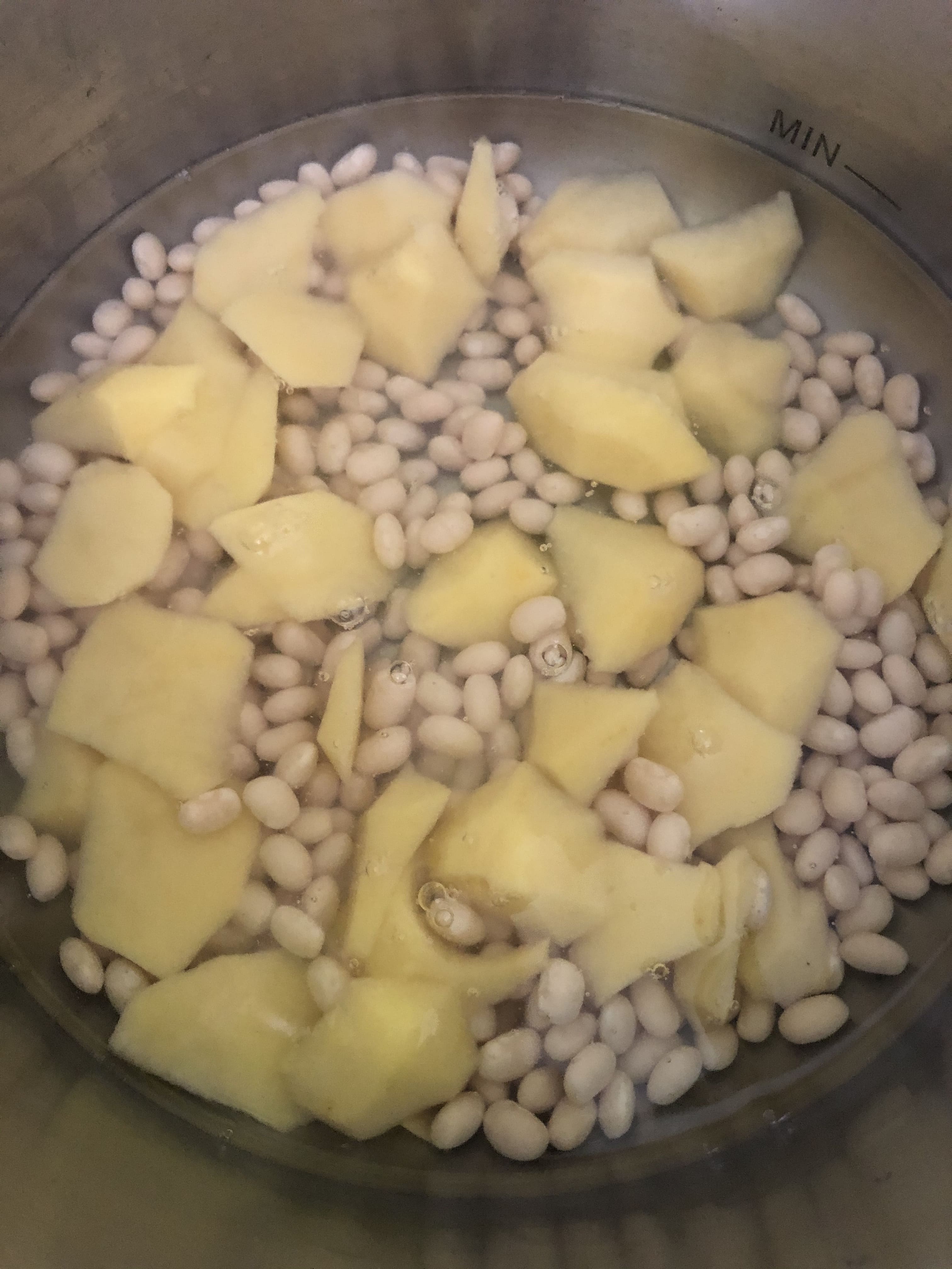 Deja en remojo las alubias durante al menos 8 horas (yo prefiero dejarlas toda la noche). Retira el agua y aclara bien. Pela las patatas, lávalas y córtalas en láminas más o menos gruesas. Pon las alubias y las patatas a cocer en una olla con abundante agua y sal (yo tardé unos 15 minutos en olla rápida). Escurre el caldo y reserva.