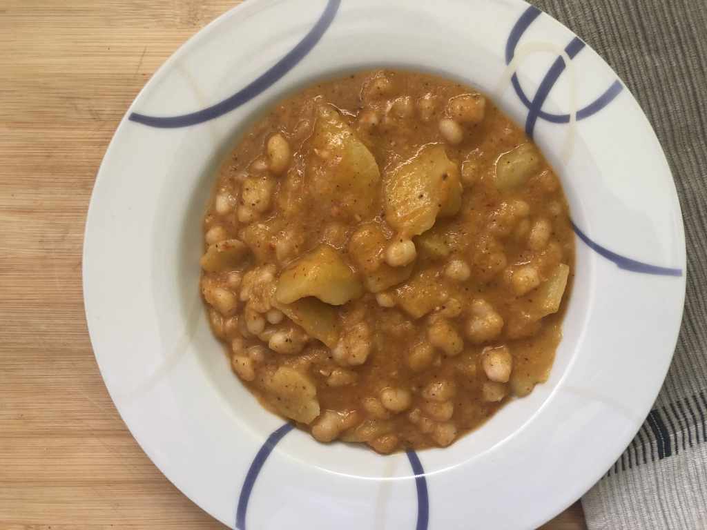 Vuelve a poner esta crema al fuego, agrega las alubias y las patatas y da un hervor. Sirve calentito y a disfrutar.