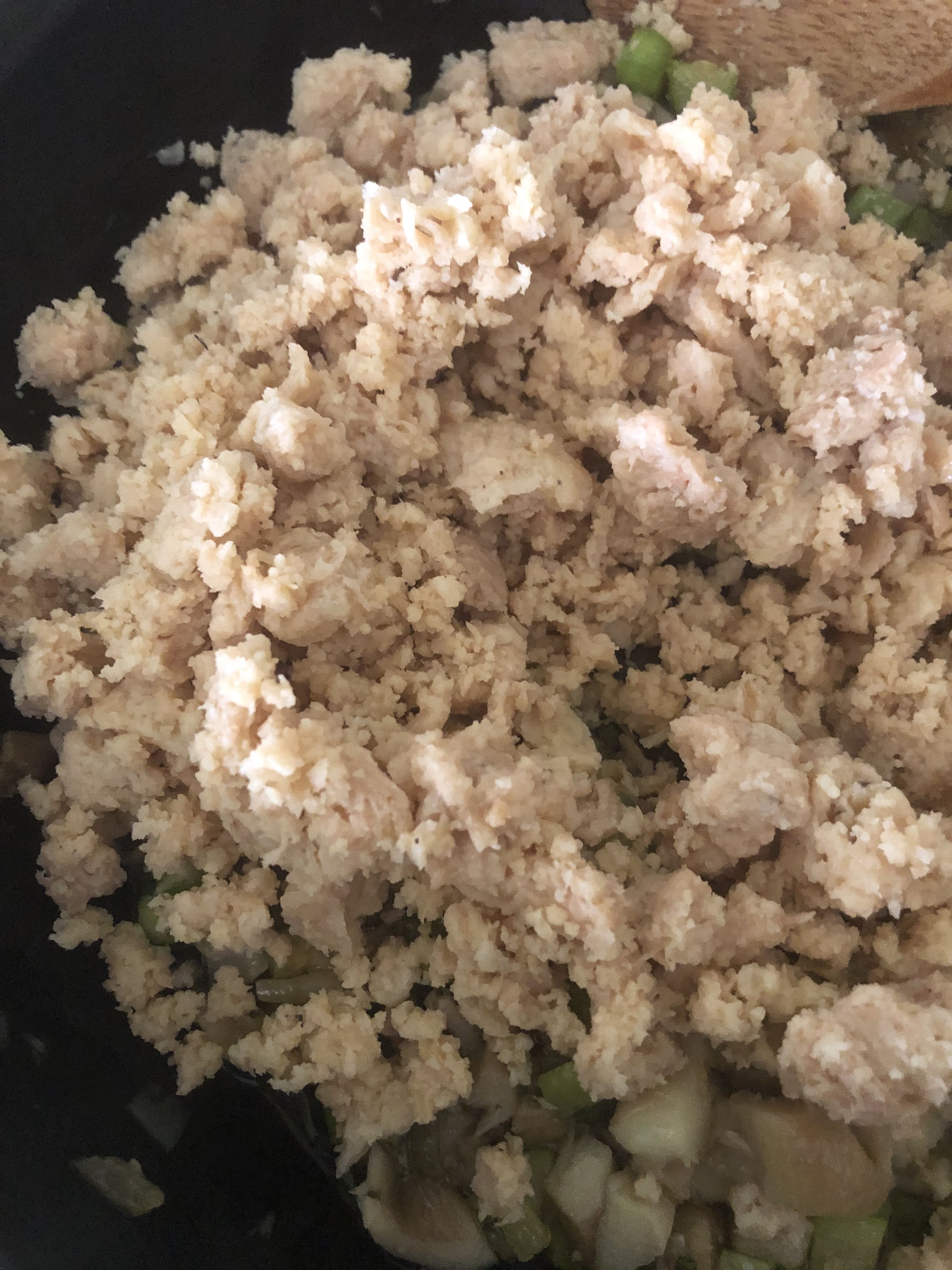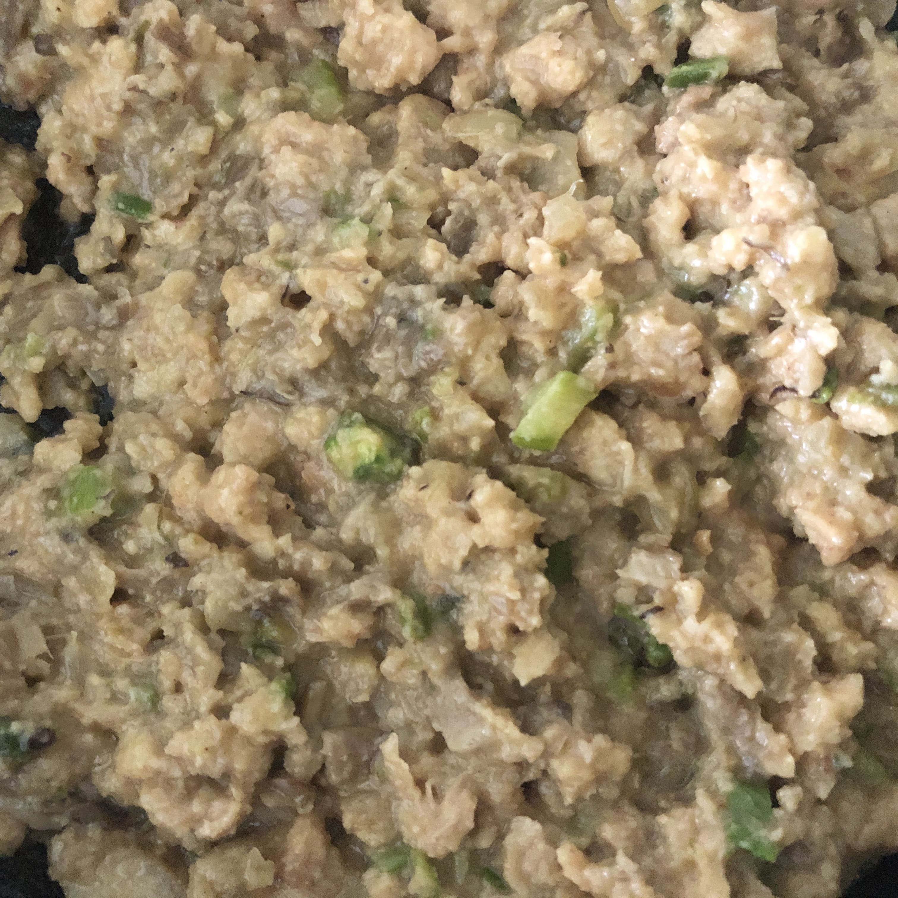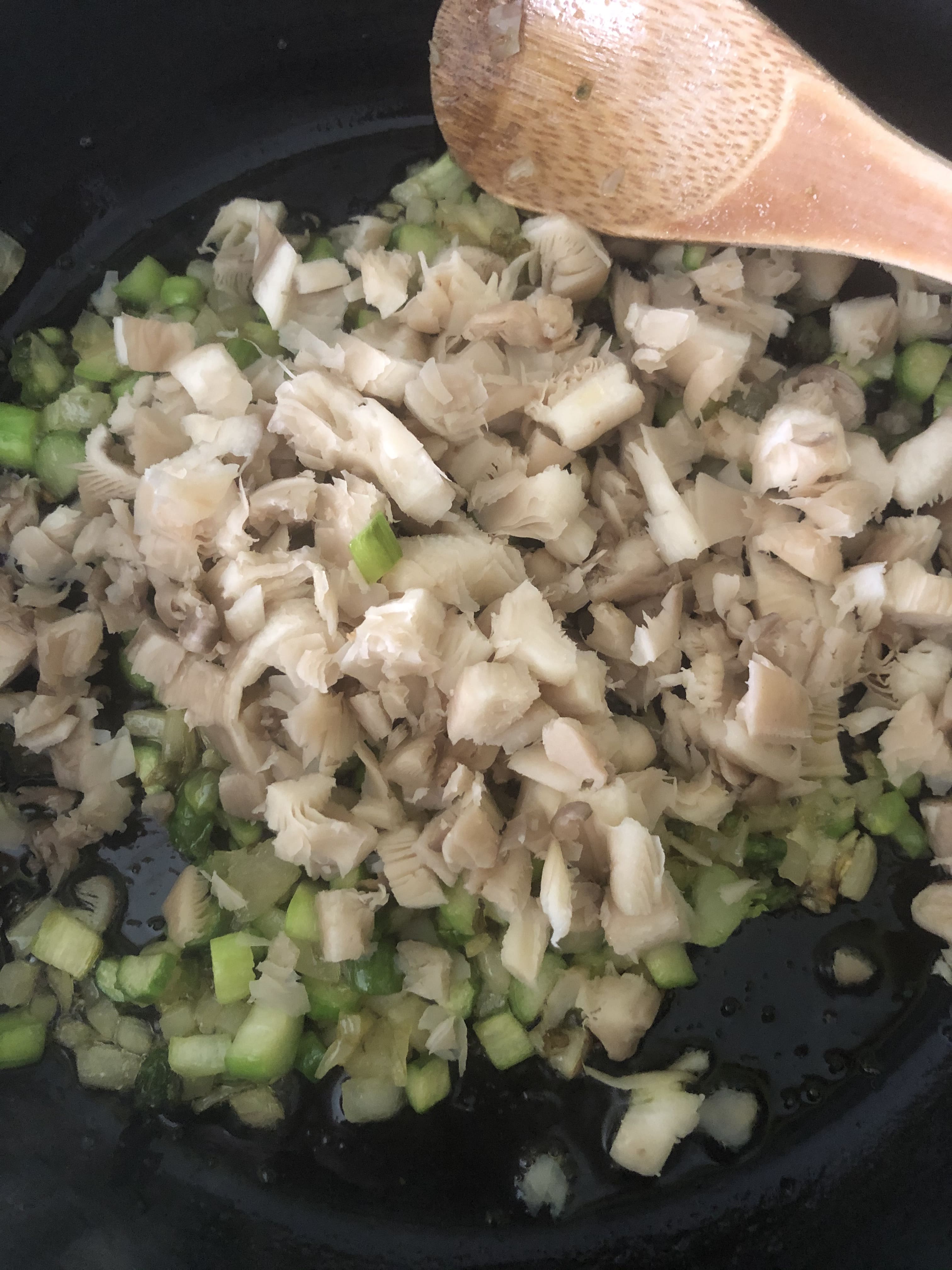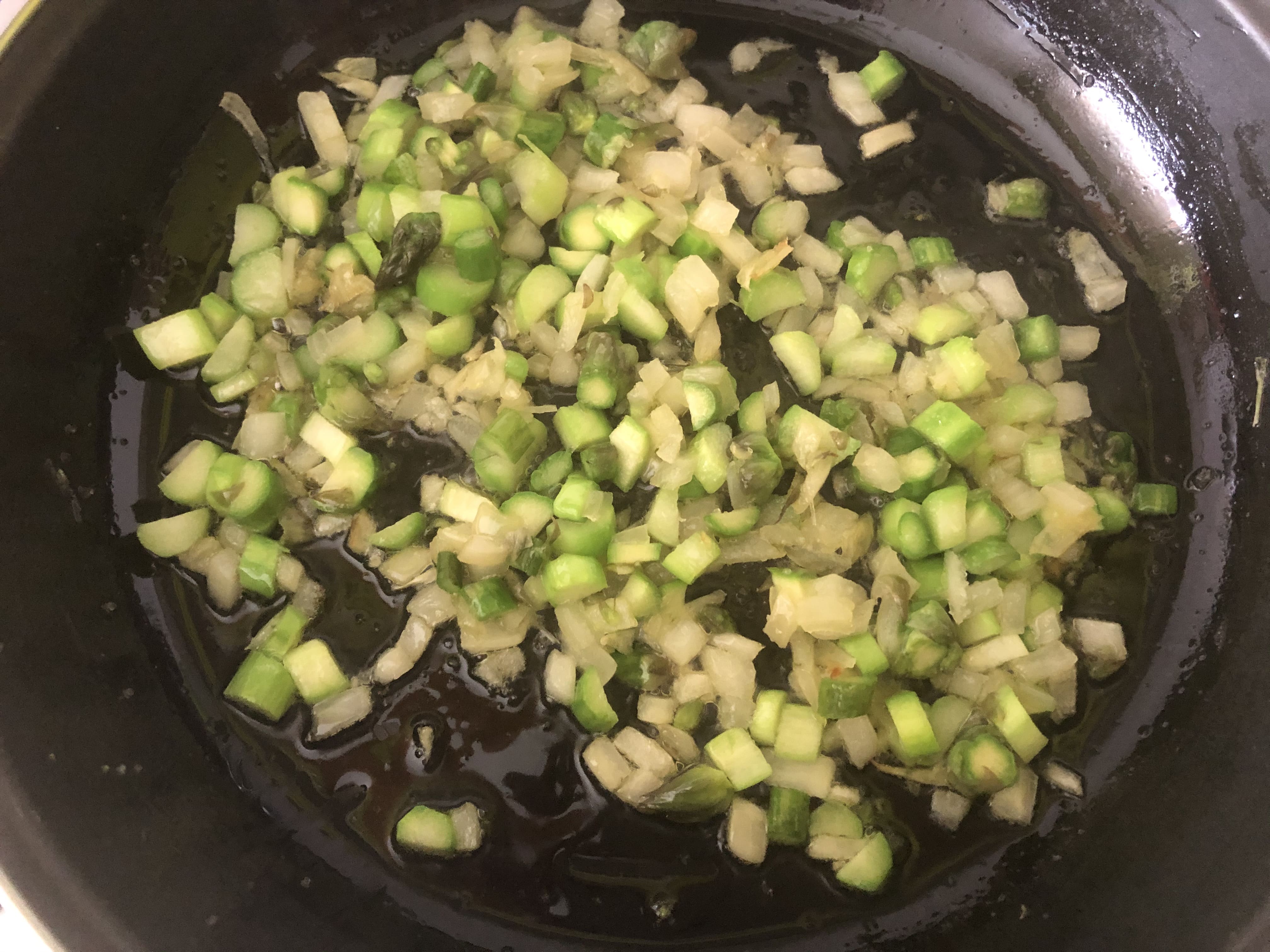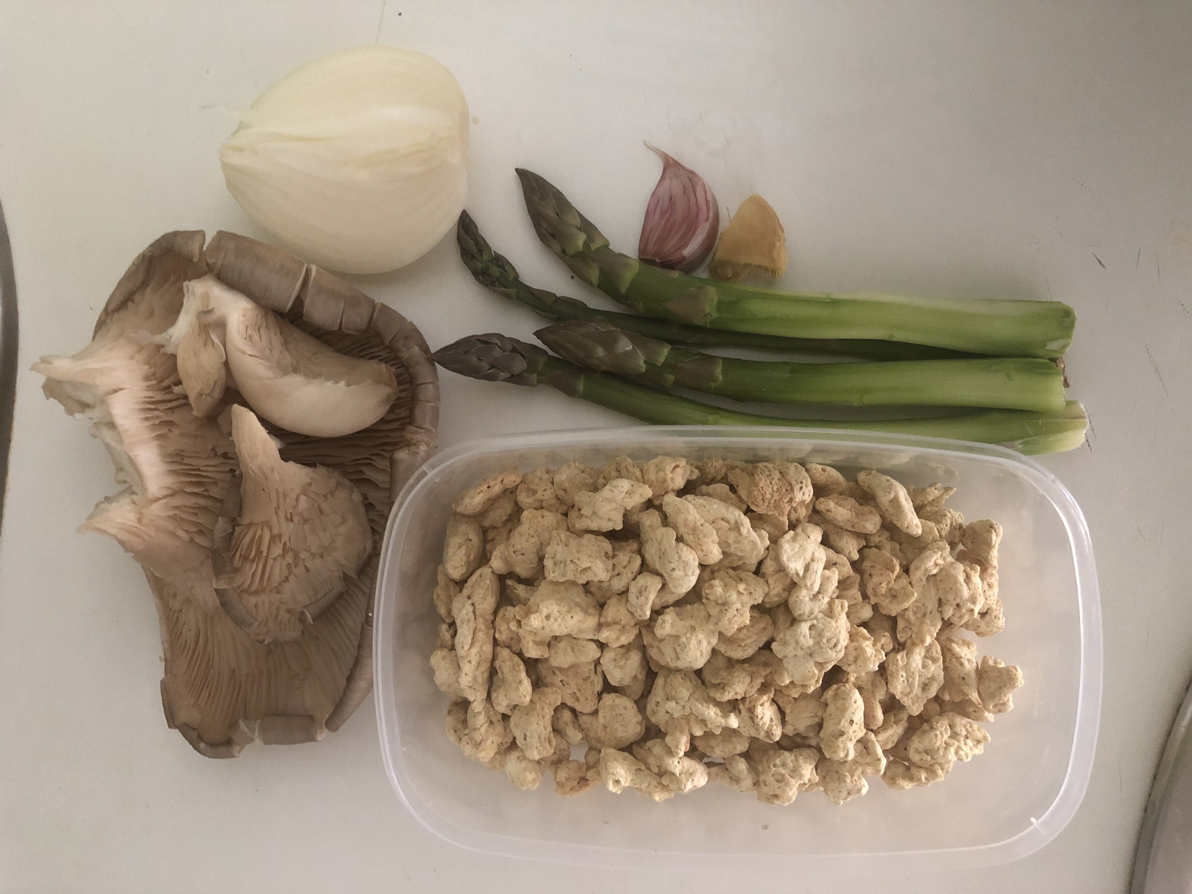 Pon un poco de aceite en una sartén y pocha la cebolla a fuego lento. Cuando empiece a transparentar añade los espárragos cortados en trocitos pequeños y, poco después, las setas, el machado de ajo y jengibre y la soja. Rehoga durante unos minutos. Pasado este tiempo, añade la soja escurrida (yo la he triturado un poco con la batidora porque utilicé soja gruesa y liga peor).