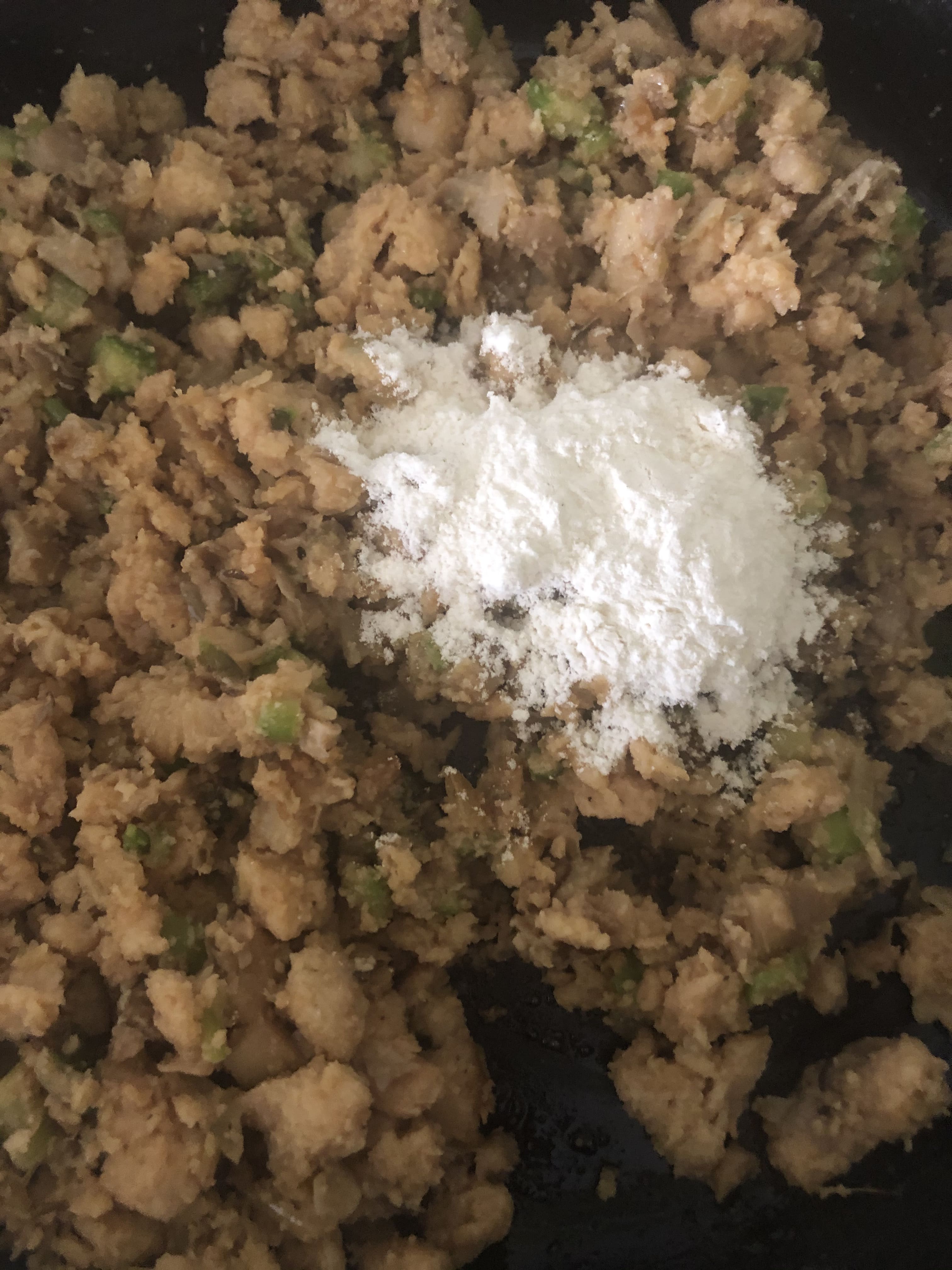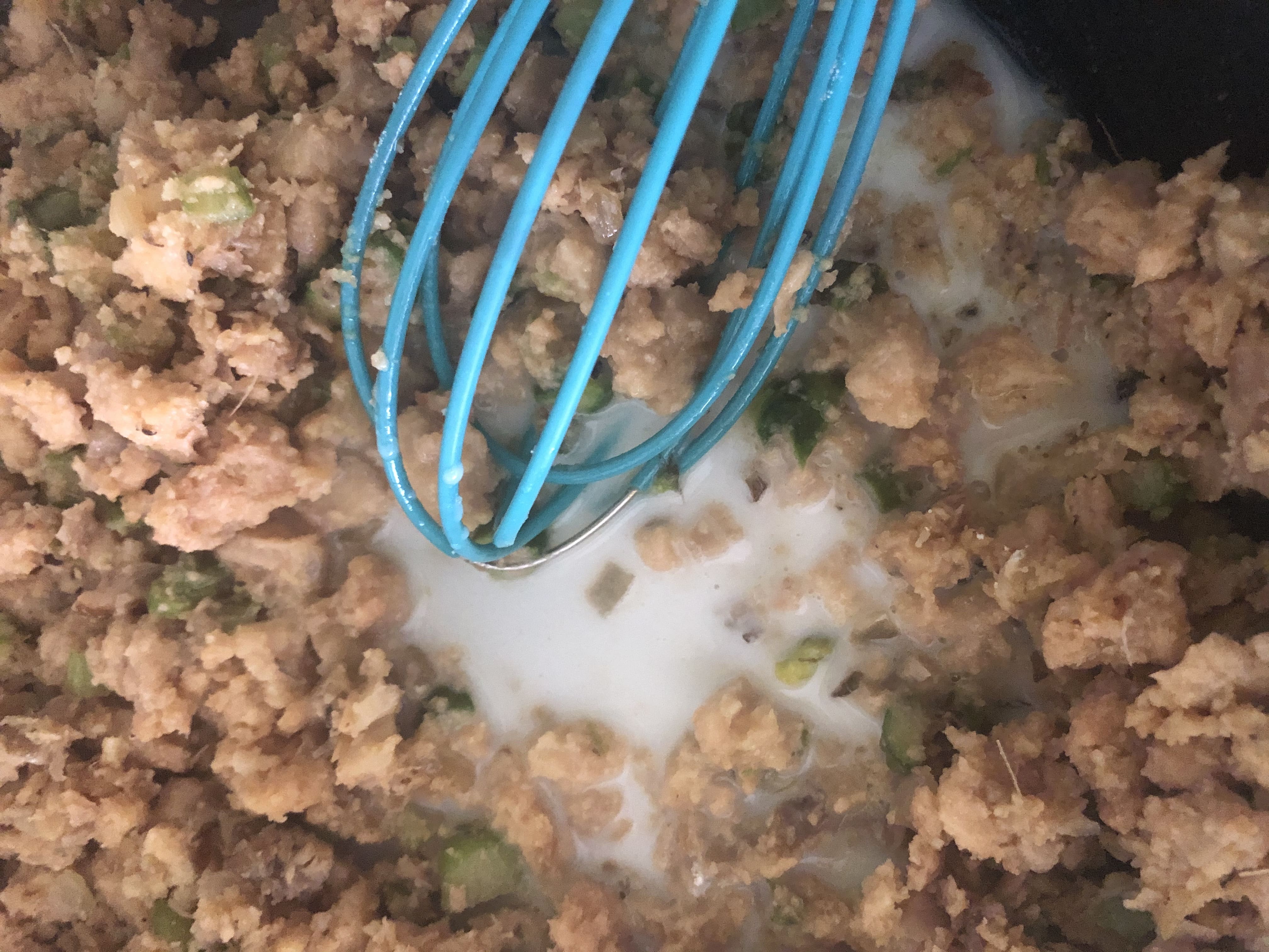Mezcla todo bien y añade la harina de arroz y la leche para hacer una especie de bechamel ligera. Remueve para que se integre y cocina durante un 3-4 minutos. Retira del fuego y deja templar.
